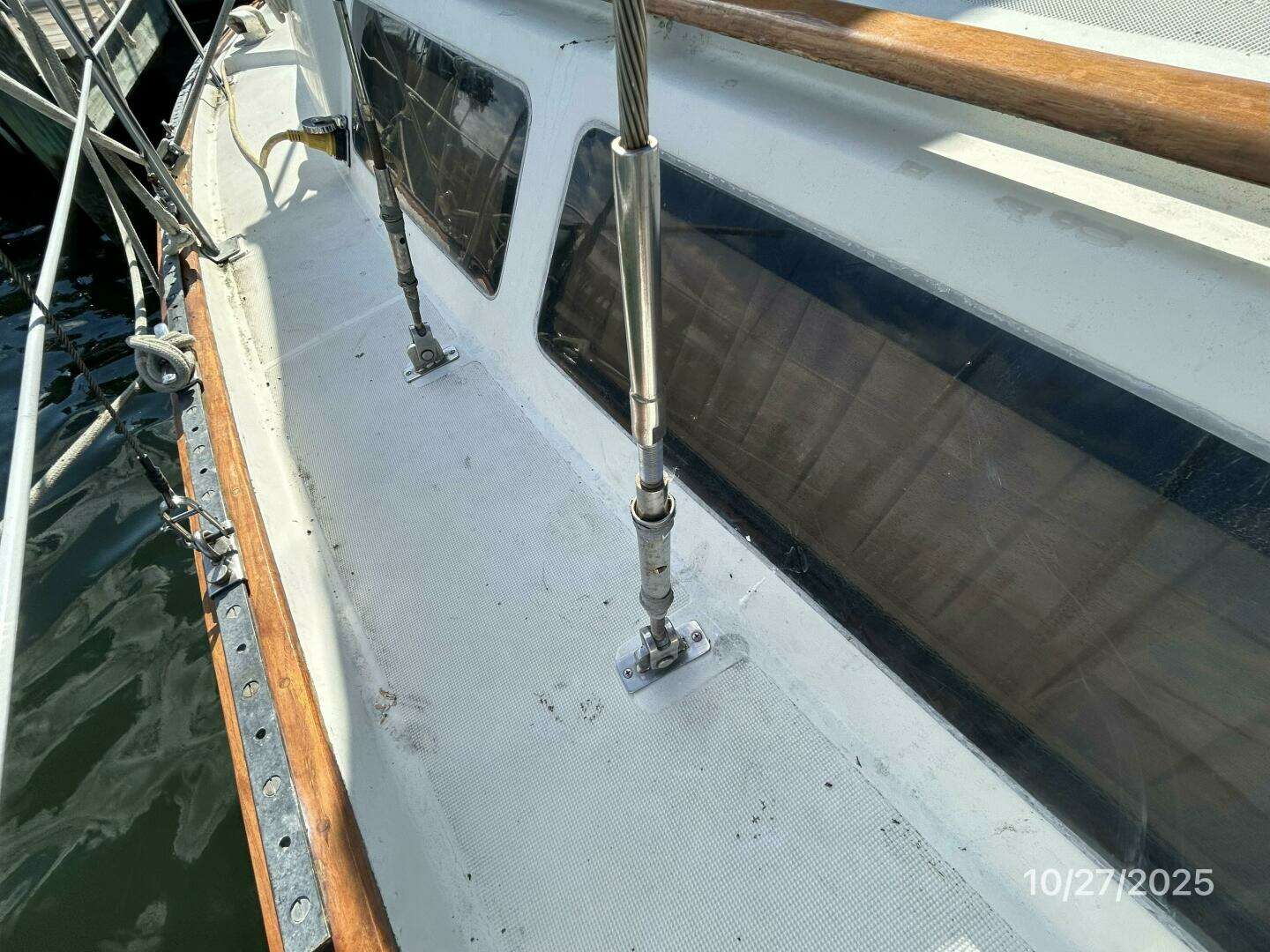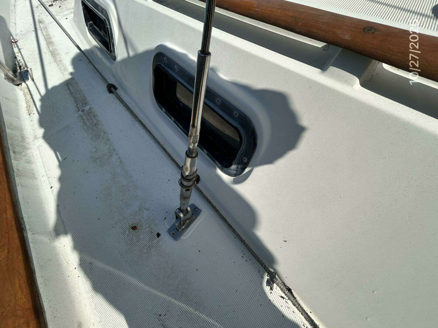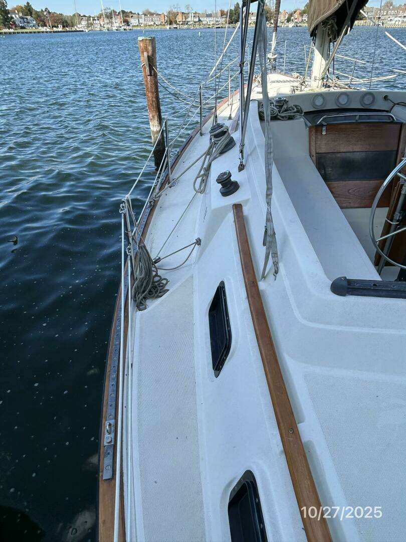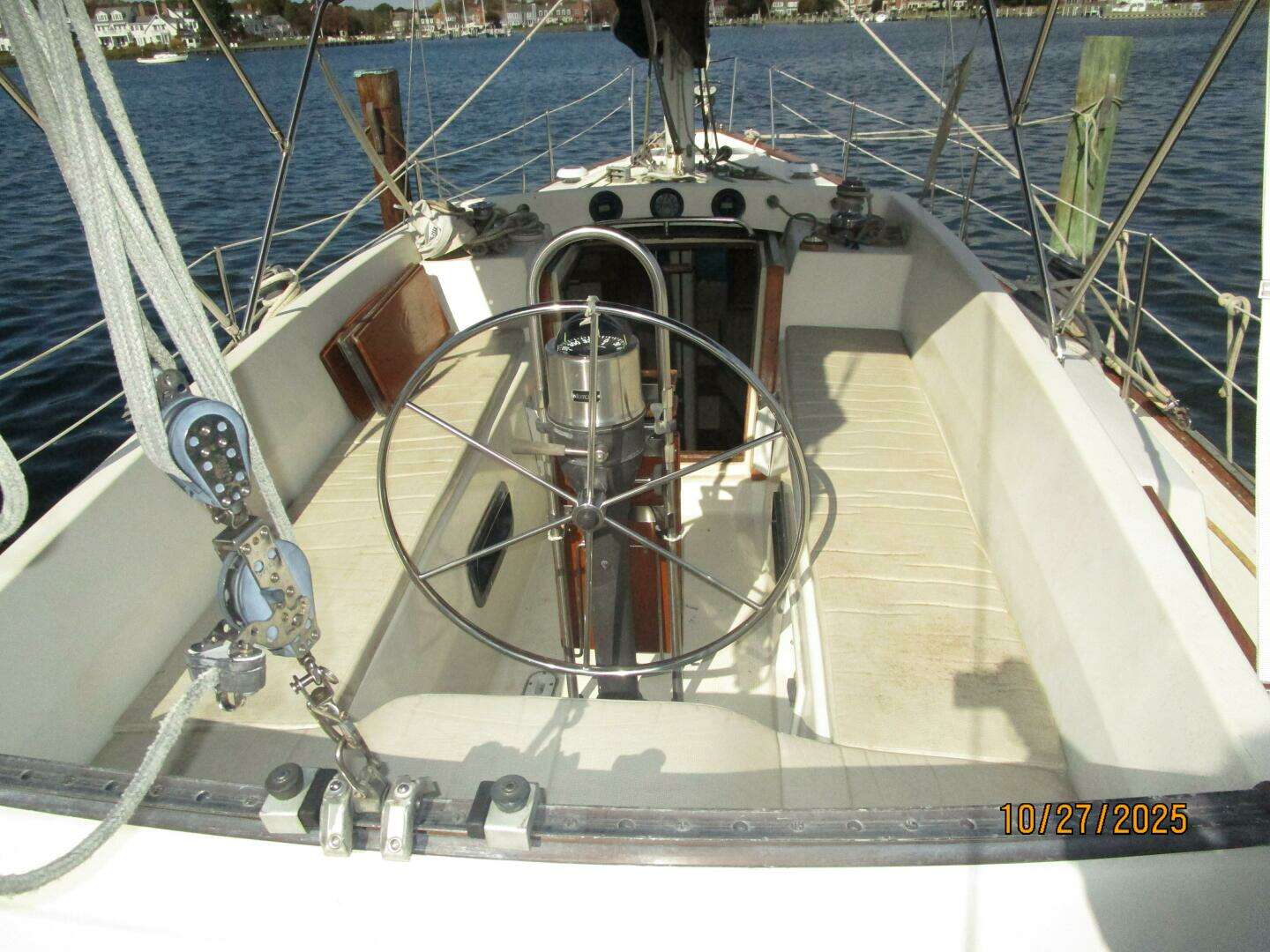 The forward stateroom offers a v-berth with an insert, overhead hatch, 2 portlights, shelves, storage cabinets and a privacy door. The head with 1/2 tub and shower is starboard aft.