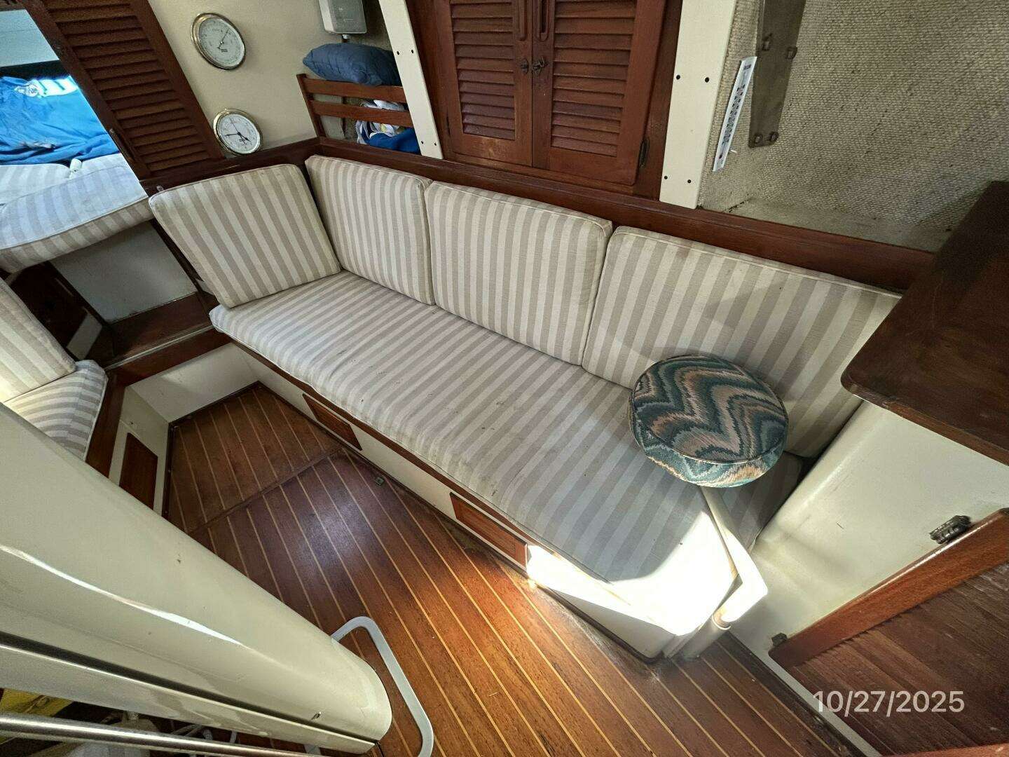 The salon offers a settee with storage under the seating that converts into a single size berth port forward, a benchseat with storage that serves as a single size berth to starboard, storage cabinet starboard aft, 2 portlights with curtains, 4 side windows with curtains, teak & holly sole and auxiliary access.