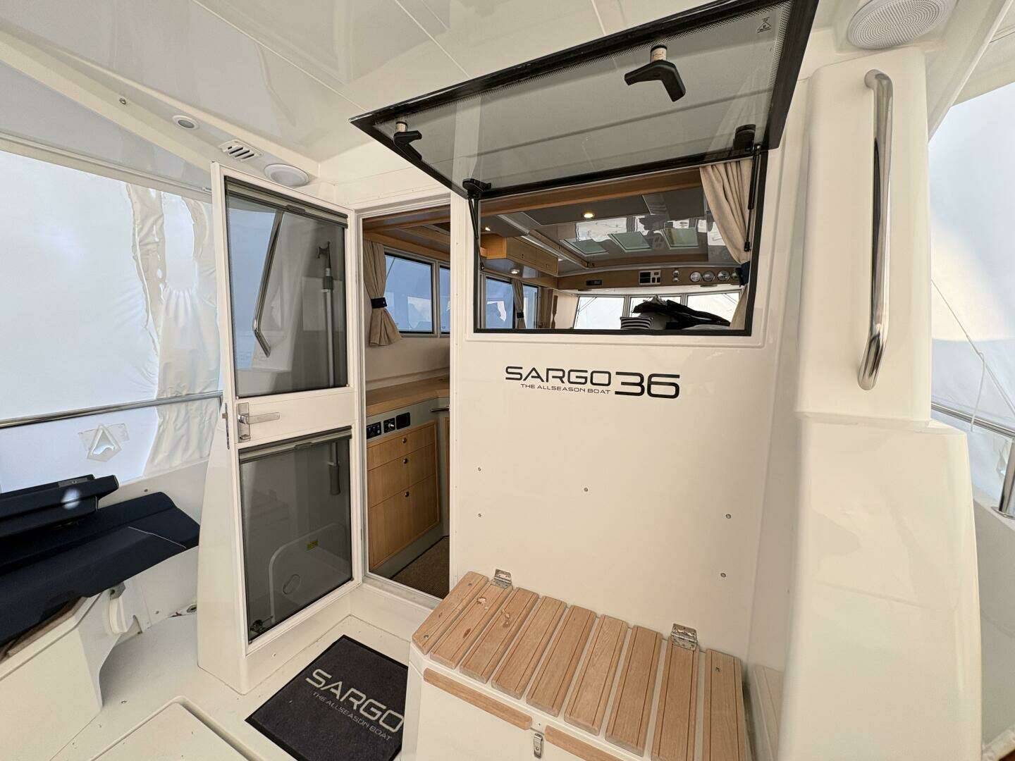 Entering through the aft sliding door, the spacious pilothouse features a galley to port and a raised seating area to starboard. Visibility is excellent, with the ability to open up windows, doors and hardtop in good weather.
