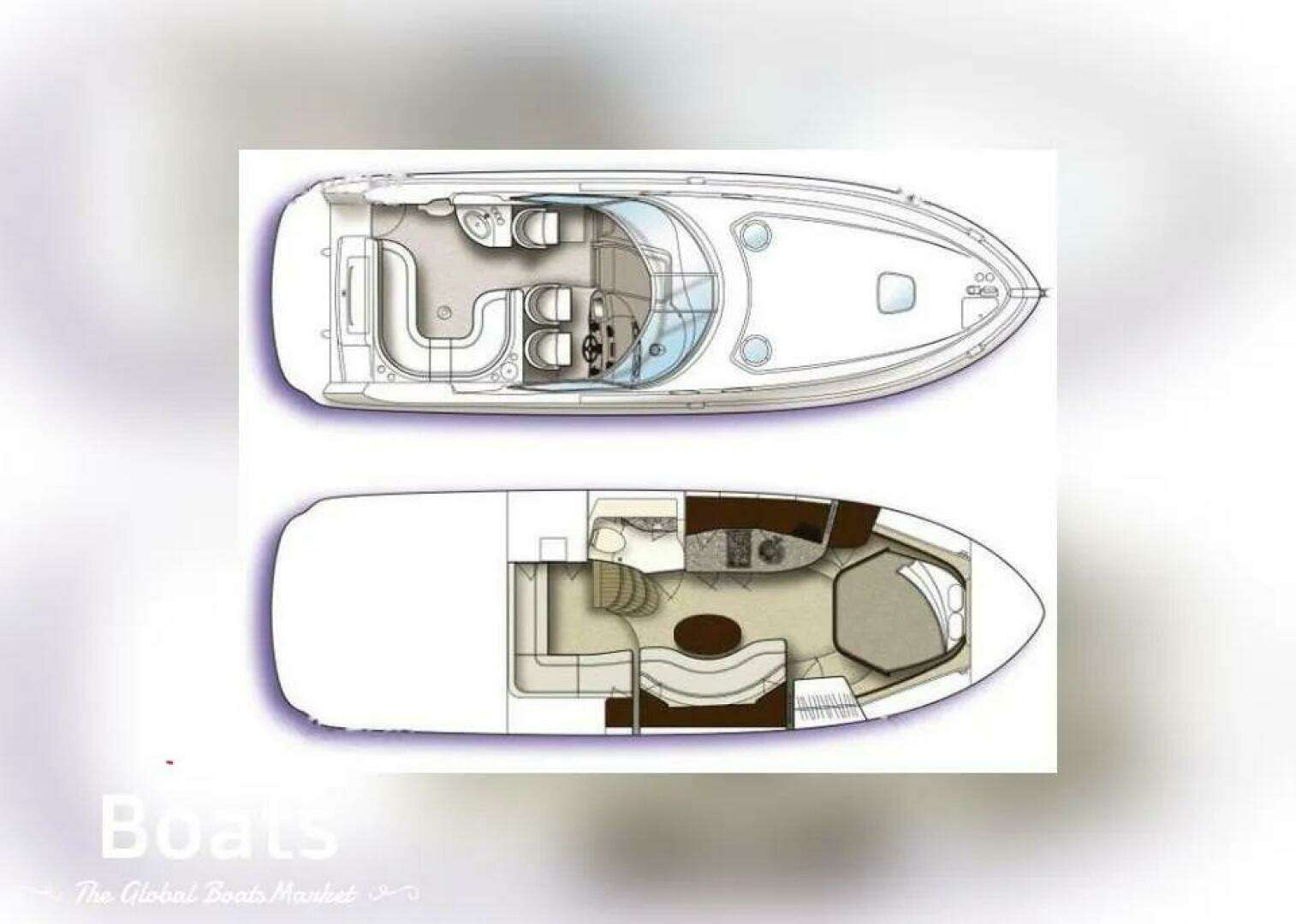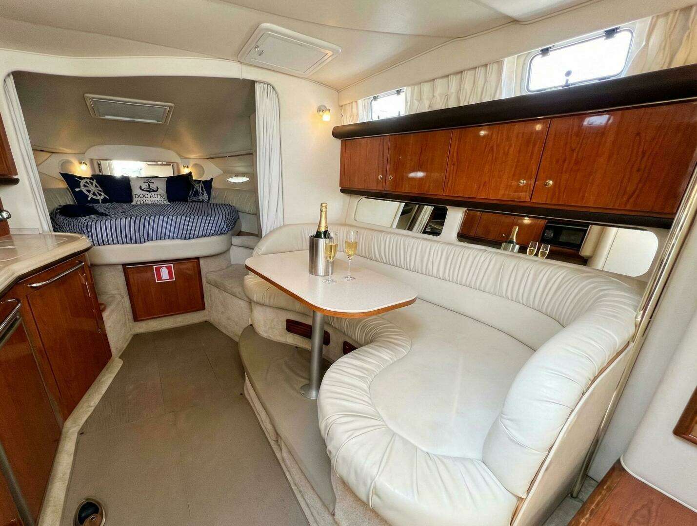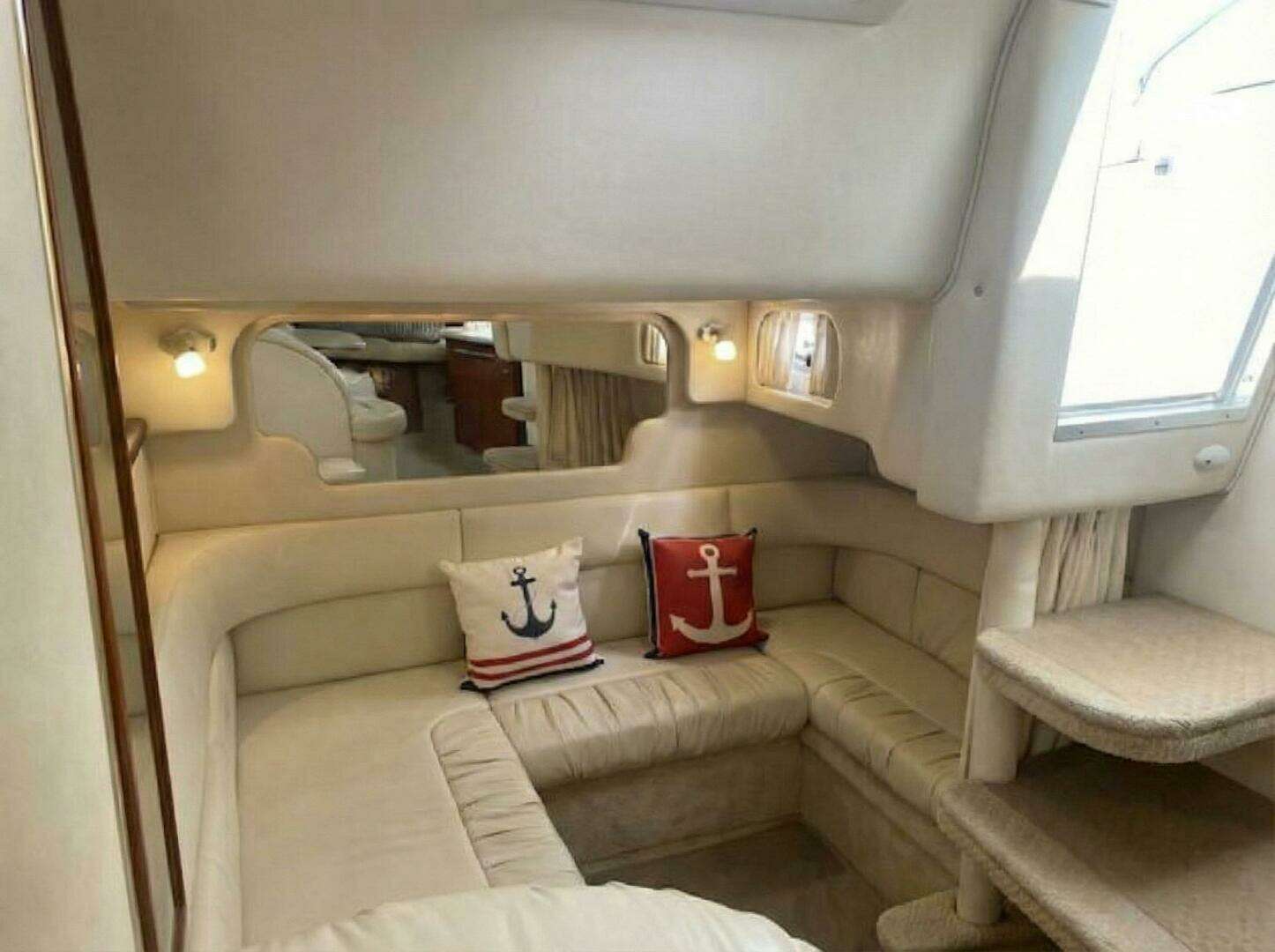 Step below deck on this beautiful 2001 Sundancer 340 and you are immediately welcomed by an expansive, open-concept layout where rich, high-gloss teak cabinetry perfectly contrasts with the deeply cushioned white leather seating. To starboard, a sweeping crescent-shaped dinette provides an elegant space to entertain or share a bottle of champagne, sitting just opposite a fully equipped portside galley featuring smooth, solid-surface countertops, a flush-mount electric stove, a deep stainless steel sink, a wood-paneled under-counter refrigerator, and built-in appliances. When it's time to retire, the forward V-berth offers a luxurious island-style bed bathed in natural light from the overhead deck hatch, complete with mirrored bulkheads that enhance the bright, airy atmosphere. Aft, a cozy, sunken U-shaped conversation pit serves as the perfect mid-cabin lounge by day and seamlessly converts into a private double berth for overnight guests. Meticulously appointed and flooded with warm ambient lighting, this cabin delivers all the premium comforts you could dream of in such a small package.