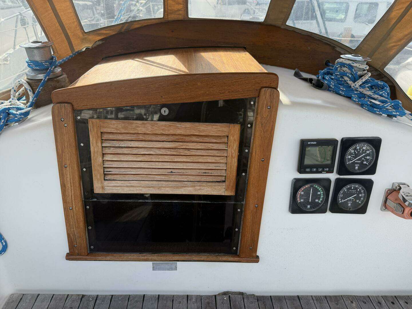 Spirit’s electronics and navigation gear include an Autohelm 3000 autopilot (with a spare unit), Nexus wind data instrument, Lowrance X25 sounder, and Horizon Eclipse VHF radio. She also carries a Simpson Lawrence Sea Tiger manual two-speed windlass with a Bruce anchor, 50’ of 3/8” chain, and 220’ of 5/8” three-strand rode.
