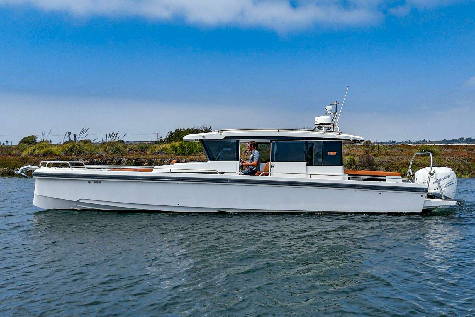 Axopars hulls are designed harbor cruising and running offshore. The 37 Performs very well and is fuel efficient at cruising speed. The 37 allows you to travel at speed in a quiet comfortable environment with a great 360-degree visibility.