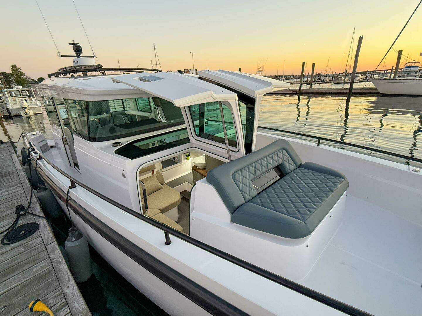Martha Ellen is an impressive example of the Axopar 37 cabin with aft cabin, very clean and well-equipped, and the only 37XC for sale in the Northeast US with an aft cabin and Mercury JPO Joystick Piloting. She's powered with twin Mercury Verado v8 300 hp engines with only 398 hours and has the best layout for cruising with the aft cabin, kitchen module, extended storage in the forward cabin and gull wing doors. Martha Ellen has been kept in indoor heated storage in the winters. Hightlights include: