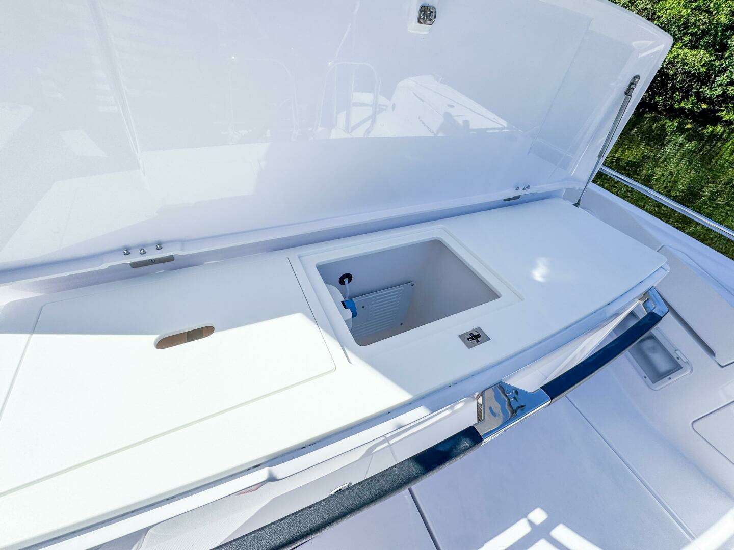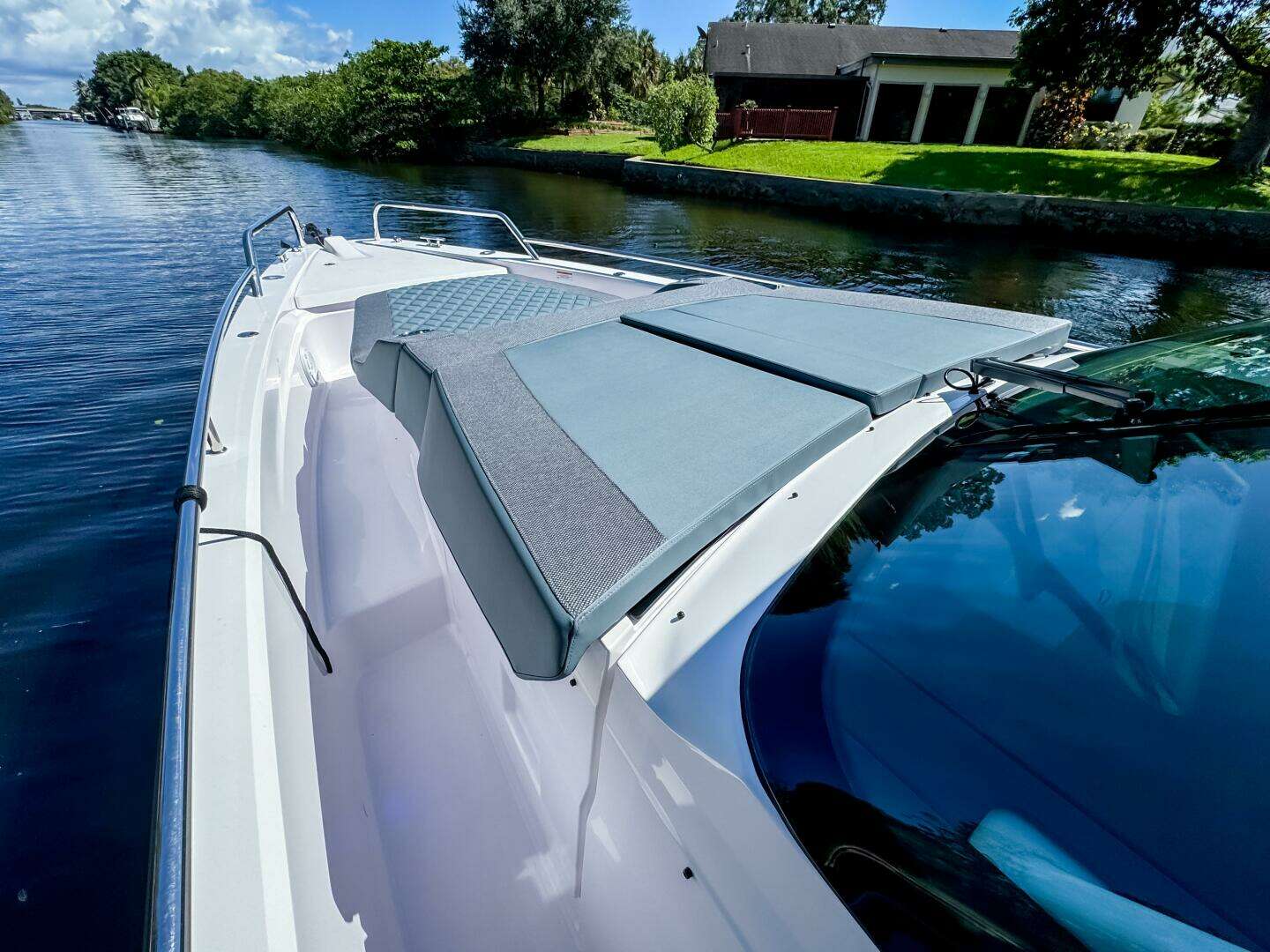 - Fixed sunbed on front deck with storage, Silvertex (Included with Med Package)