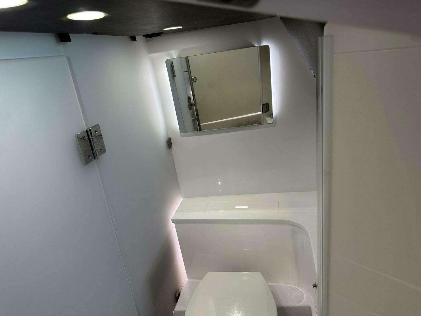 - Comfortable cabin with standing headroom, double berth (sleeps 2), enclosed head/shower, and clever storage throughout