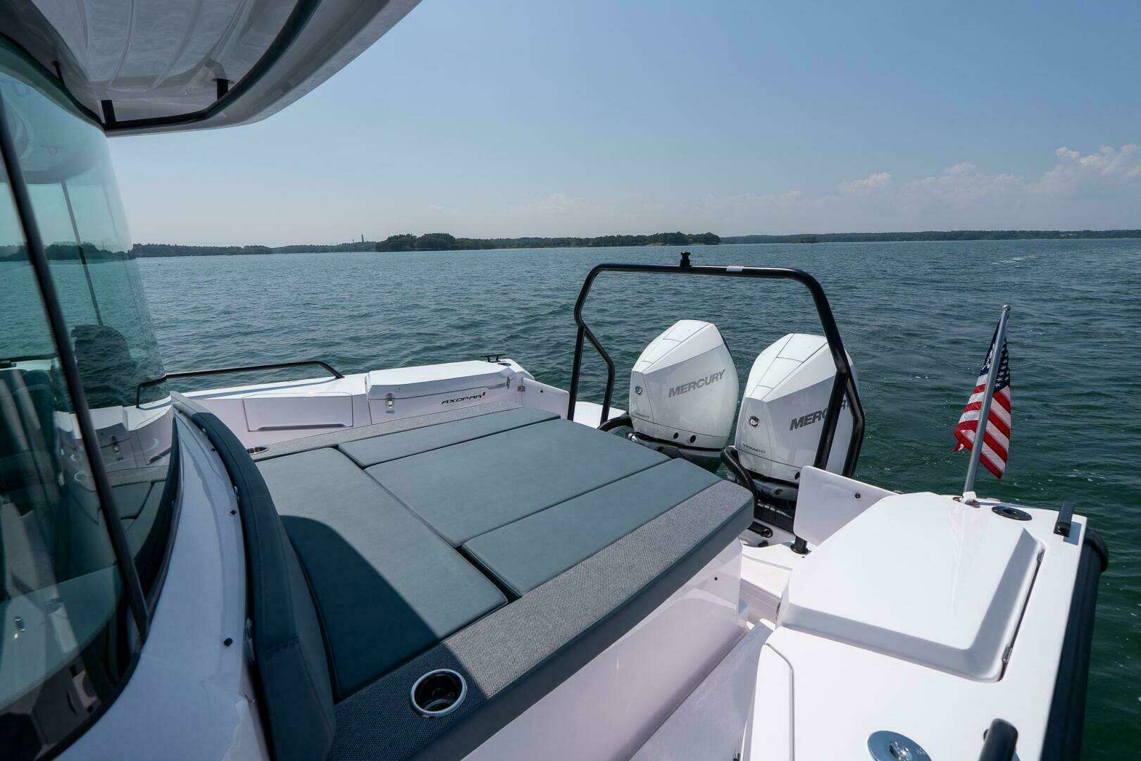 This Axopar 37 U-Sofa will be available May 2026! She's equipped with Joystick docking, along with twin 300hp Mercury V8 Verados on for a total of 600hp.
