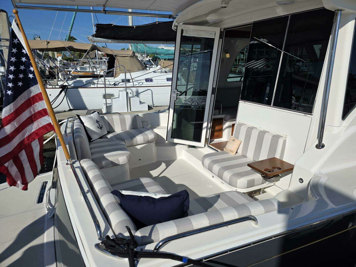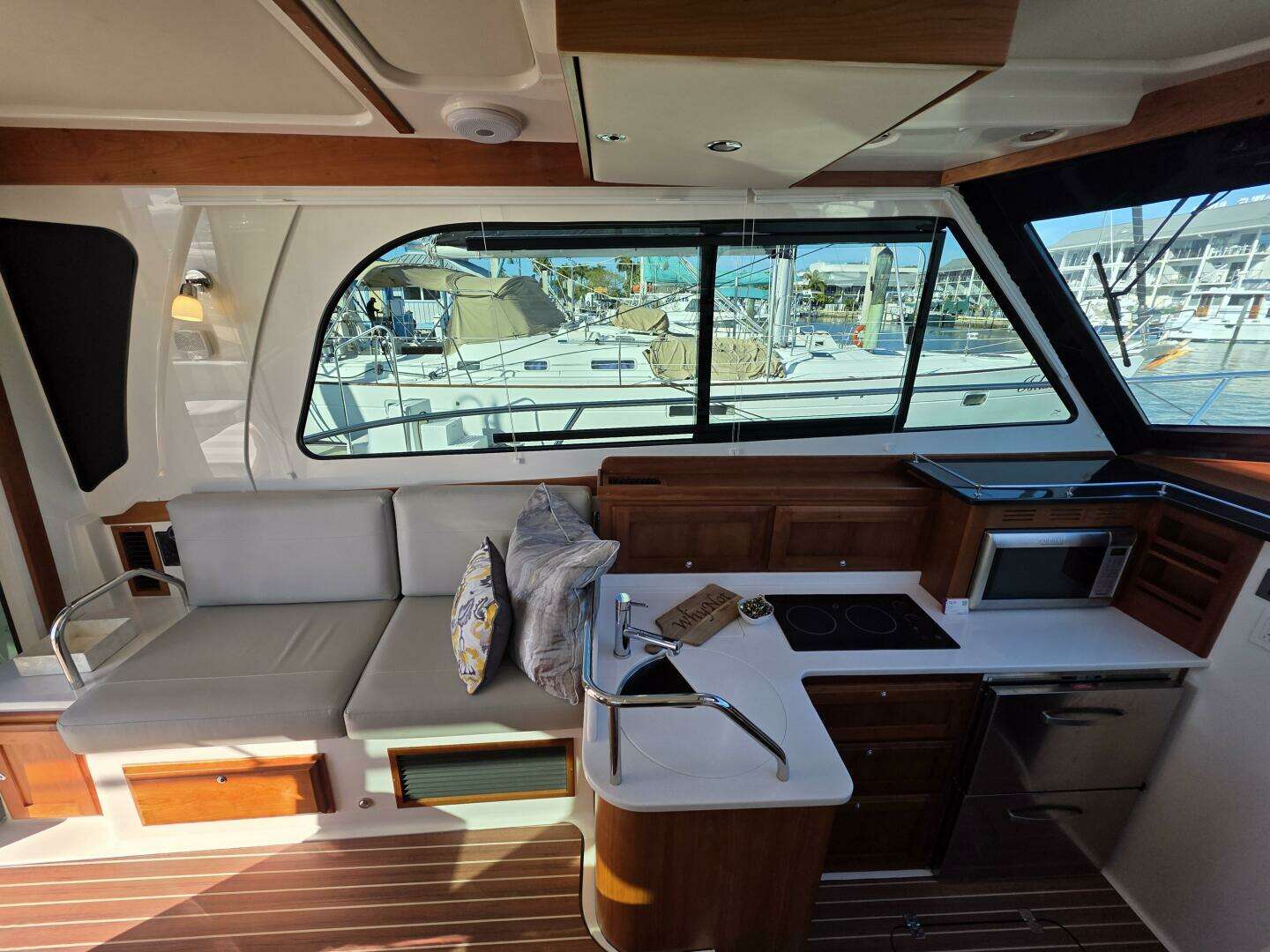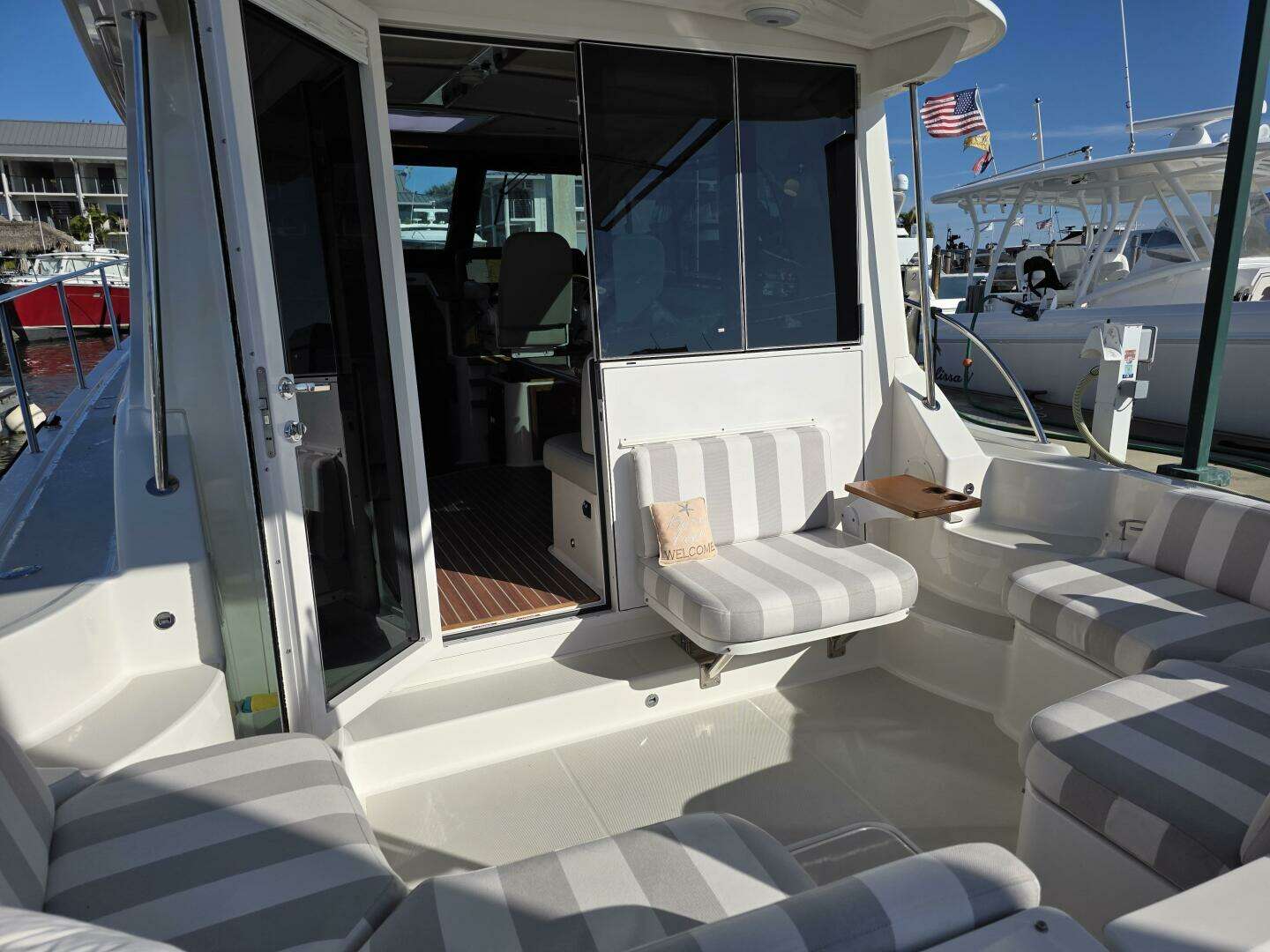 - A new aft-facing cockpit seat to starboard, complete with a folding armrest and drink holder, paired with a new salon door to port with a bi-fold window to starboard (above the aft-facing seat).