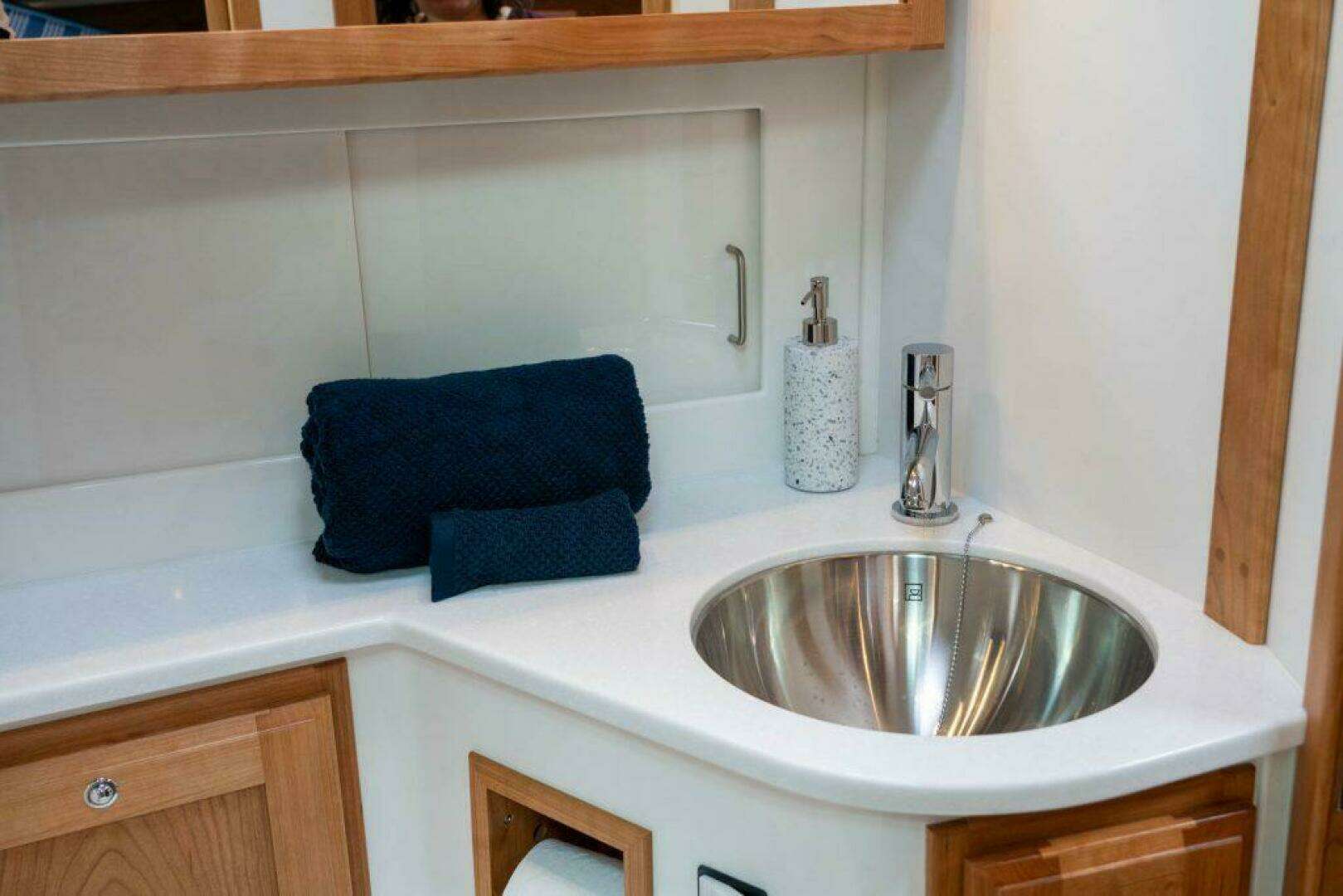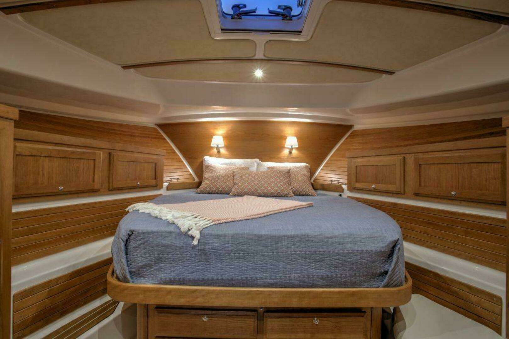 In the master stateroom there is an island berth for ease of egress, and for stowage of owner's gear, plus two lockers and multiple drawers. To starboard aft of the master is a full guest cabin with double berth and plenty of storage capacity. Opposite and to port is a large head unit with separate stall shower.