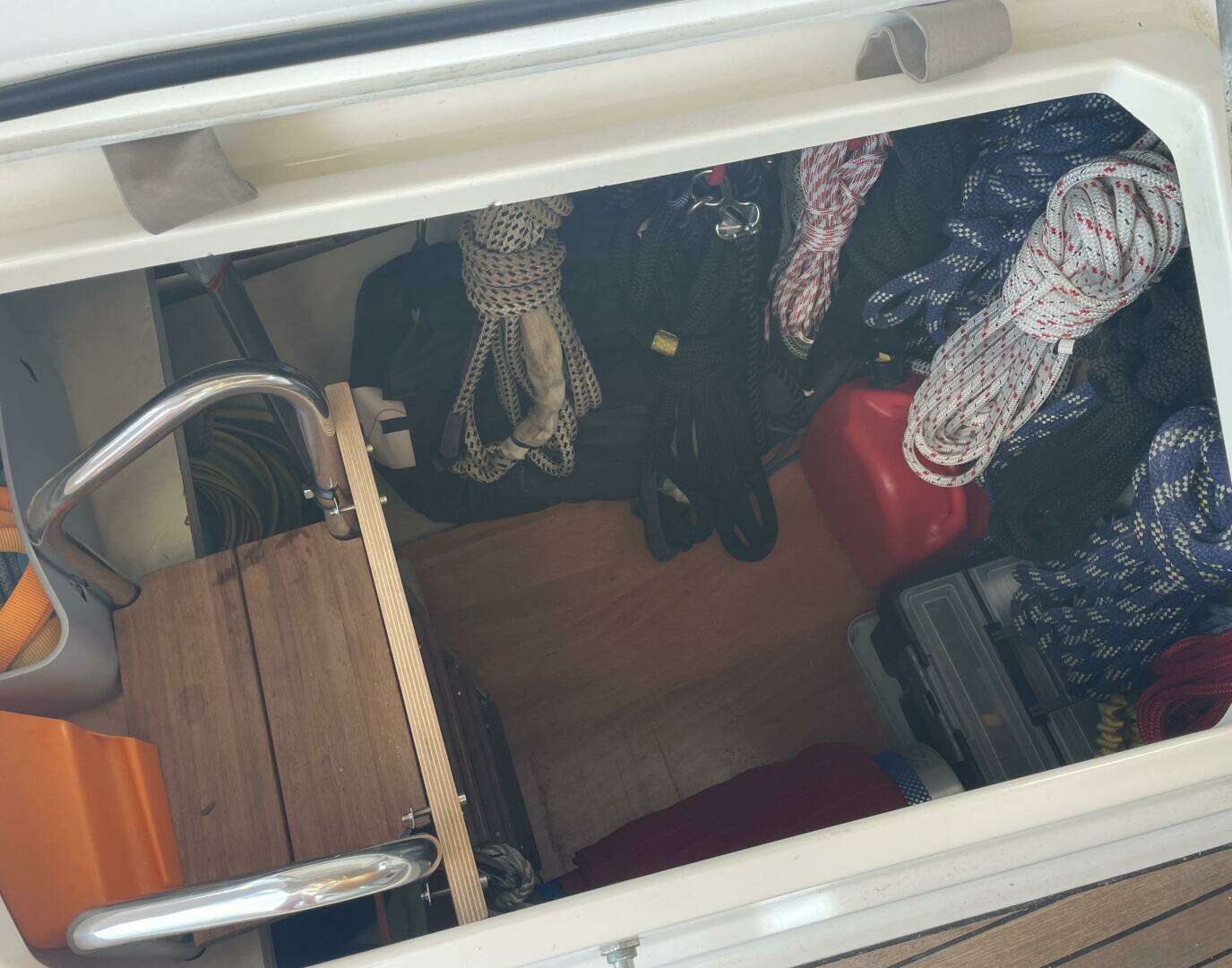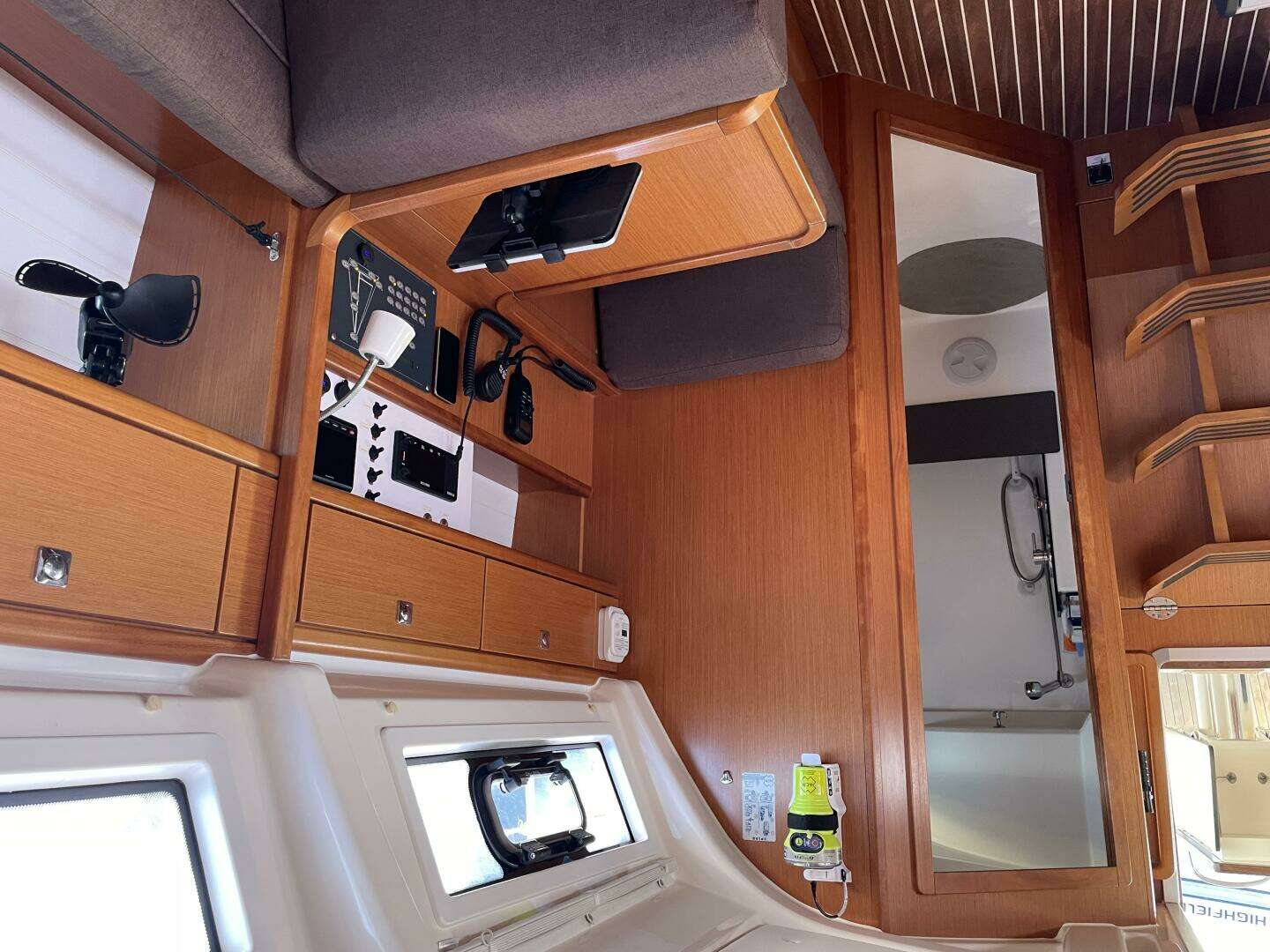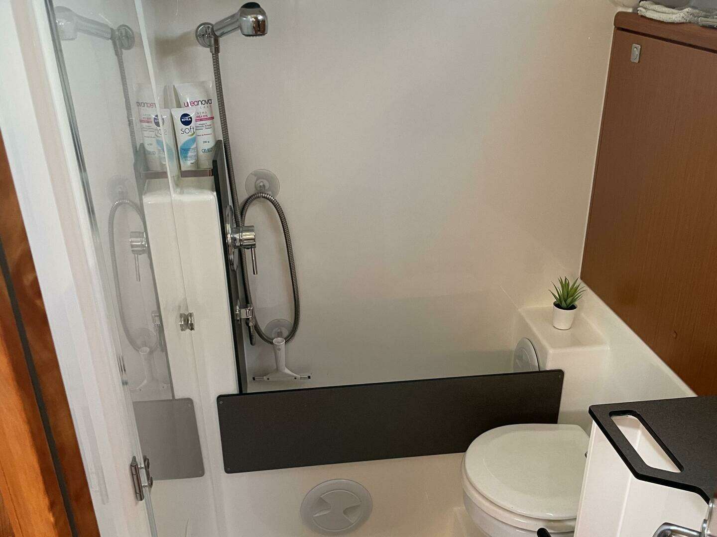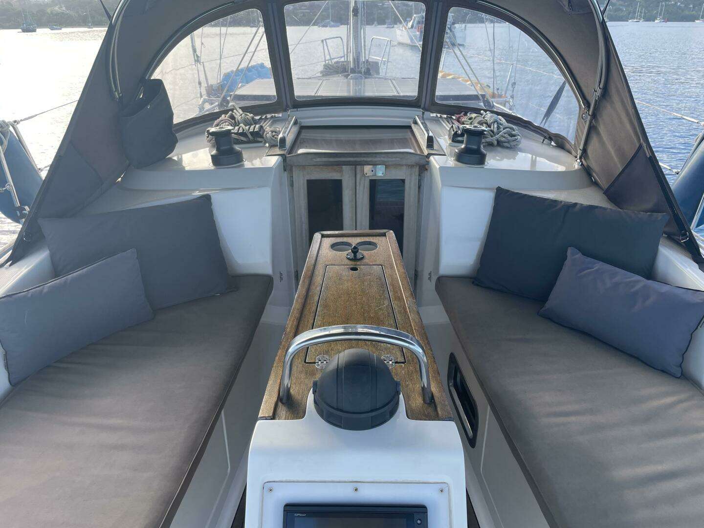 Combining performance, comfort and ease of handling, this sought-after two-cabin owner’s layout delivers a spacious forward master cabin, a generous aft double cabin, a bright and airy saloon, an L-shaped galley, and a well-appointed head with separate shower. Excellent ventilation is assured with multiple opening hatches and fitted fans, making her ideal for tropical cruising.