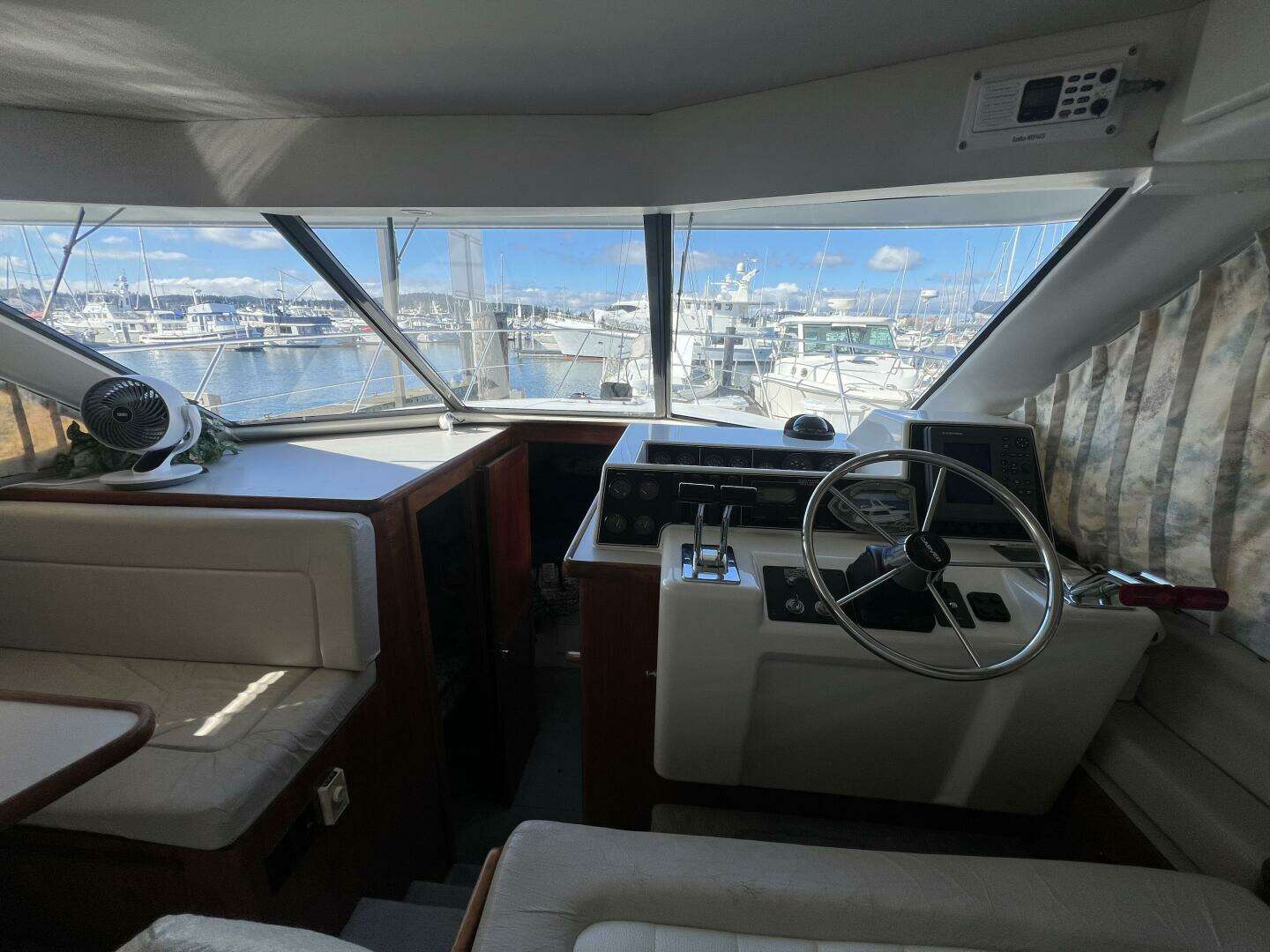 Inside, you’ll find a bright and inviting salon with large windows that flood the space with natural light. The open layout flows seamlessly into a fully equipped galley featuring generous counter space, abundant storage, and reliable appliances—perfect for weekend getaways or extended cruising.
