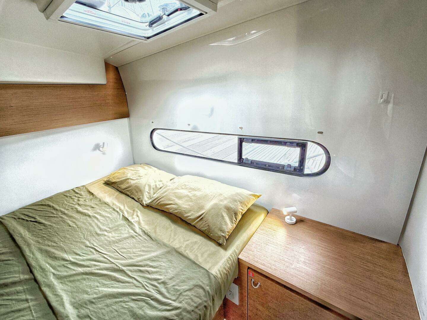 The Excess 11 features dual helm stations aft on each hull, providing excellent sail visibility and a direct connection with the cockpit and crew while keeping the main living area open and spacious. Steering via Dyneema cables ensures a responsive and direct feel. The interior is remarkably bright for her size, with large hull windows and a three-cabin layout dedicated to comfort. The starboard hull houses a luxurious master suite with a generous 2m x 2m bed, while the port aft cabin offers an equally impressive berth.