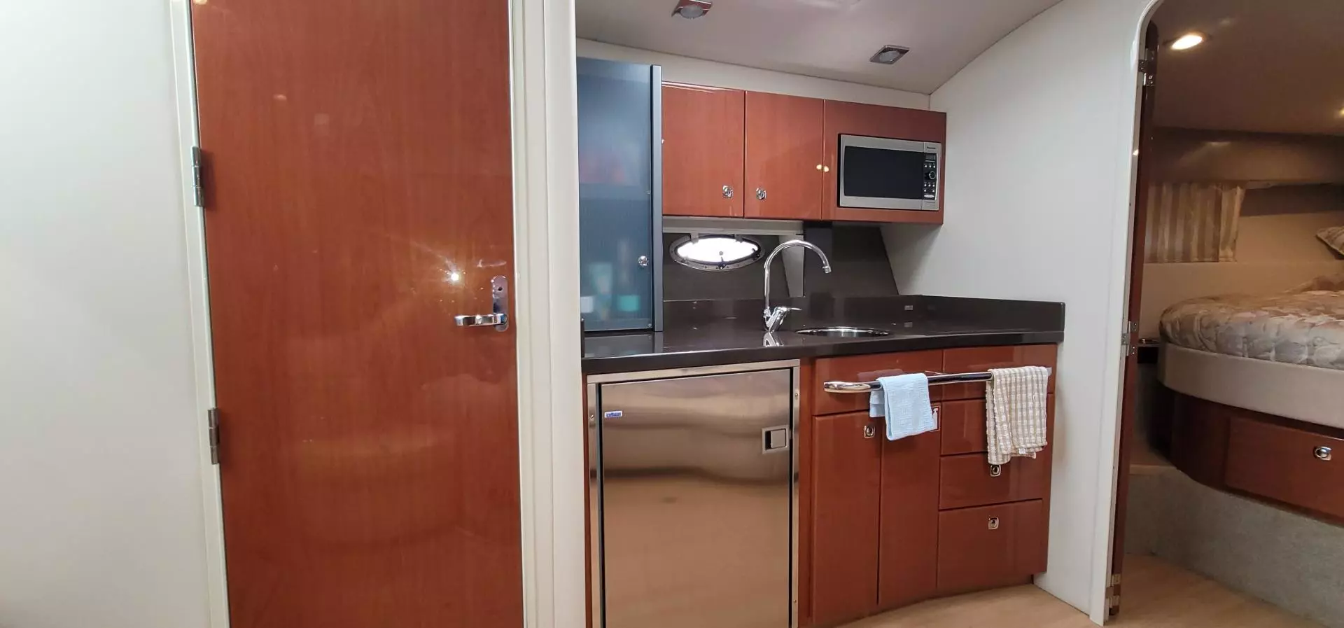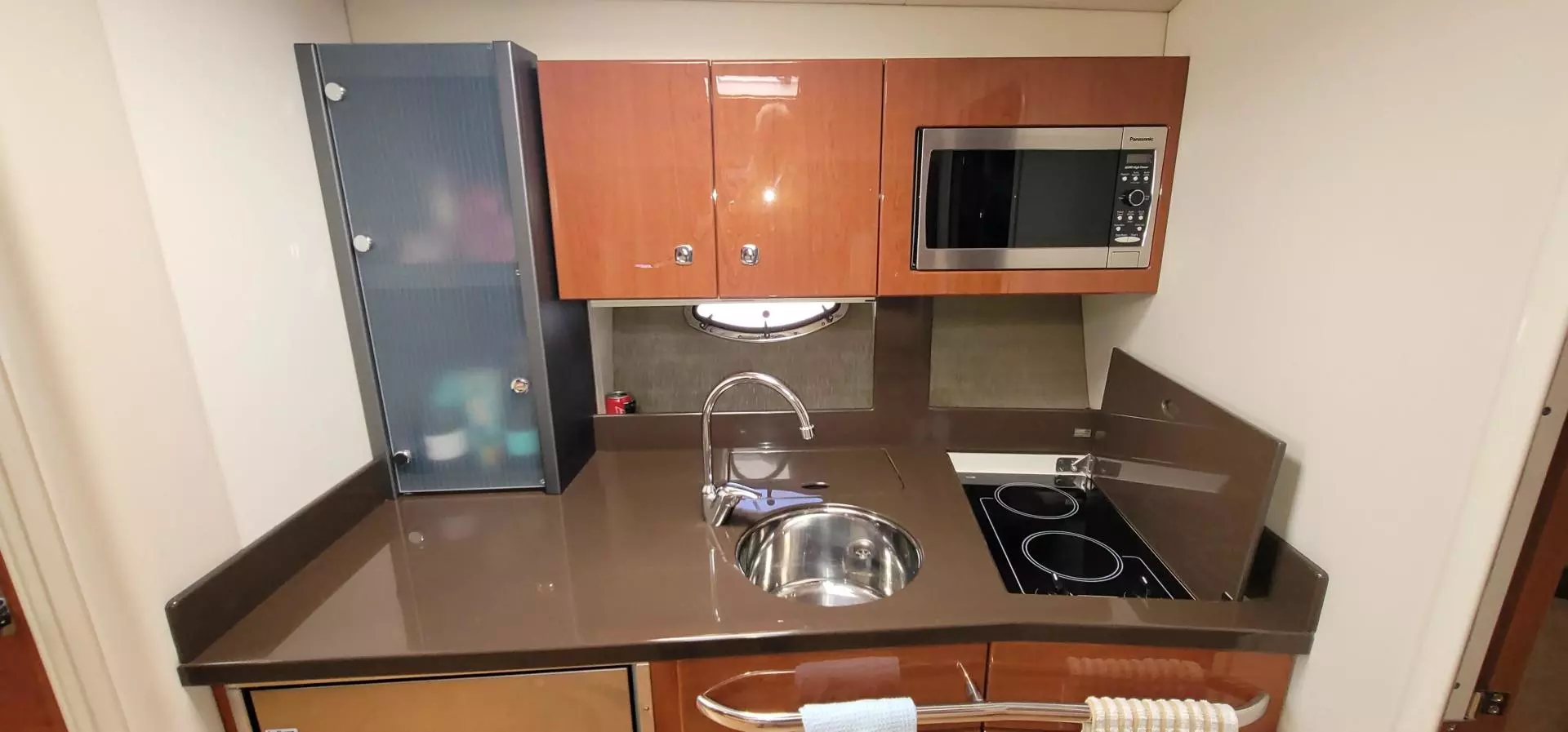 - Complete galley in high-gloss Deep Cherry finish w/storage and hardwood dovetailed drawers, full Corian countertop, beverage center, polished stainless steel sink, concealed 2-burner electric stove w/safety shut-off switch, 120V/12V stainless steel refrigerator, Krups® coffee maker, microwave oven & concealed in-counter trash container