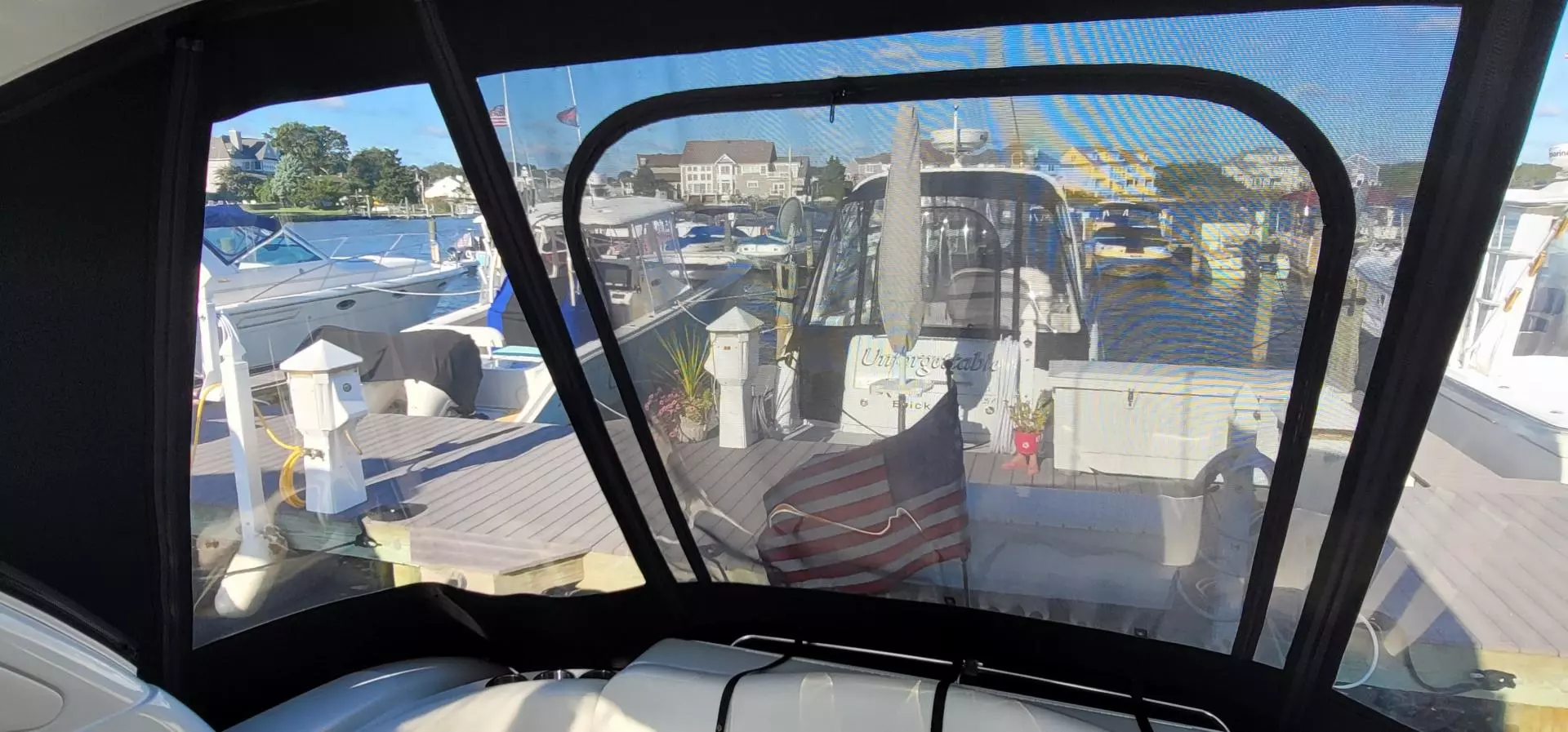 - Bimini top, front & side curtains w/easy-mount zipper connectors & extended aft cockpit enclosure in color-coordinated non-fading Sunbrella® acrylic fabric w/SeaMark™ vinyl undercoating