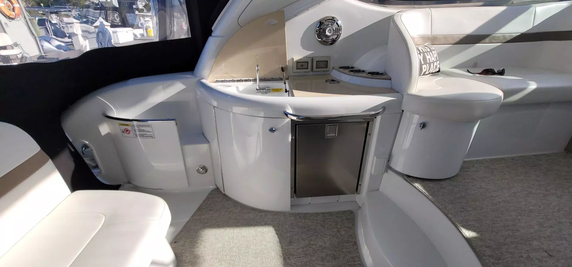 - Aft U-shaped lounge seating w/fiberglass-lined storage, two dual-height tables & sunpad inserts