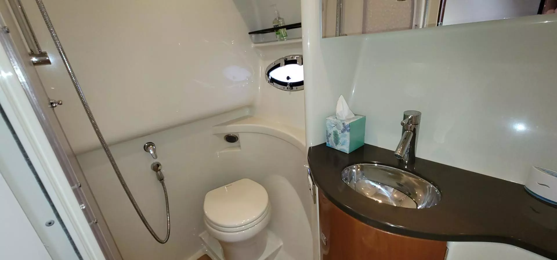 - Molded private head compartment w/molded vanity, lower doors in high-gloss Deep Cherry finish, Corian counter, polished stainless steel sink w/swivel faucet, VacuFlush® unit w/holding tank & dockside pumpout, separate stall shower w/hinged acrylic door & exhaust fan
