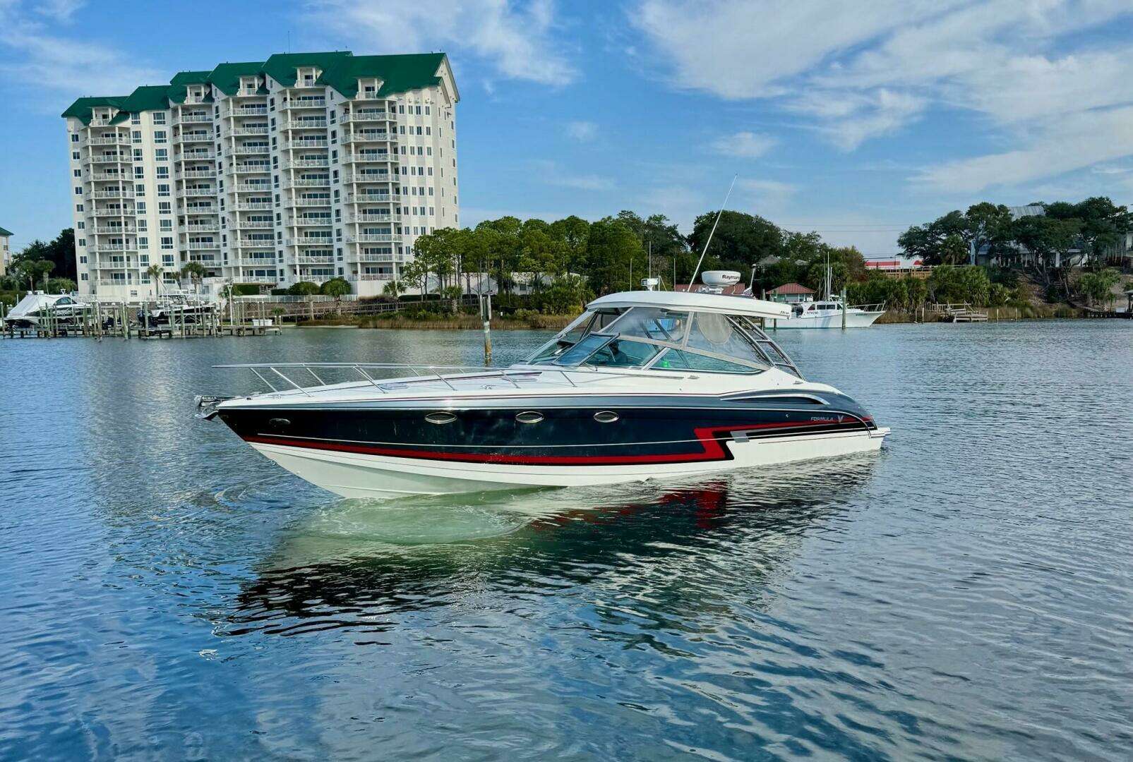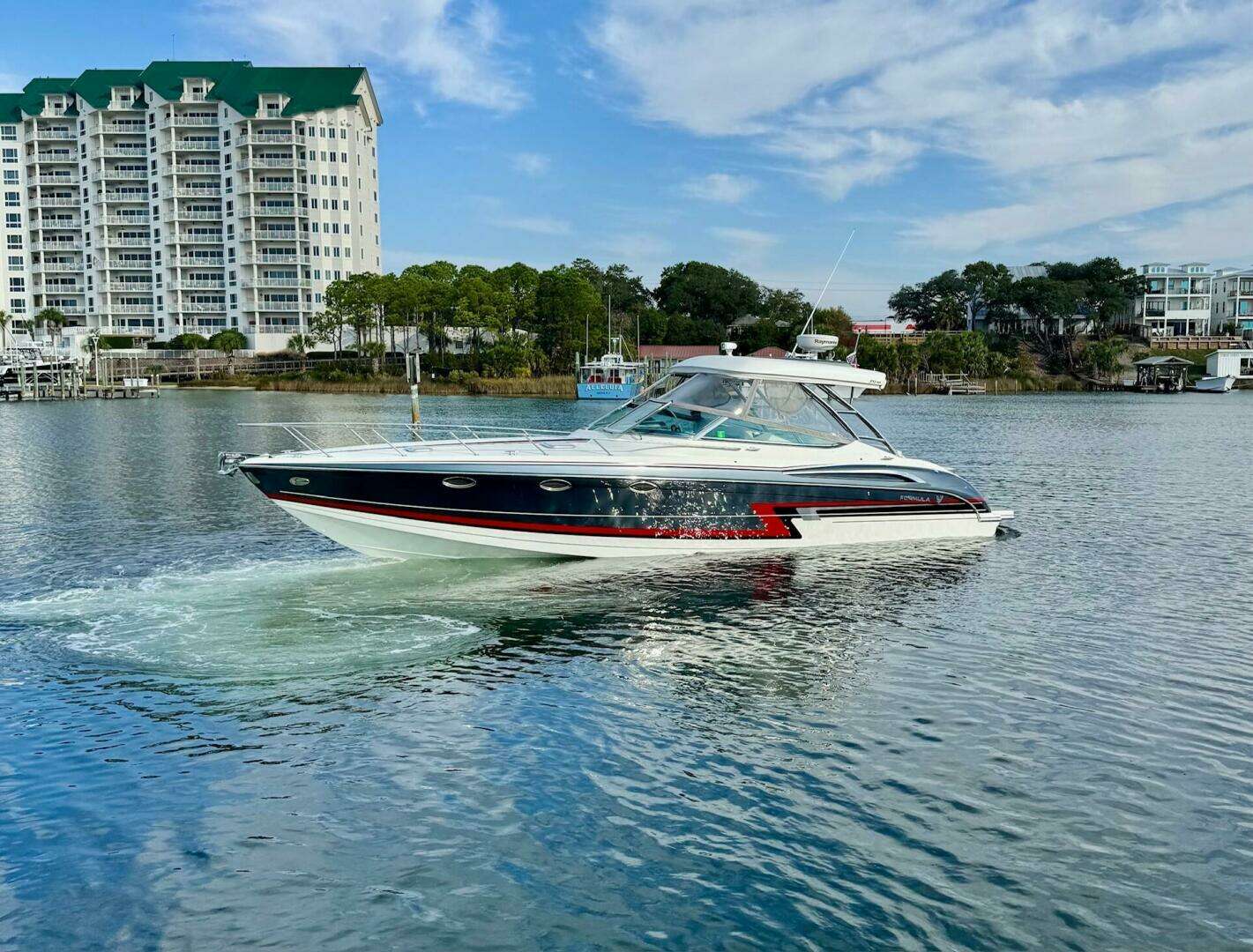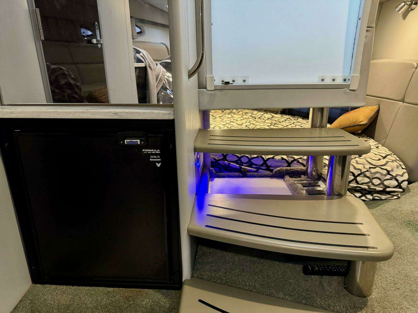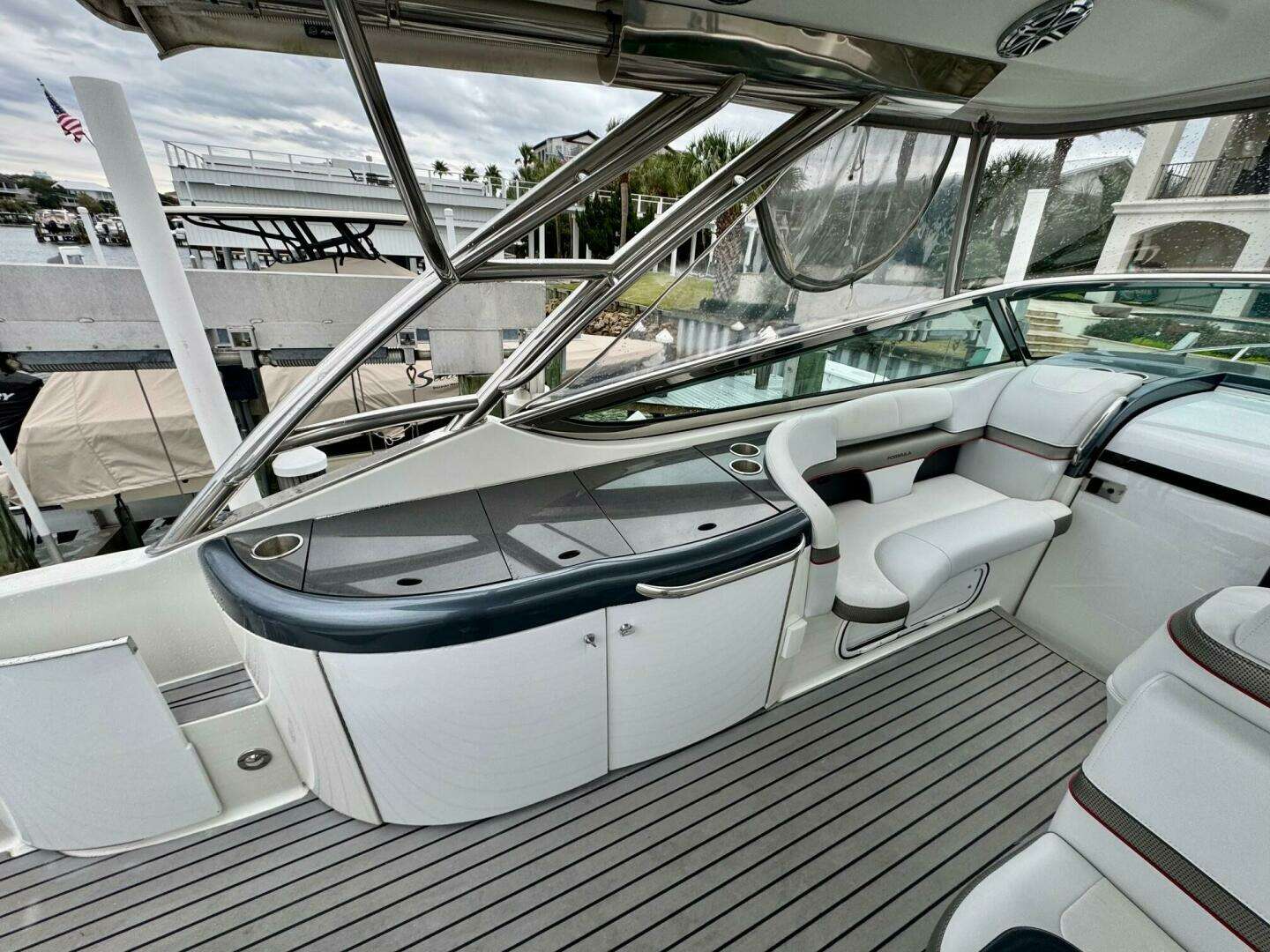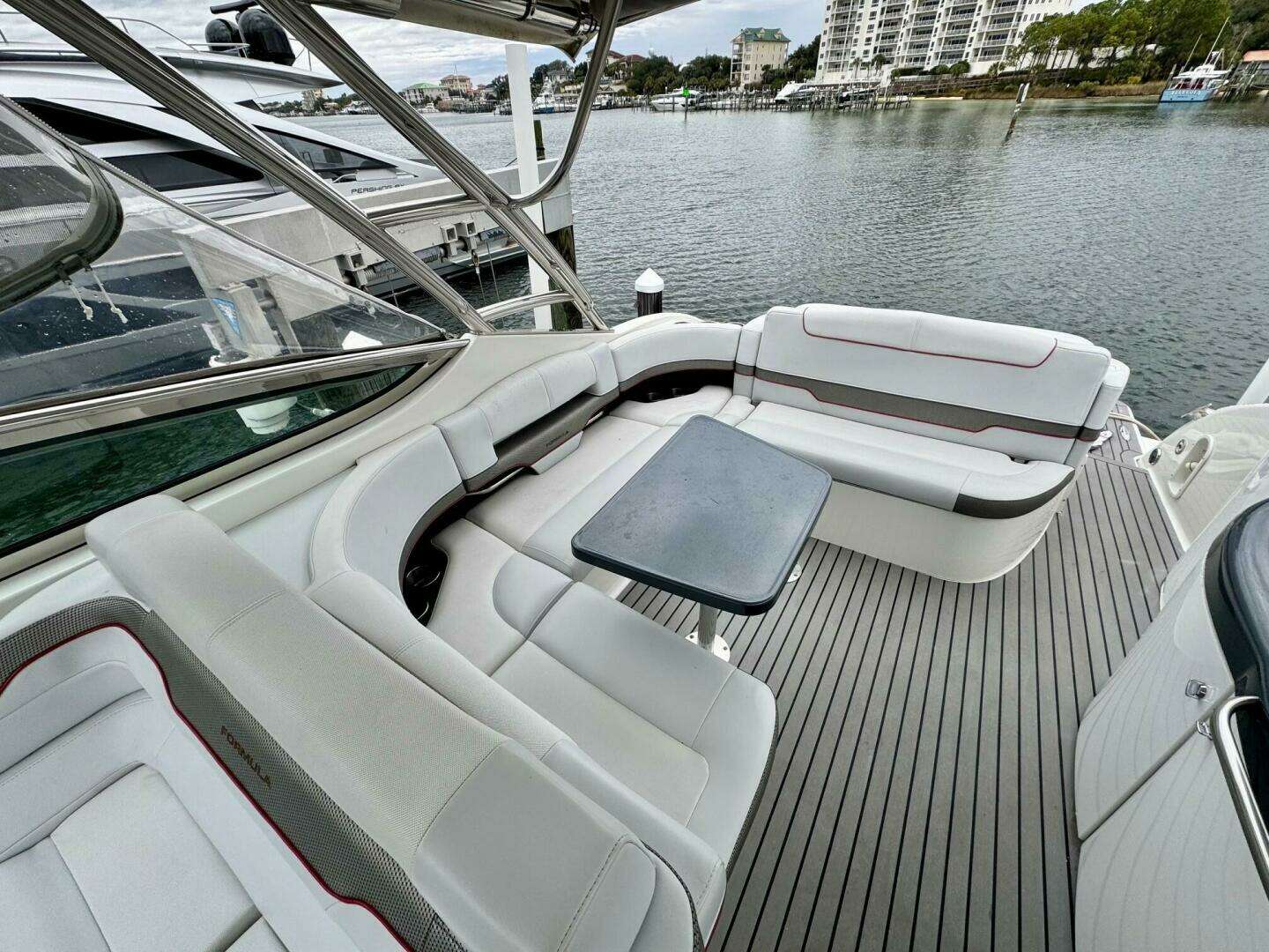 2016 37' Formula 370 Super Sport "Hoody" for sale- This Formula 370 Super Sport sits high and dry on a lift and is maintained by a yacht management company. She’s super sleek with a low profile that cuts through wind and waves with ease. She also has a complete cabin to take you to those overnight spots or long afternoon naps. The 370 SS cockpit adds more versatility than ever with a doublewide captain’s helm, wet bar, and sun lounger. Drive in style with easy joystick controls, with a fully equipped radar and chart plotter. The aft-facing lounge is electrically activated to create a generous sun pad. There's also a hard top with Sure Shade. Her expertly presented textures and colors, recessed alcoves with stainless railing, integrated, blue LED lighting, and cupholders set in eye-catching Corian® position the 370 SS at the forefront of marine design. Contact us today for an immediate showing.