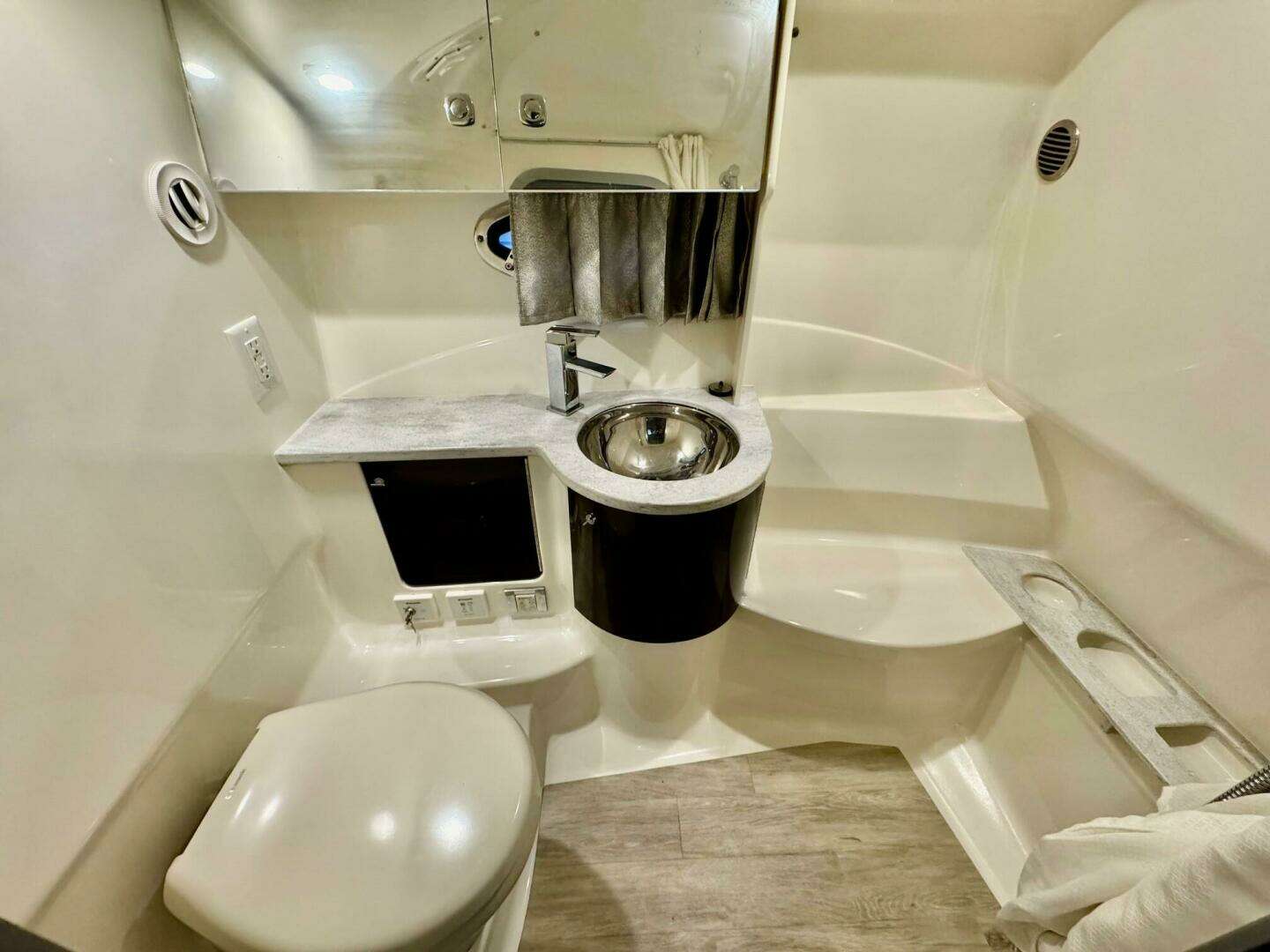 - Molded private head compartment w/vanity, high-gloss Deep Cherry-finish lower doors, Corian countertop, polished stainless steel sink w/swivel faucet, porcelain Flush and Forget® VacuFlush® head unit, 50-gallon holding tank & dockside pumpout, separate shower area w/molded-in seat & exhaust fan