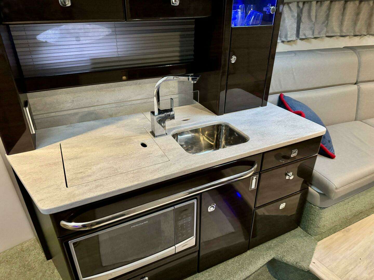 - Complete galley in high-gloss Deep Cherry finish w/storage & hardwood dovetailed drawers, full Corian countertop, 120V/12V polished stainless steel refrigerator, polished stainless steel sink, concealed electric stove w/safety shut-off switch, microwave oven, Krups® 5-speed blender & concealed trash container
