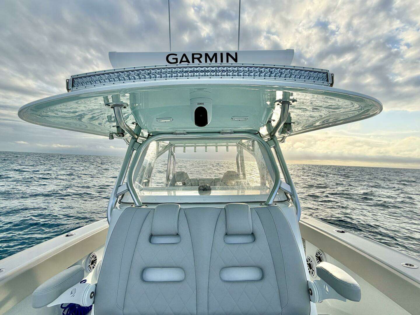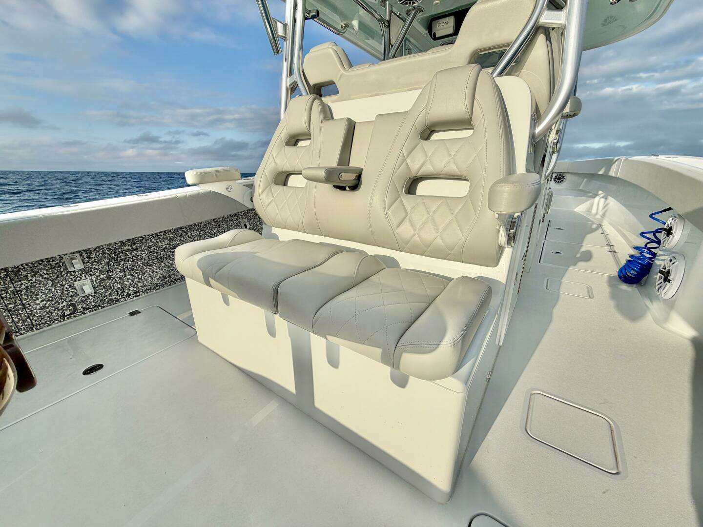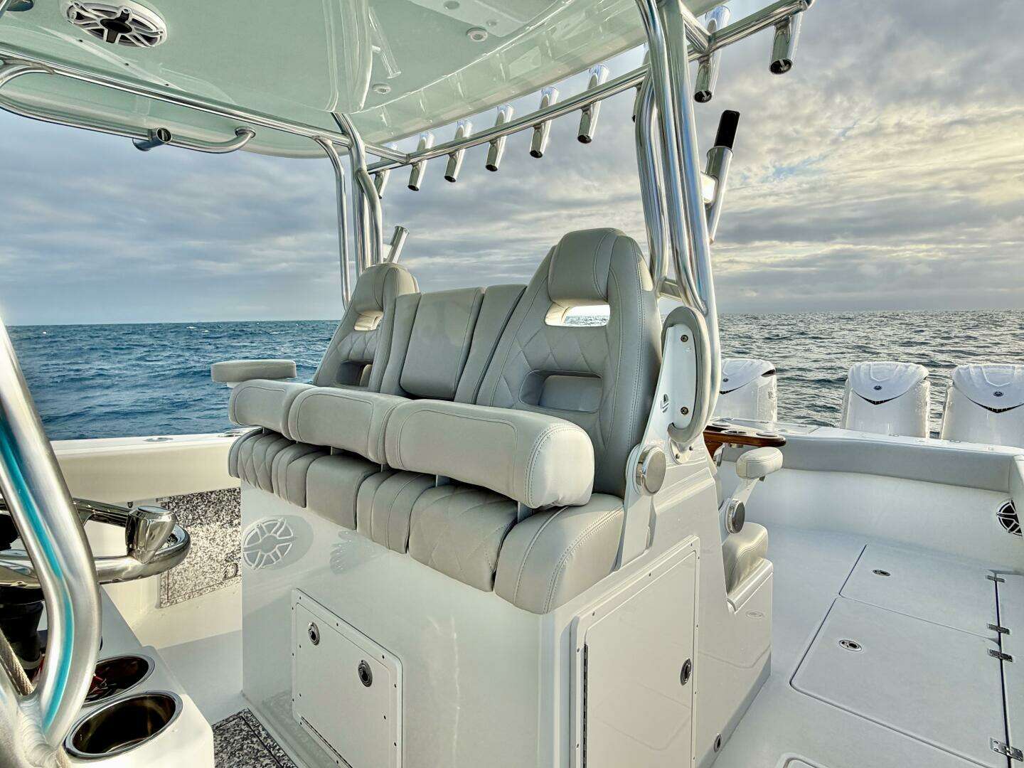 At the helm, the center console is positioned to offer excellent visibility forward and aft, protected by a solid hardtop and wraparound windshield. The helm area is thoughtfully arranged, with ample dash space for navigation displays, intuitive sightlines to the bow, and seating designed to support long runs offshore. Standing or seated, the captain remains well connected to the boat, with the helm serving as the natural command center of the vessel.