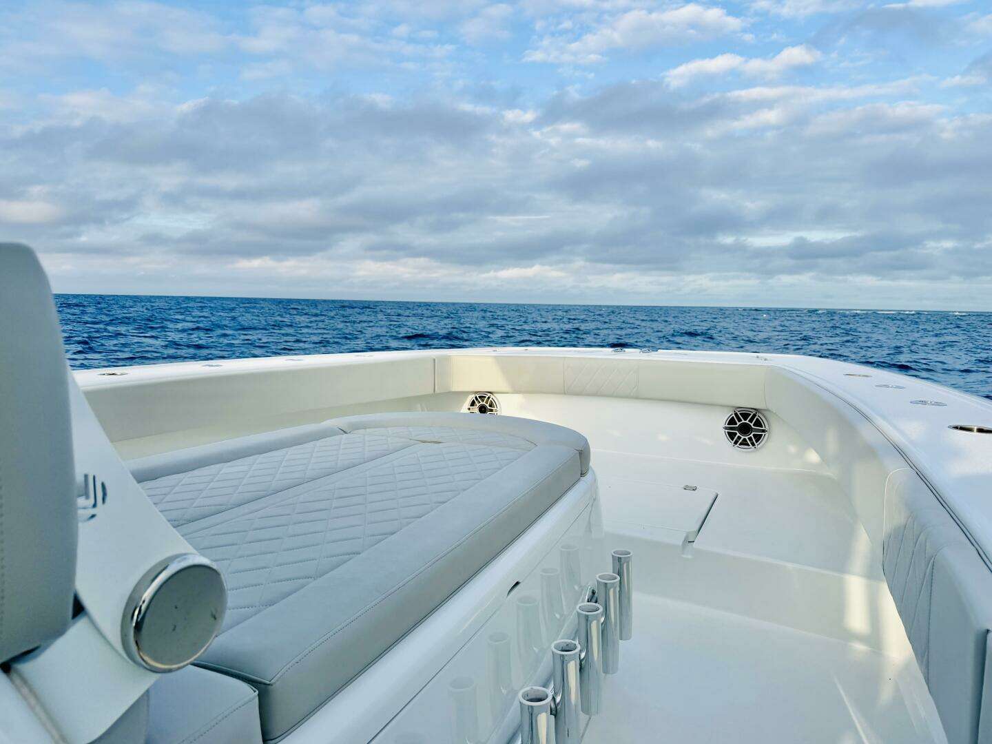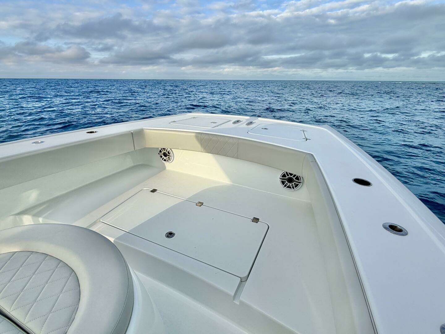 Forward of the console, the layout opens into the bow area, which balances comfort with utility. The forward deck offers generous seating and lounging space while maintaining clear walkways to the bow, and the elevated position provides excellent visibility when cruising. Storage is integrated throughout the bow area, keeping gear neatly stowed while preserving the clean, minimalist aesthetic Freeman is known for.