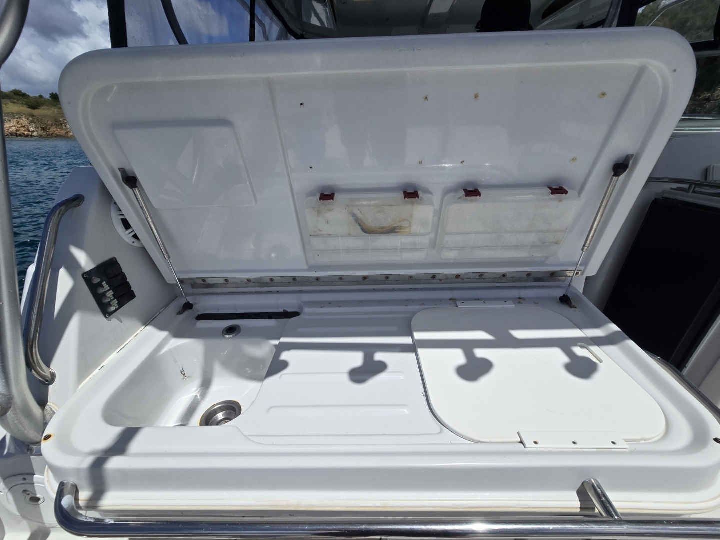 - Bait tank with raw water fill and viewing windows
