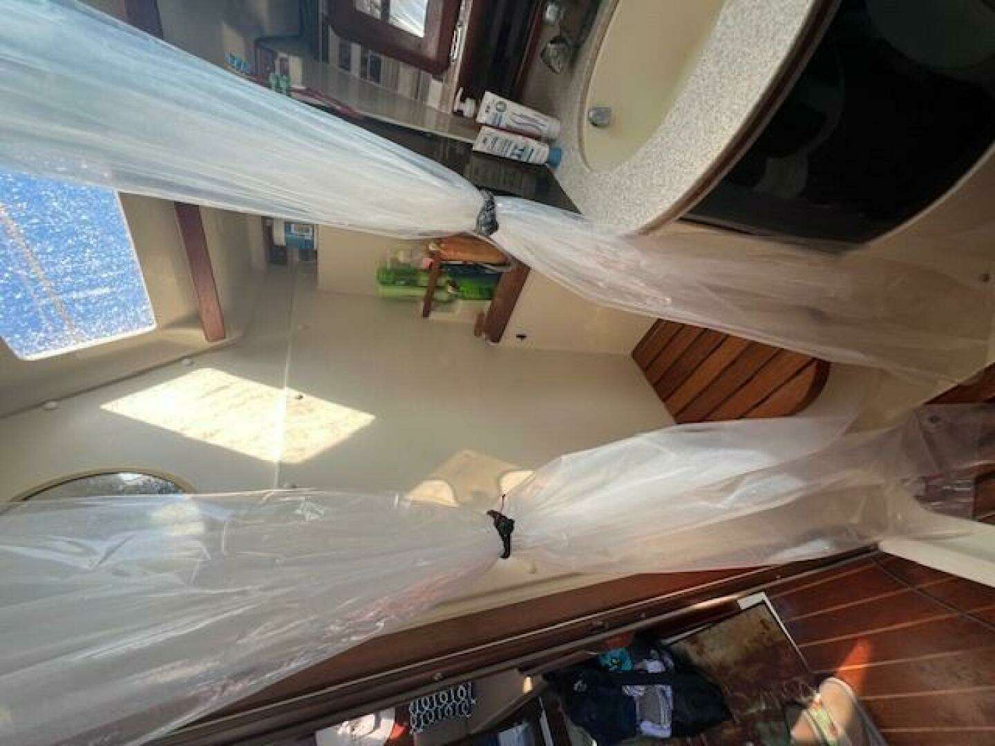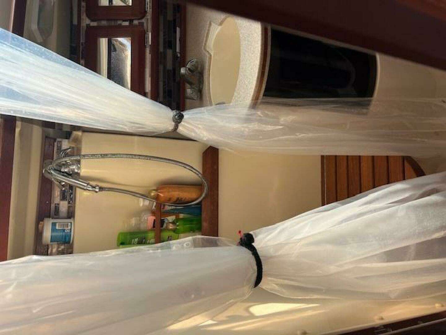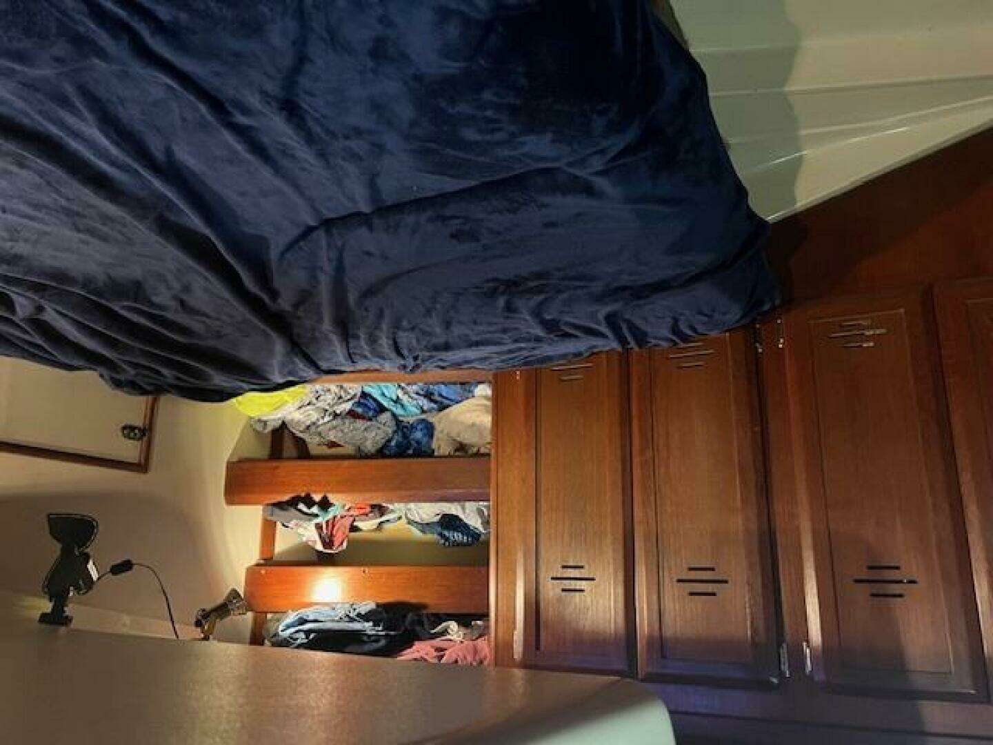 Aft, offering a combination of standing and stooping headroom, the spacious owner’s stateroom features a pedestal double berth and his-and-hers hanging locker/bureaus. It can be entered via the galley or the head.