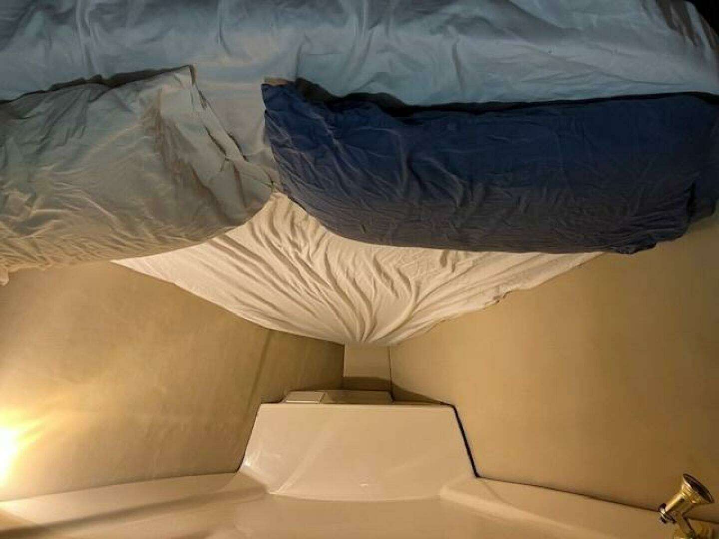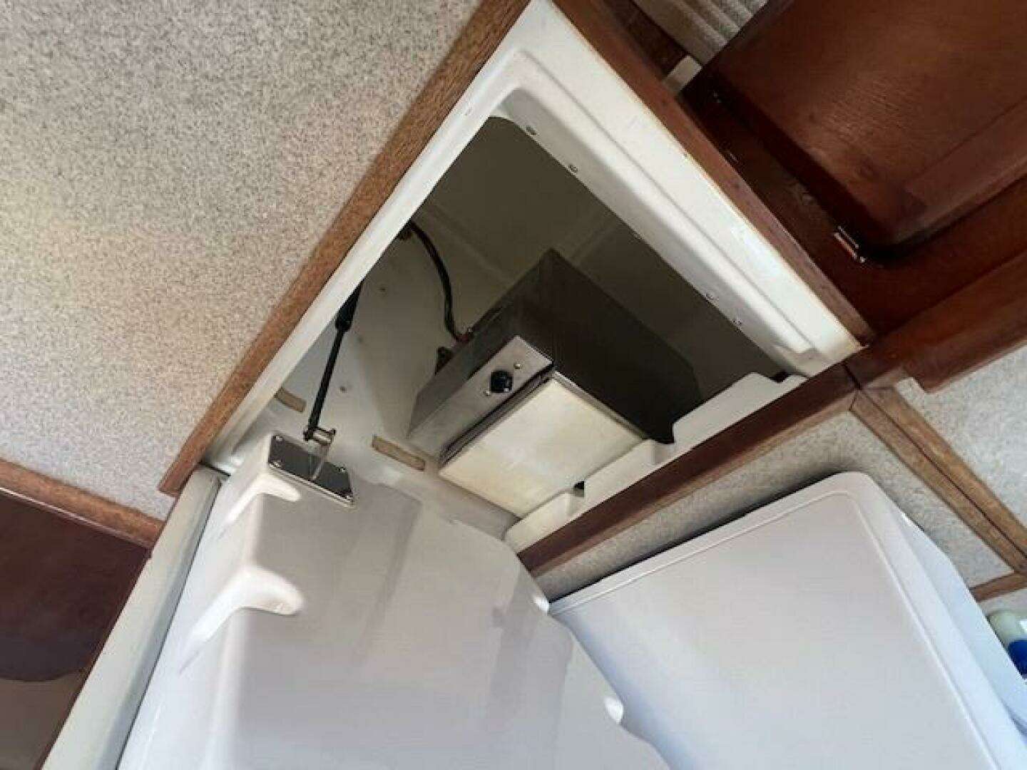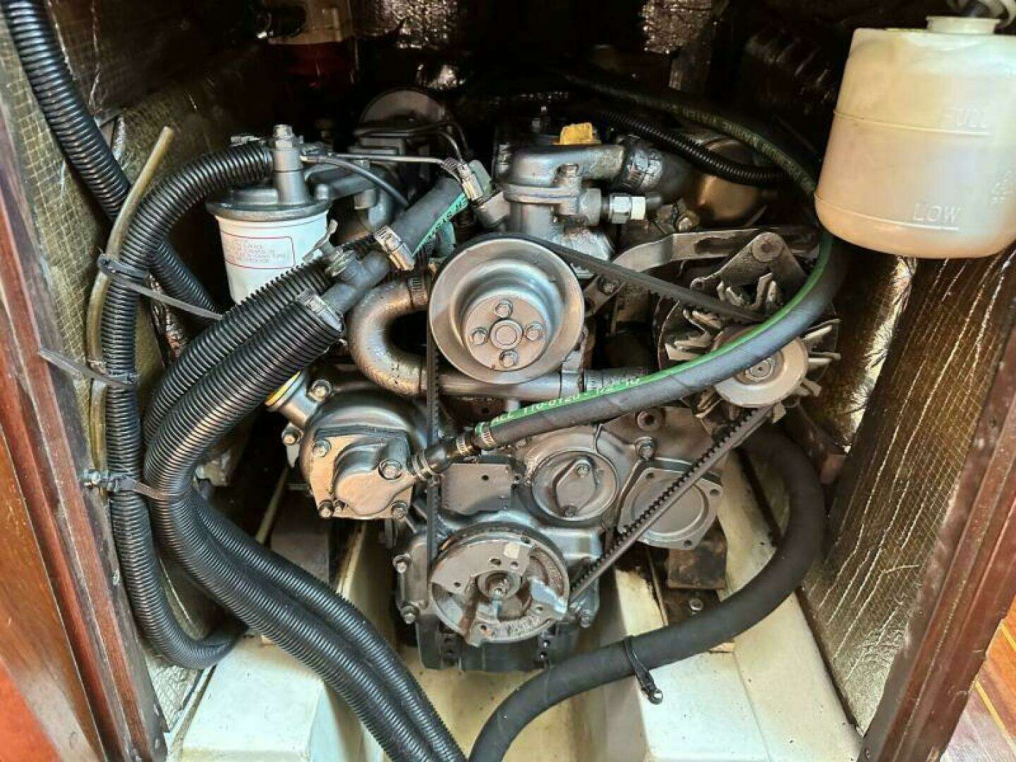 Aft, offering a combination of standing and stooping headroom, the spacious owner’s stateroom features a pedestal double berth and his-and-hers hanging locker/bureaus. It can be entered via the galley or the head.