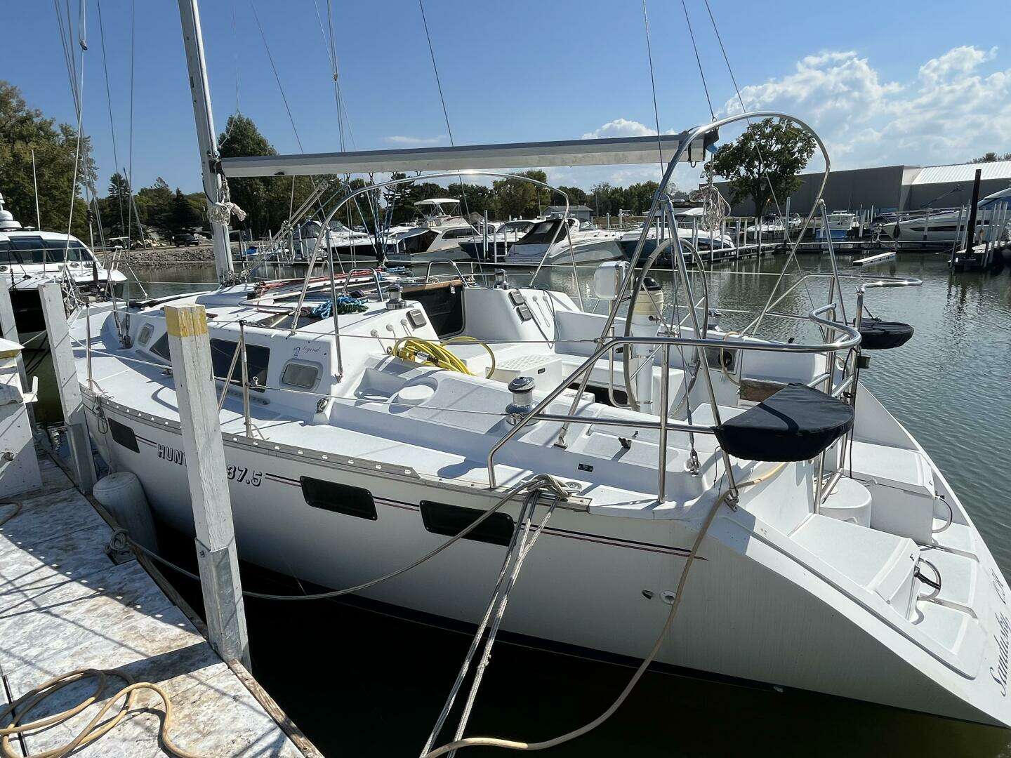 The Legend 37.5 differs from most Hunter sailboats as it has a fractional sloop rig with a pinheaded mainsail. This reduces mainsail area slightly and affords more precise sail control in bigger breeze. Sails have been replaced recently and include a main, 105% jib, and spinnaker. The sailplan is efficiently balanced and can be shortened easily if needed. Standing and running rigging have been replaced over the past 10 years for added peace of mind.