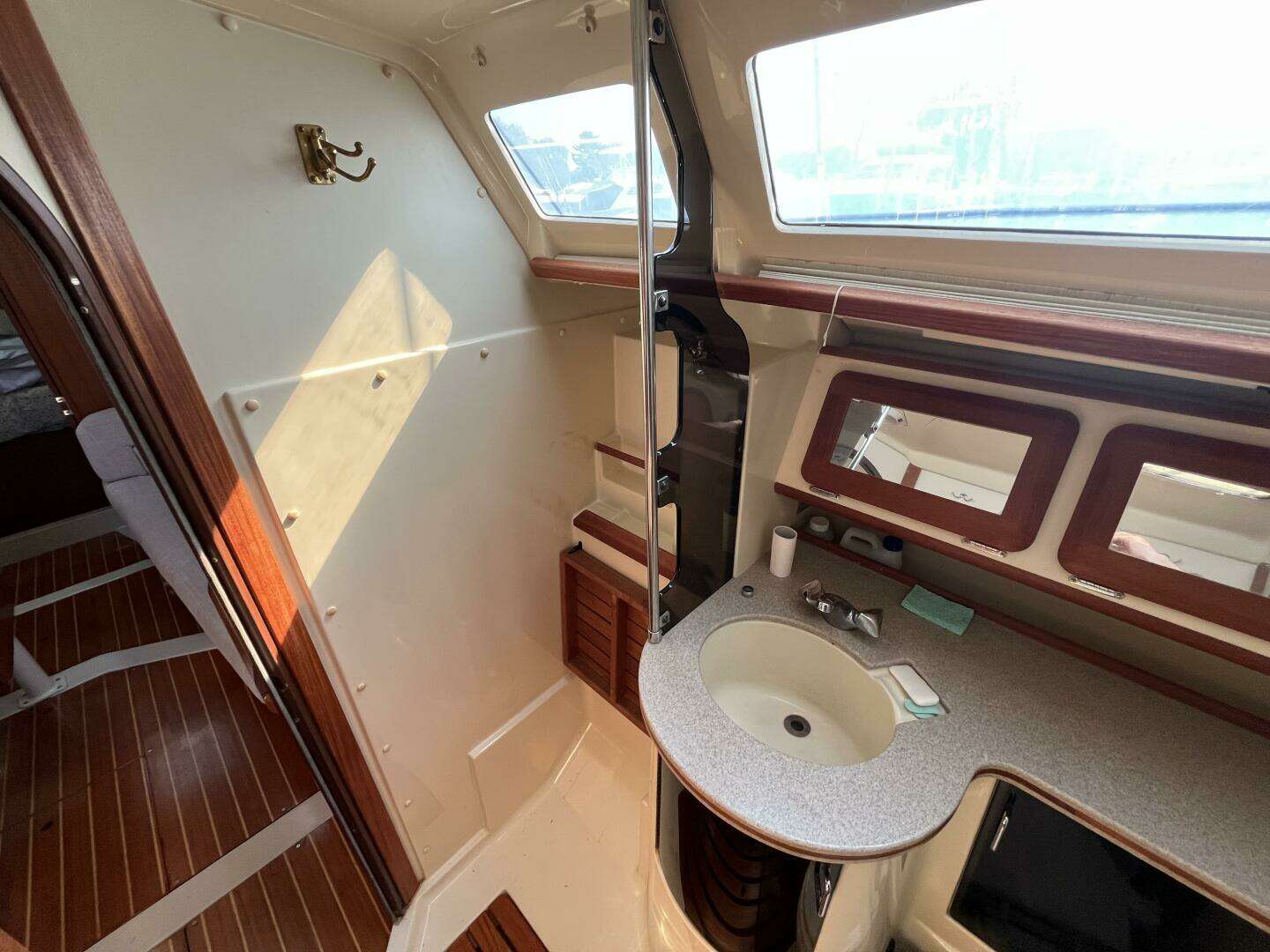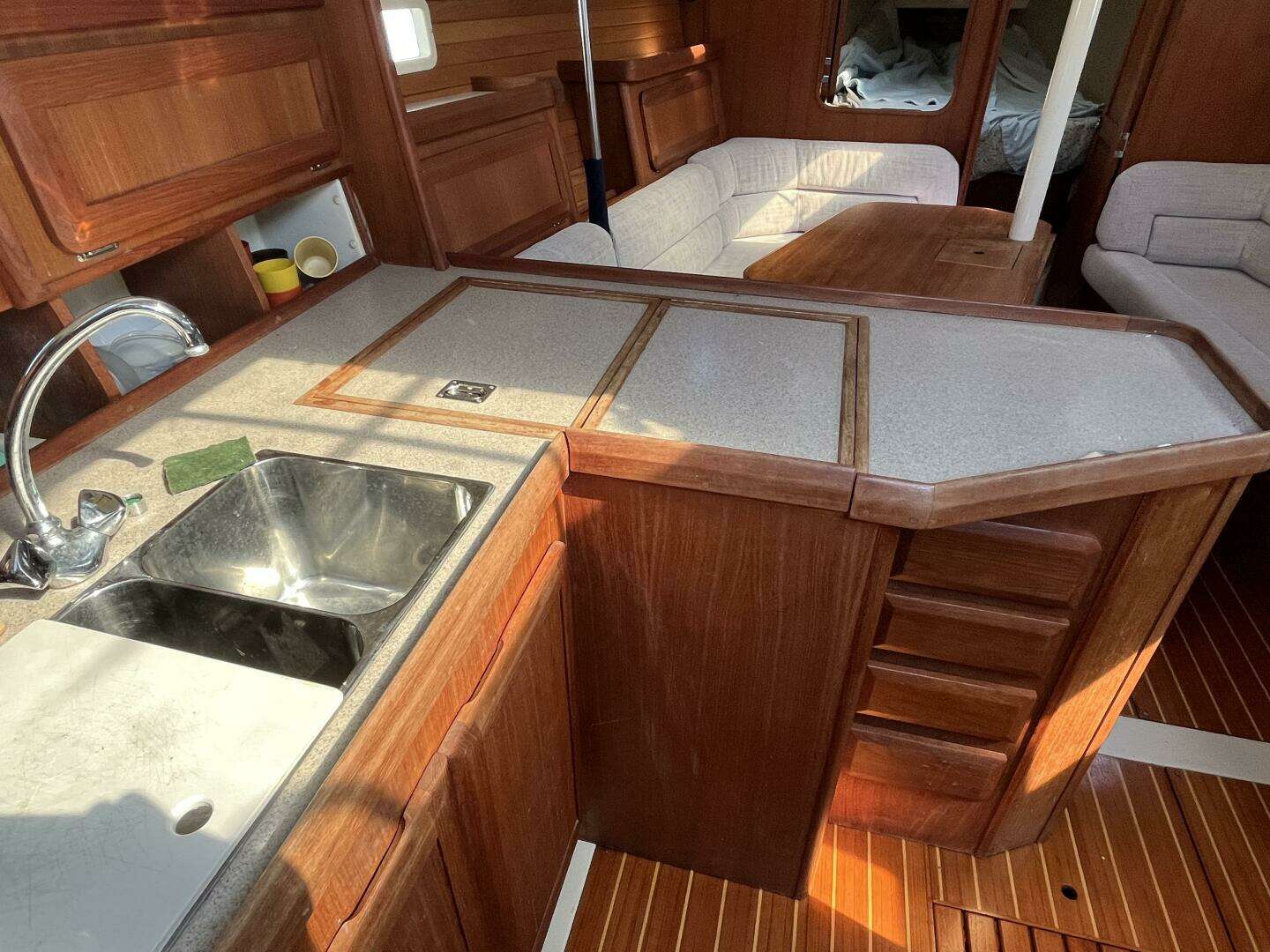 Down below you will enjoy ample head room, a spacious but efficient galley with generous refrigerator and freezer access, and the warm woods not often found on newer boats. Teak and holly flooring provides a classic look, and teak ceilings and cabinetry in just the right amounts bring warmth without making the space feel dark. Daylight finds its way inside through hullside lights and portlights on the coachroof and overhead hatches. Upholstery on Heph Ze Bah is in good condition and is contemporary in color and finish. Ample seating at the salon can be converted to extra berthing, and a drop leaf table can accommodate quite a few guests. A private forward cabin features a V-berth with hanging lockers, and an additional private aft cabin includes storage shelves and a queen berth with storage underneath. Hunter was ahead of its time with this design by placing so much comfort and space inside of a sub 40-footer.