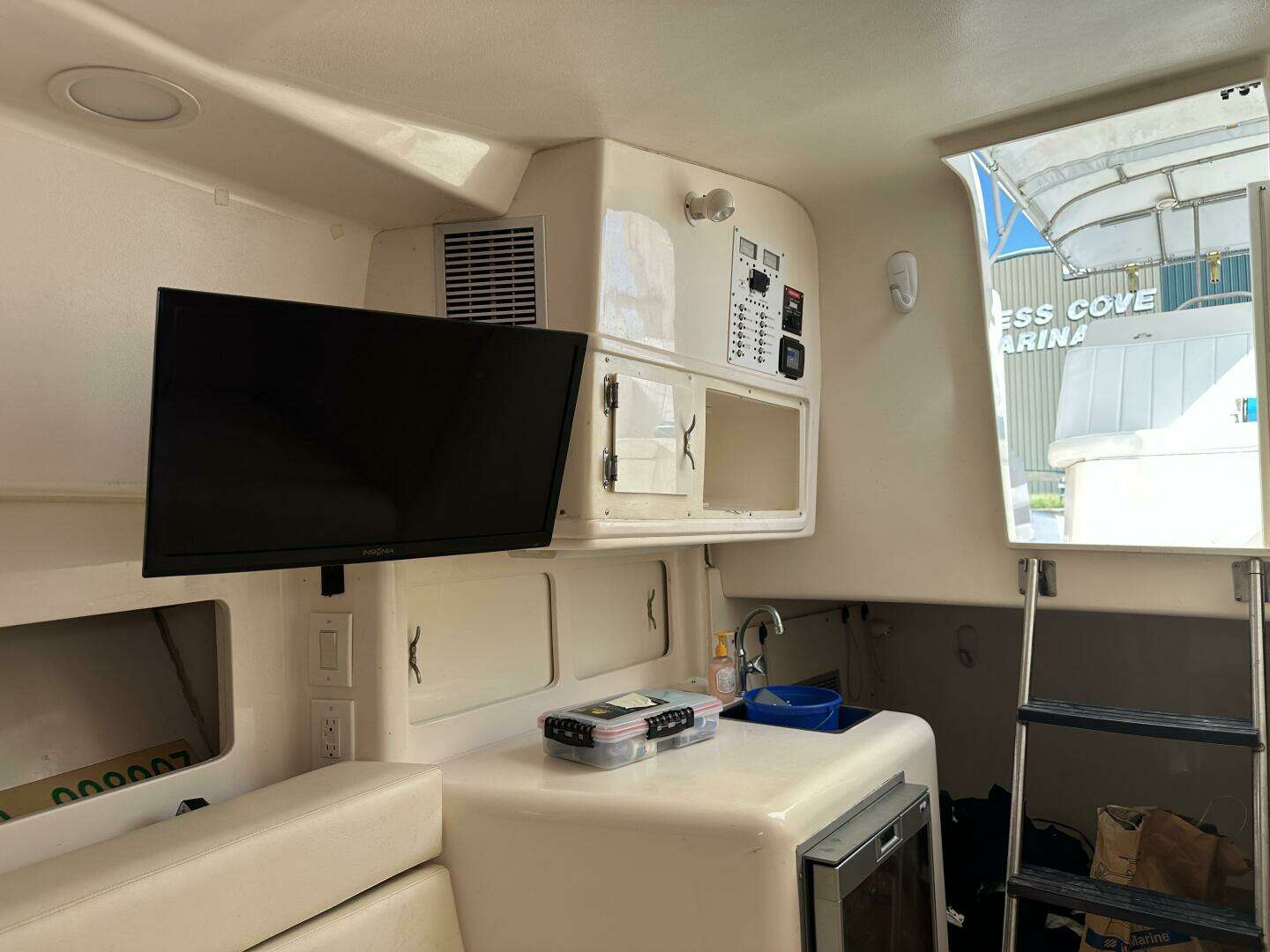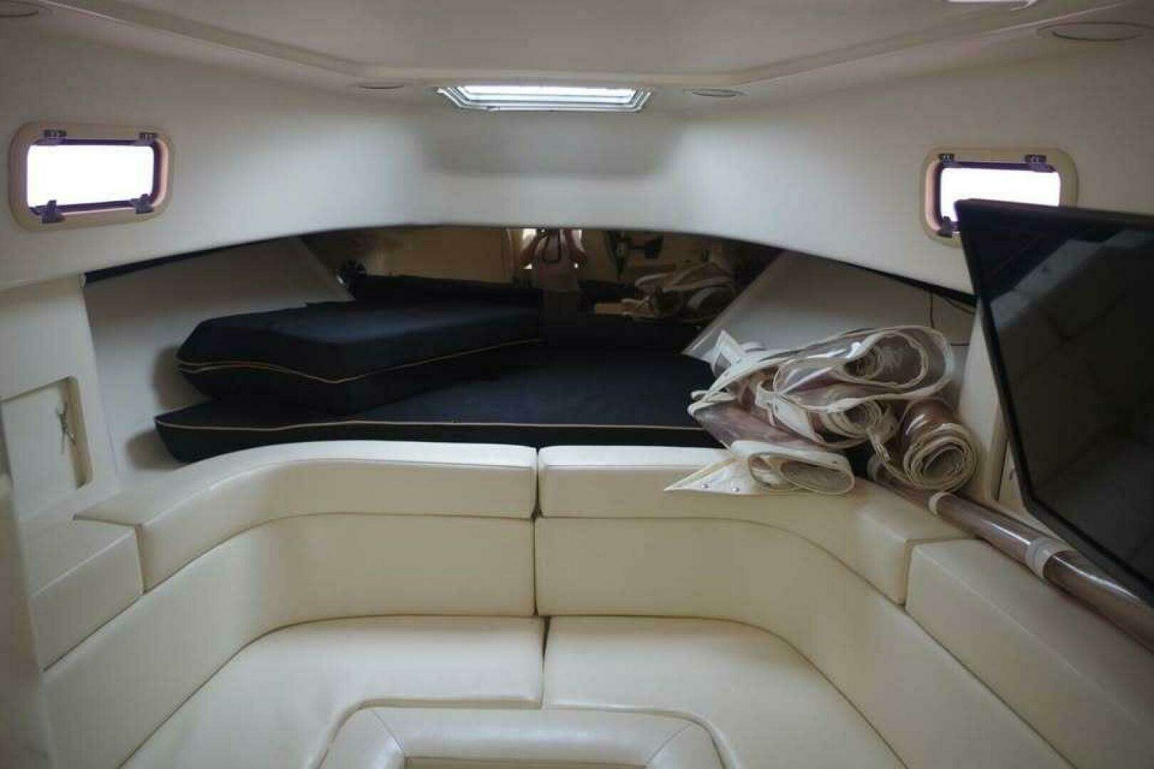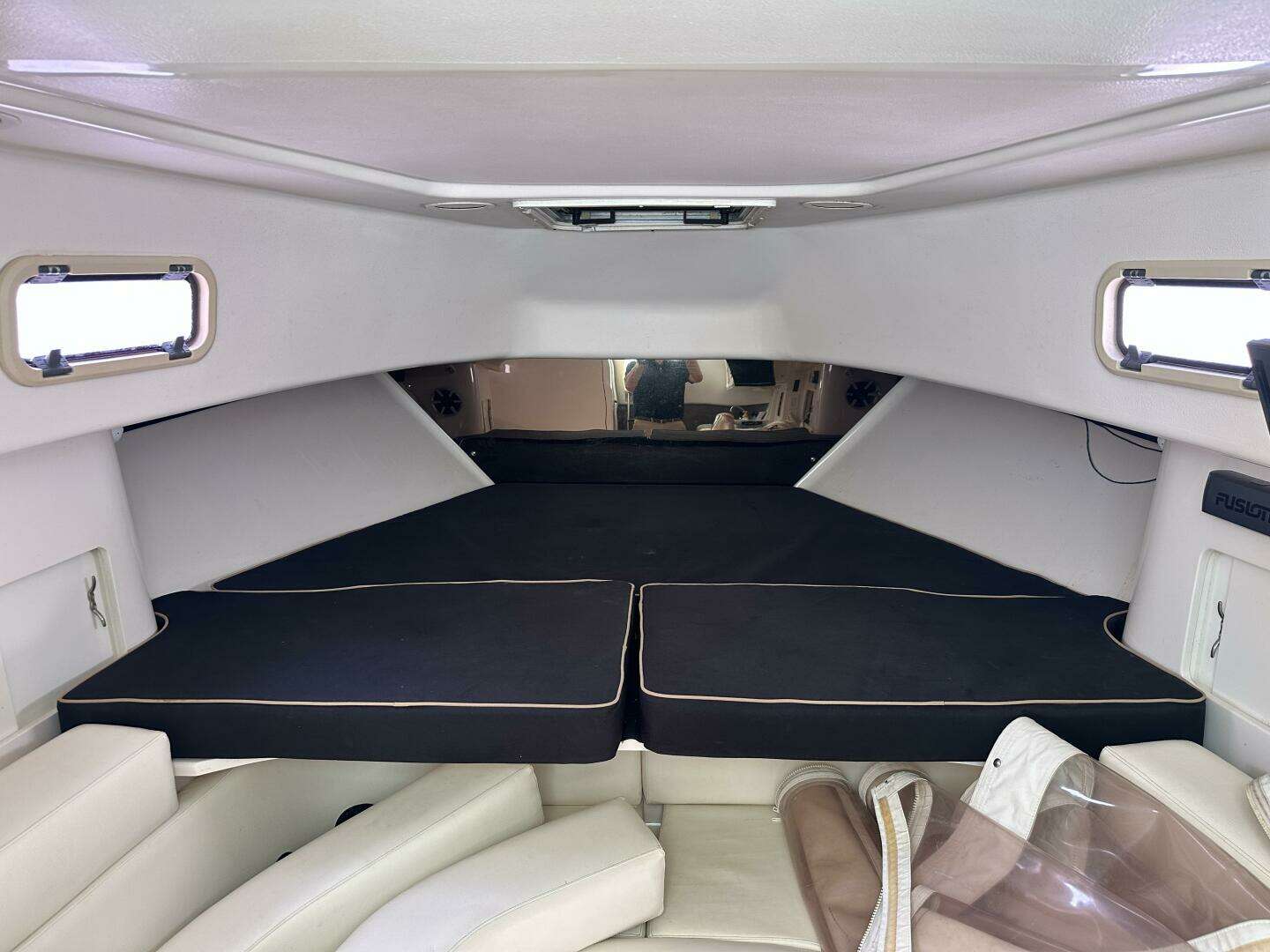 - Layout: Master stateroom forward with island pedestal berth, TV and privacy door. A circular door closes off the starboard sitting room/guest cabin with a full sized bed and a convertible upper bunk.