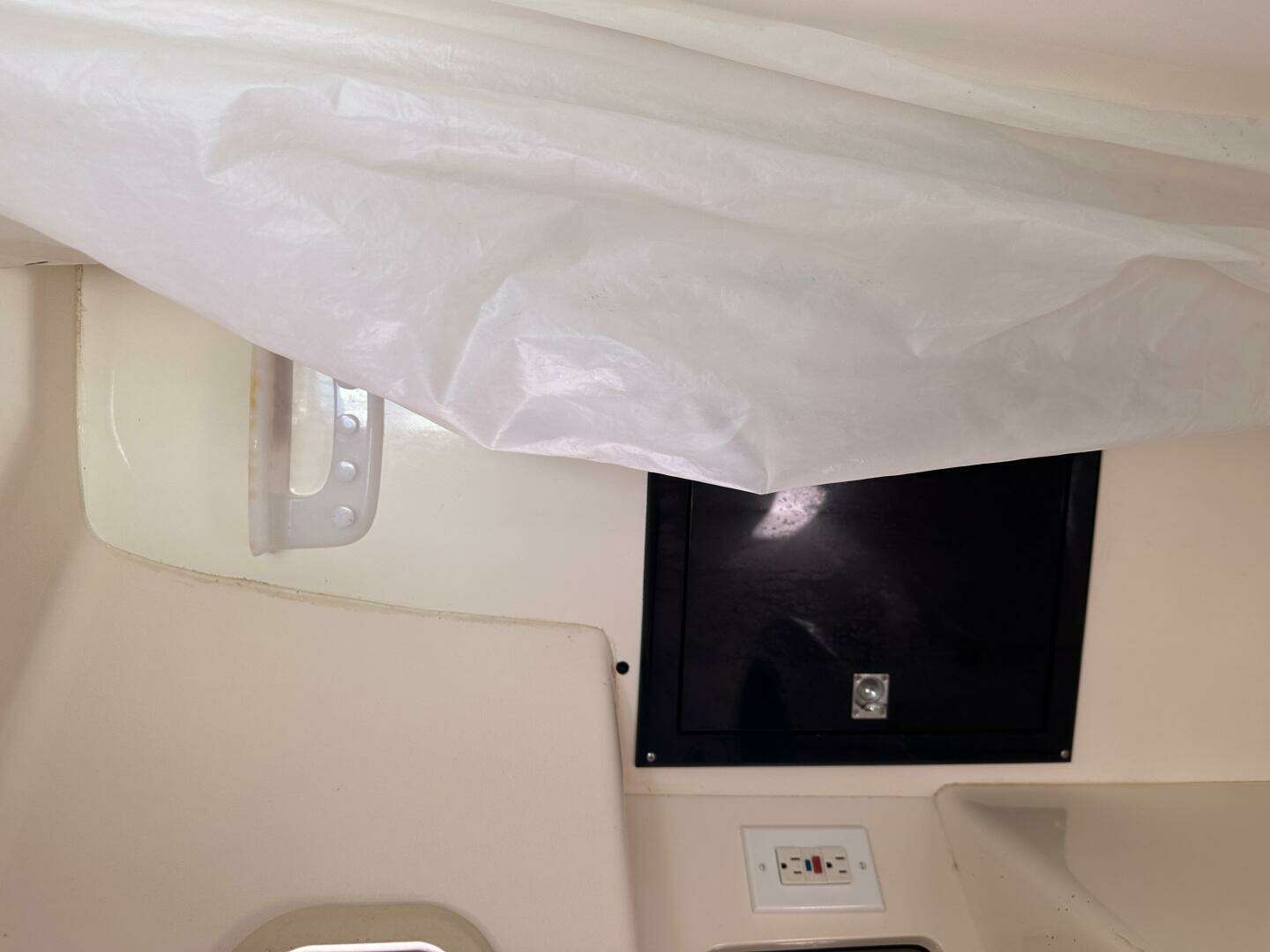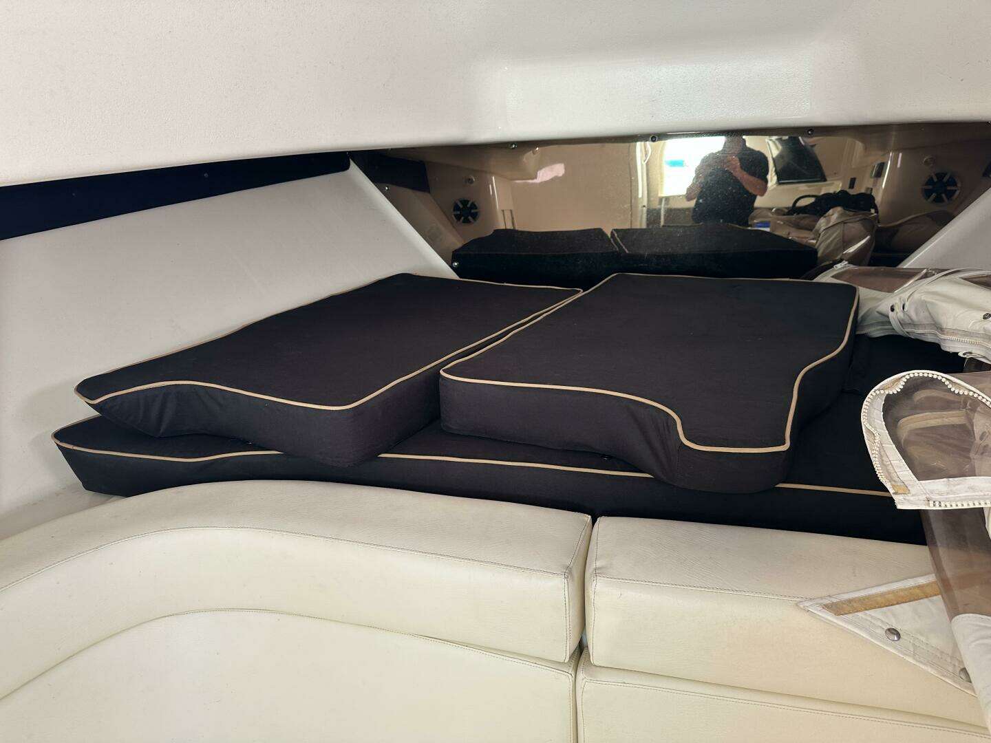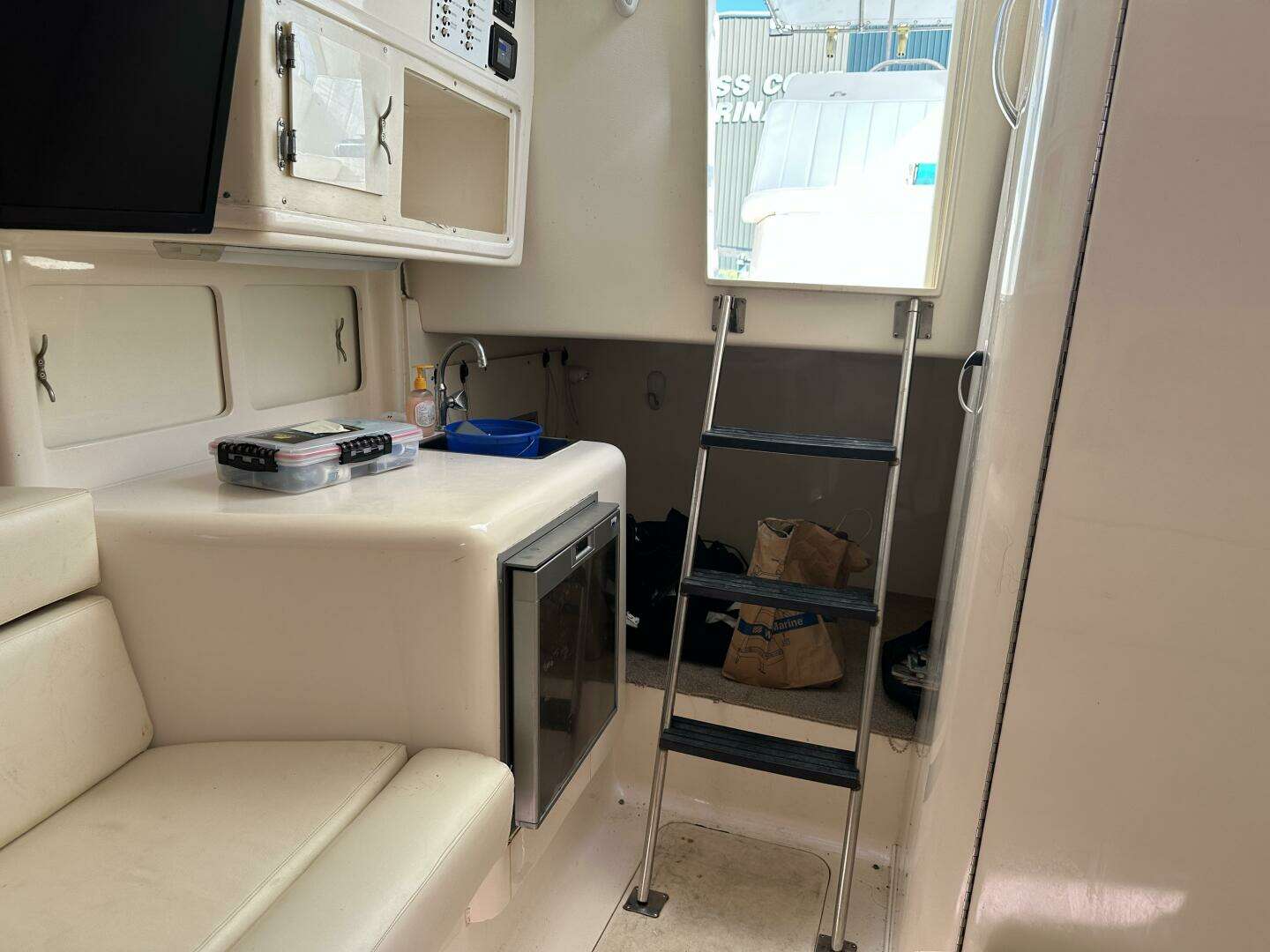 - Layout: Master stateroom forward with island pedestal berth, TV and privacy door. A circular door closes off the starboard sitting room/guest cabin with a full sized bed and a convertible upper bunk.