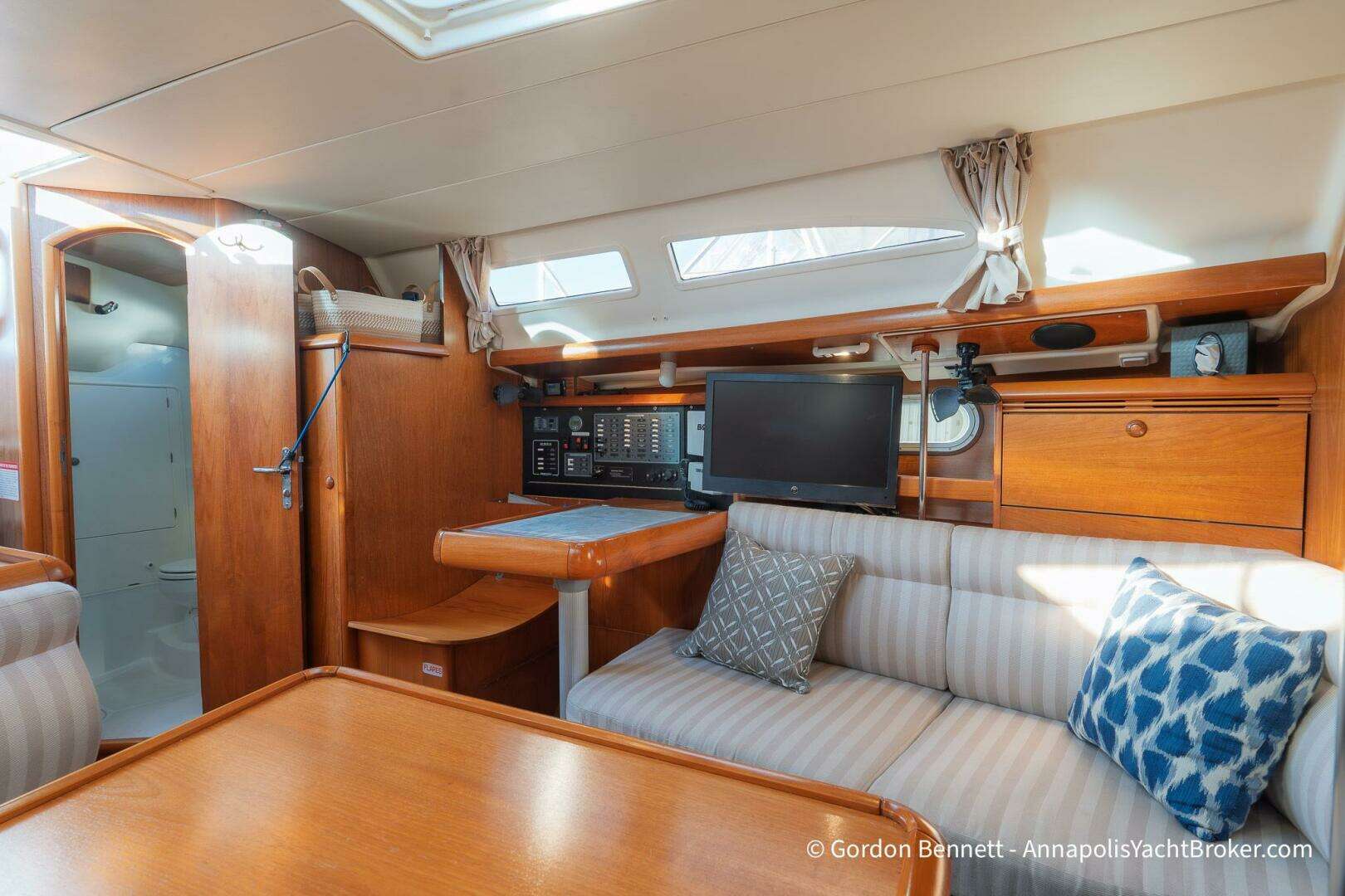 She’s been modernized where it matters, with a repowered diesel, lithium power, solar, and a Victron energy system that lets you stay out longer and worry less. At the helm, updated B&G electronics keep things clean, intuitive, and confidence-inspiring whether you’re daysailing or stretching your range.