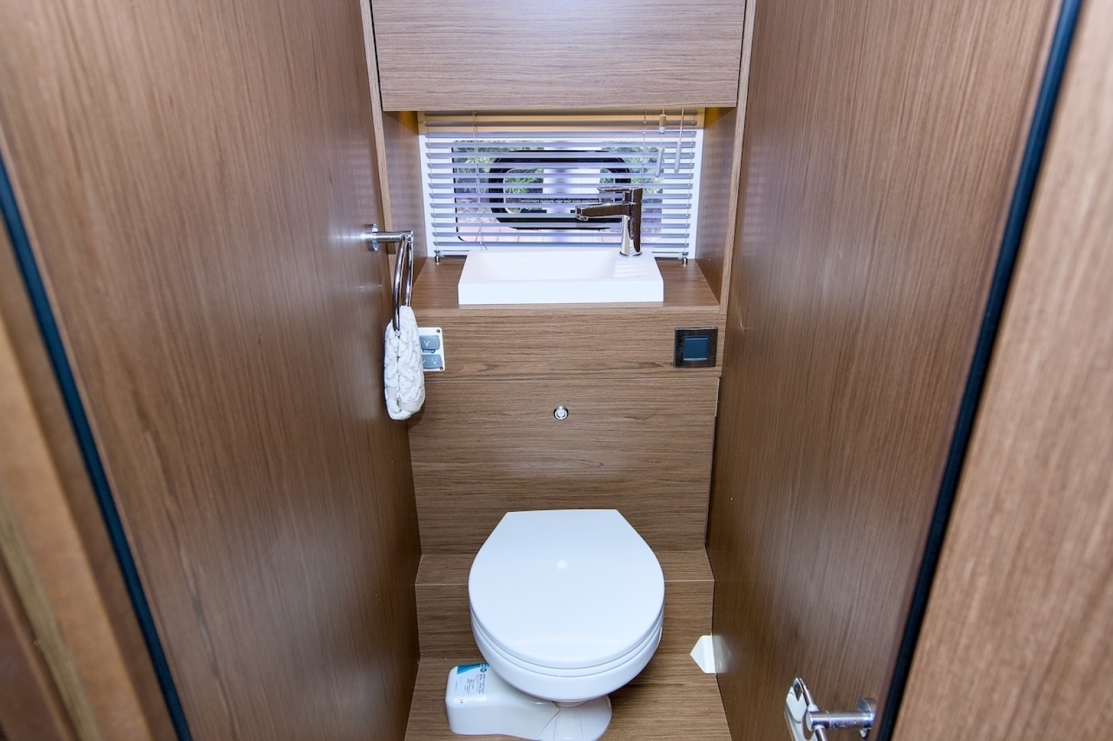 The NC 37 has a single head with a separate shower compartment and a separate head compartment. This is a unique feature on a boat in this category.