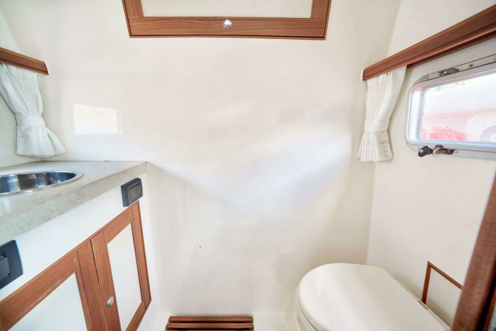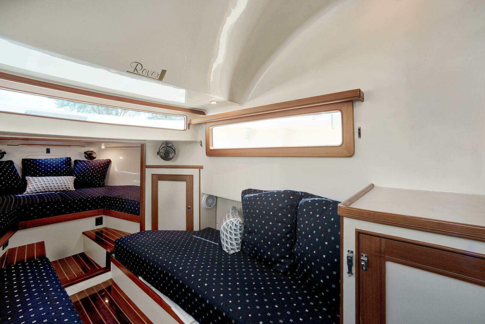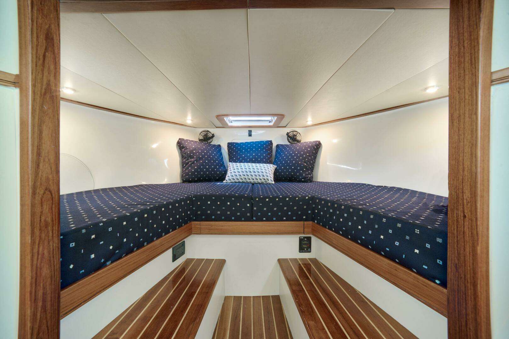 Rover is a Prowler Havana and is a great example of the Marlow Prowler series with state-of-the-art electronics and high-performance Mercury 400HP Engines. This Prowler is technically a center console open fisherman, similar in concept to a dozen others, however, that is where the resemblance stops. This new thoroughbred features sexy lines and cockpit volume that none of her competitors can even hope to match. The graceful tumblehome and classic lines are unmarred by a single gratuitous bulge or bump. Though one normally expects nothing more in an open fisherman than a porta potty or, at best, a small, cramped place under a seat or console, surprisingly this new development from the bright minds at Marlow features a very large, air-conditioned head complete with a sink and granite counter, plenty of natural lighting, and ventilation, with over six feet of headroom! That is just the beginning of an almost unbelievable level of comfort we have achieved with this lovely work of art. The Havana also features a comfortable cabin equipped with large vee berths, comfortable opposing settees, storage lockers, and a nice little galley and TV. Natural light and ventilation are plentiful on this vessel complete with an inverter and air-conditioning.