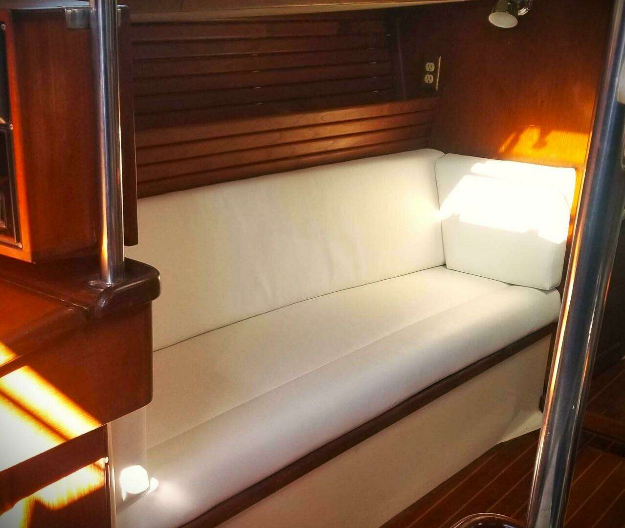 Saloon: Next aft is the saloon. To port is a 6'4" long settee with storage below it and behind it, and a teak planked magazine rack