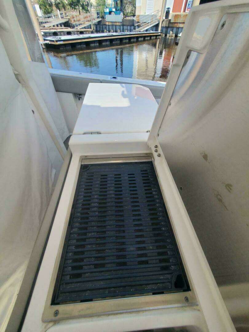 - Aft facing cockpit seat, Electric, slides aft for access to cockpit grill, refrigerated drink box and tackle storage