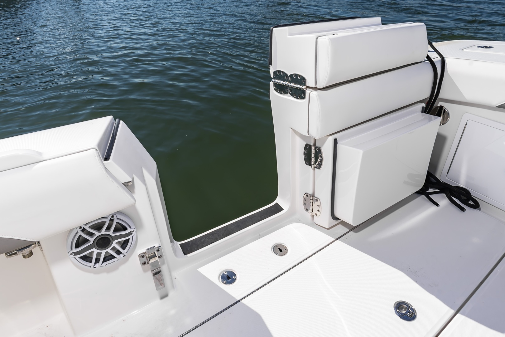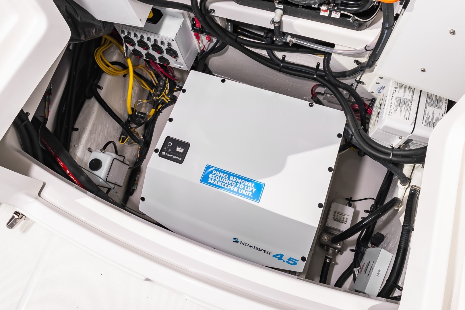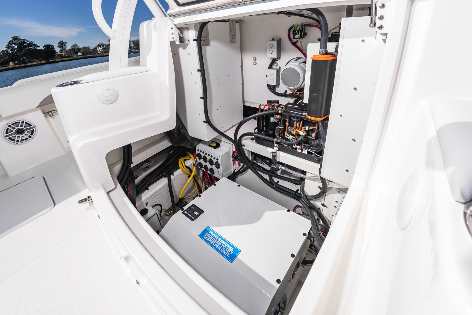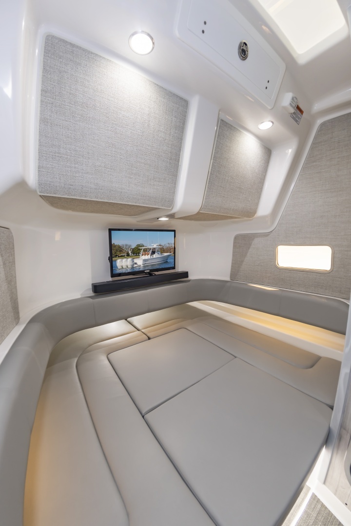 - Fully Accessible, Illuminated Pump Room beneath Aft Bench Seat (Fuel Tanks, Optional Seakeeper®4.5 and other Systems Access, and Extra Storage)