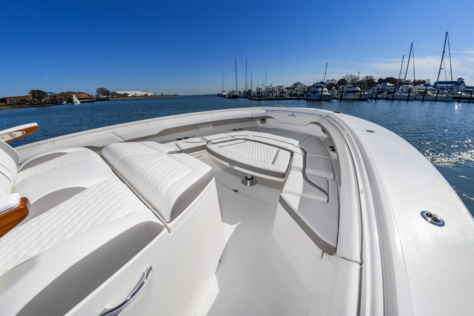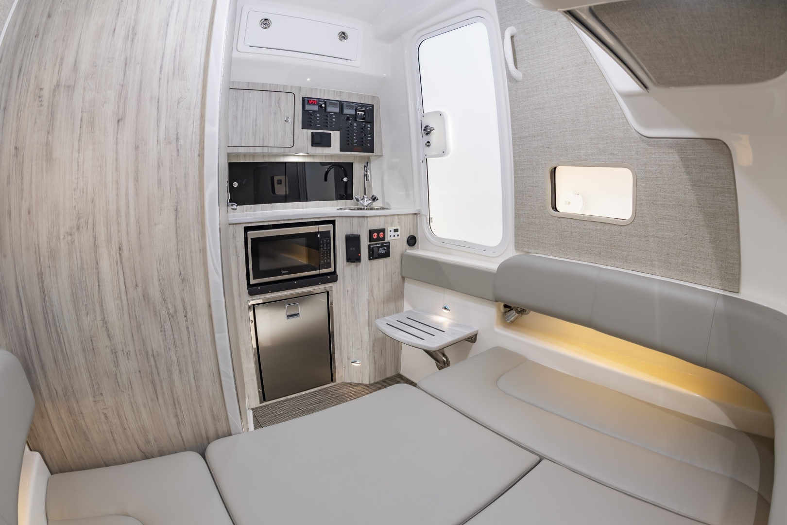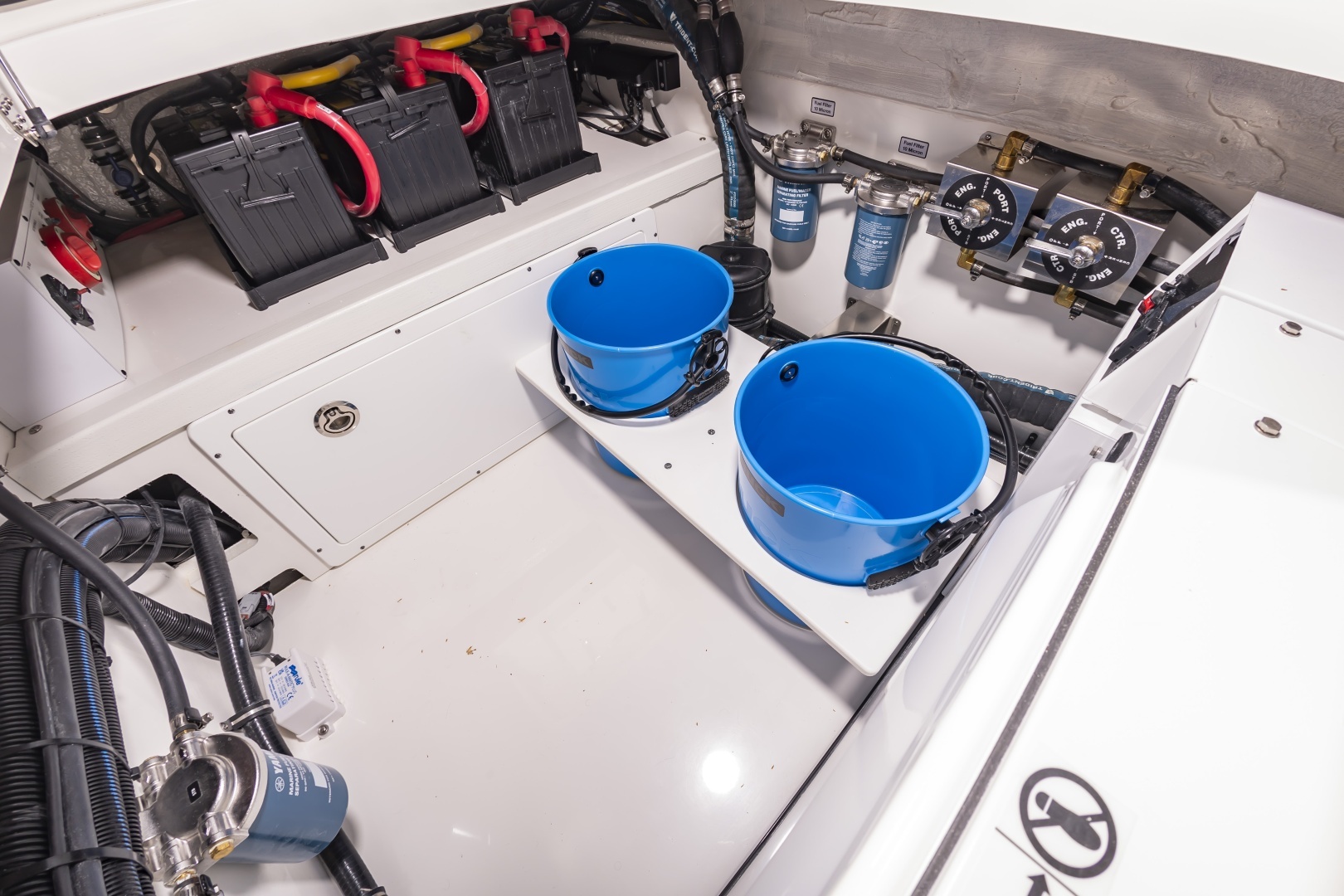 - Fully Accessible, Illuminated Pump Room beneath Aft Bench Seat (Fuel Tanks, Optional Seakeeper®4.5 and other Systems Access, and Extra Storage)