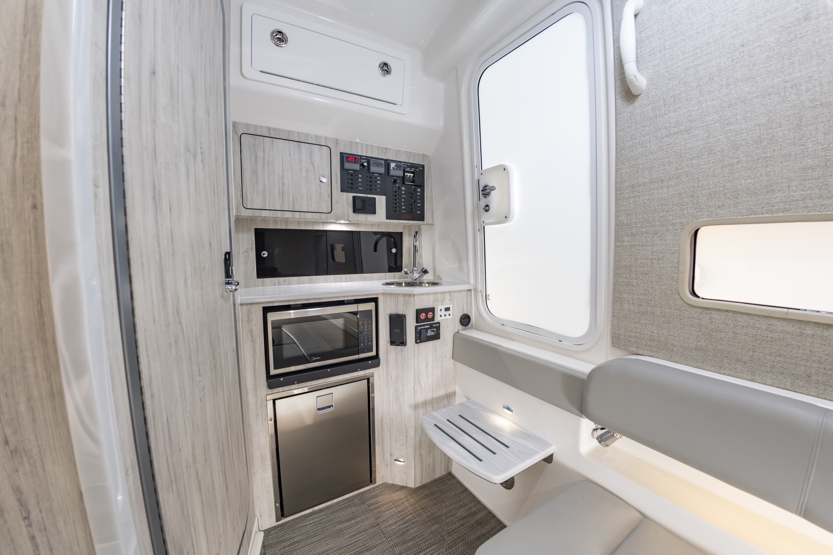- Galley with Refrigerator, Microwave, Sink, and Cabinet Storage