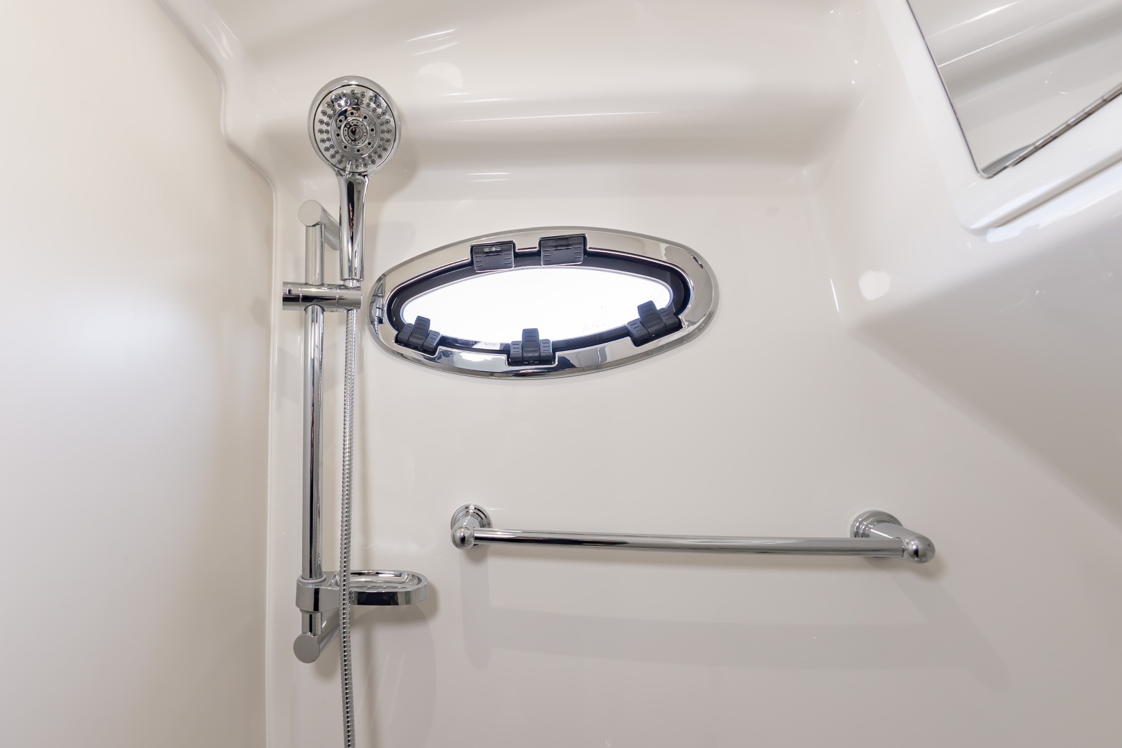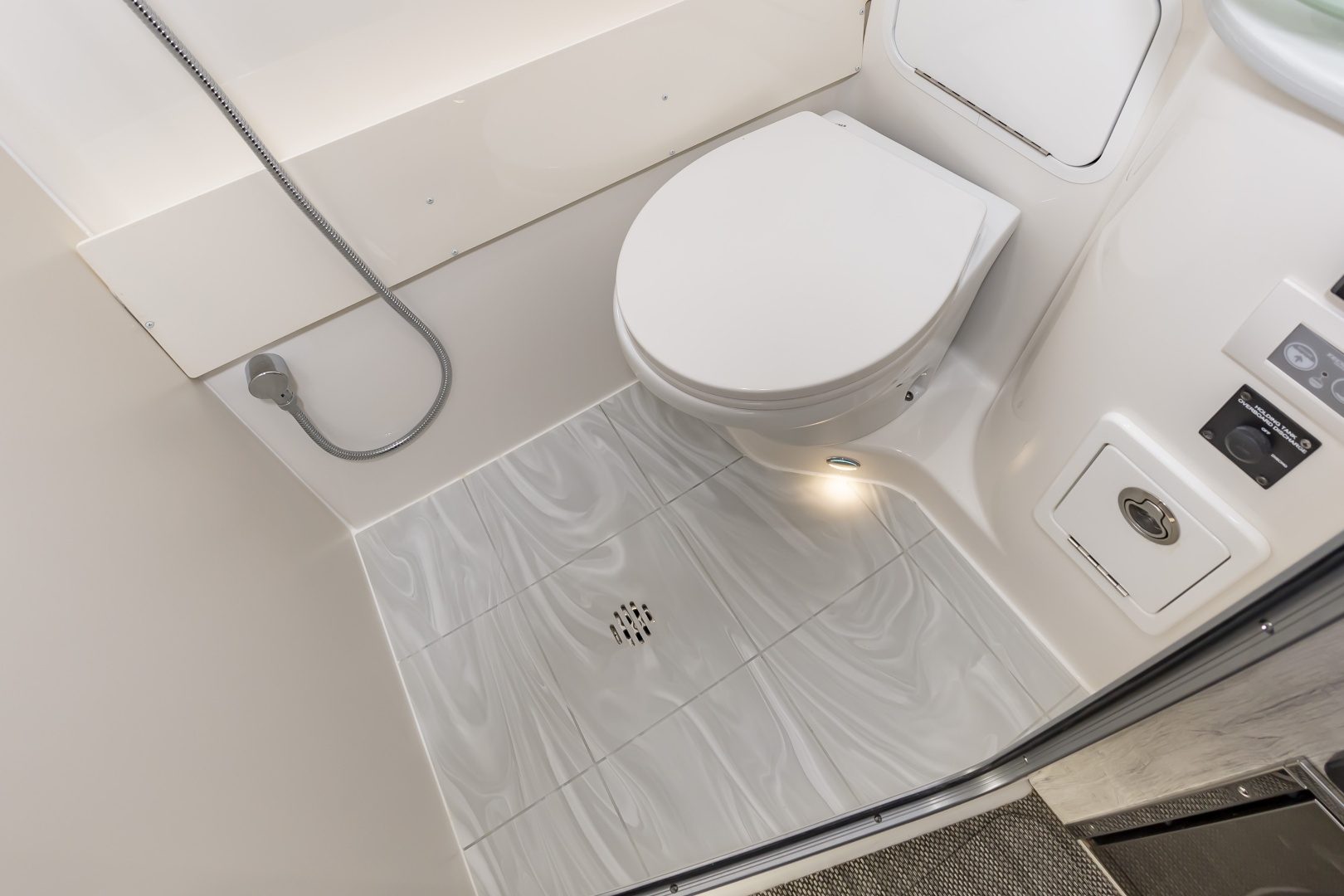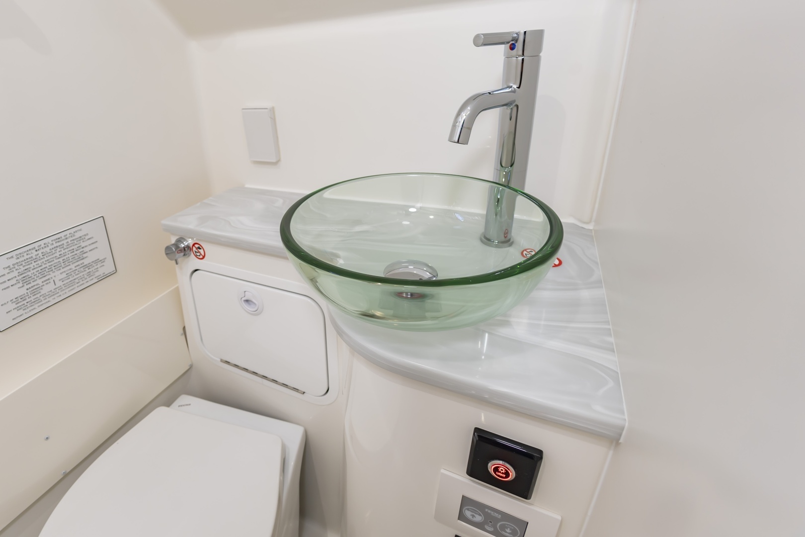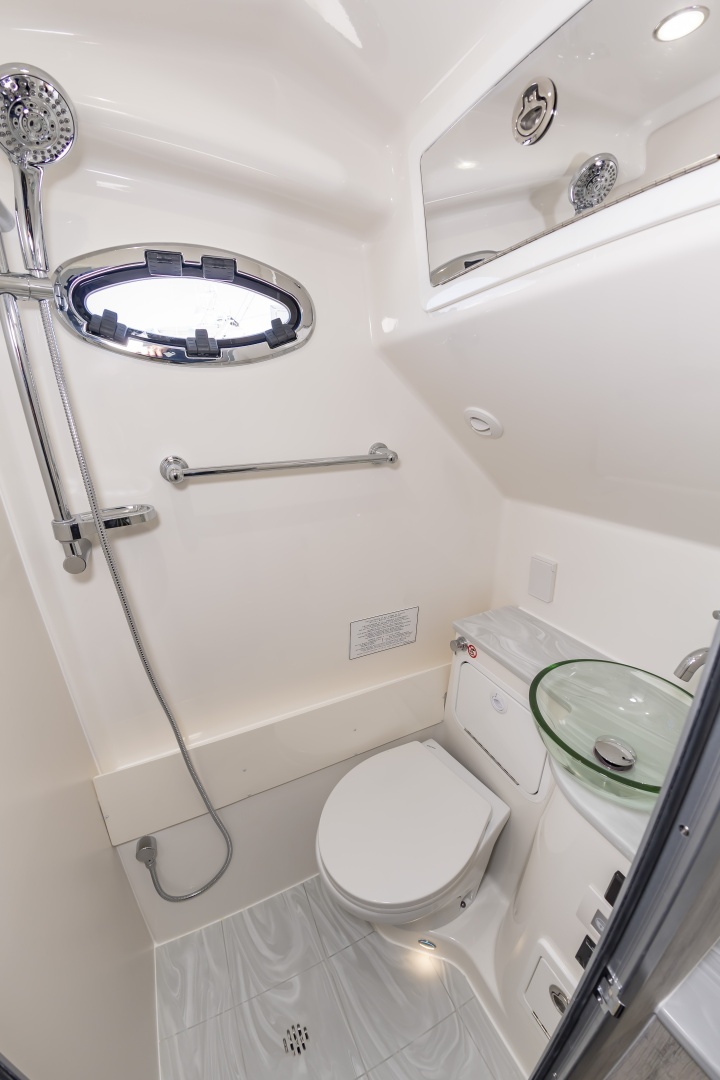 - Stand-Up Head Compartment with Solid Surface Countertop, Sink with Hot Water, Interior Lighting, and Mirror