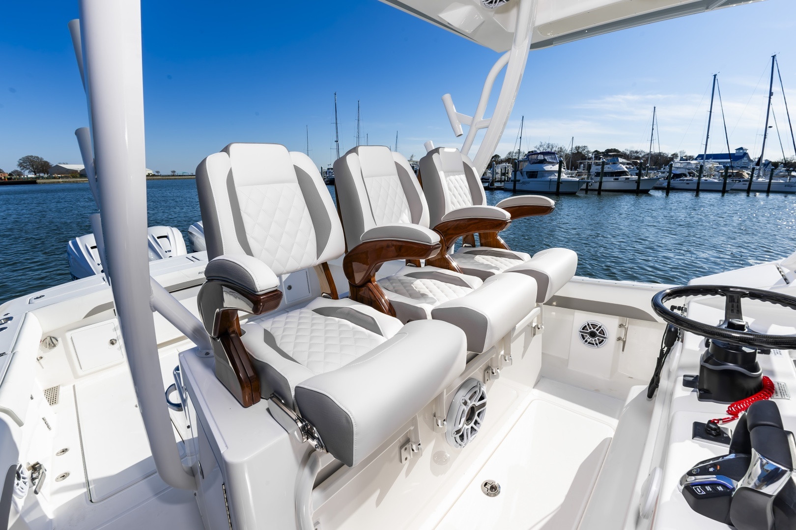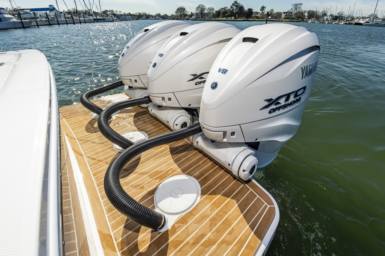 - Triple White Yamaha XTO Offshore® 450 4-Stroke Engines with DES Tilt Helm and DEC–Plus HelmMaster™ EX Joystick with Multimode Set Point™, EX Autopilot with Waypoint Deceleration, and Electronic Key Switch with Wireless Fob