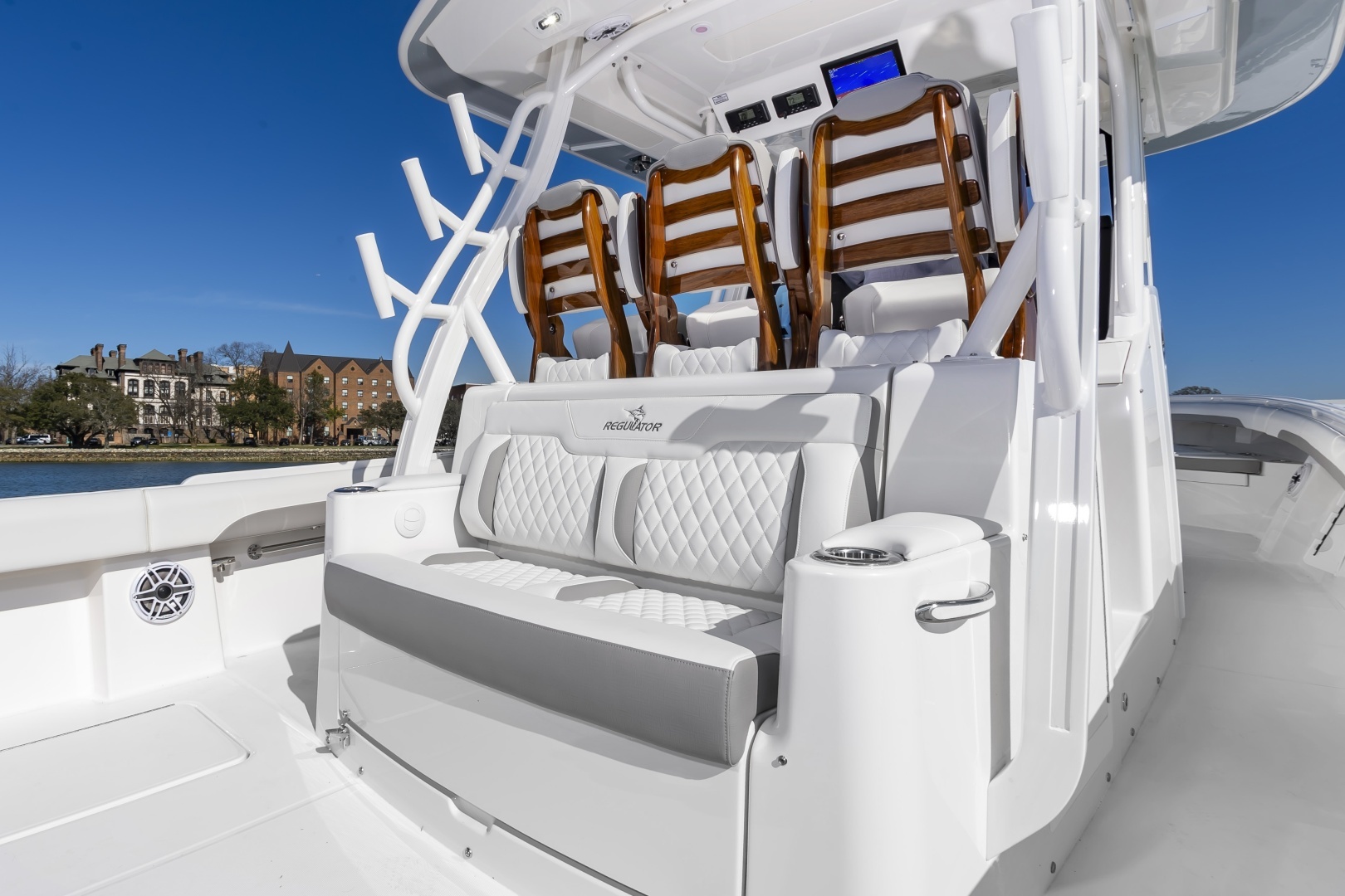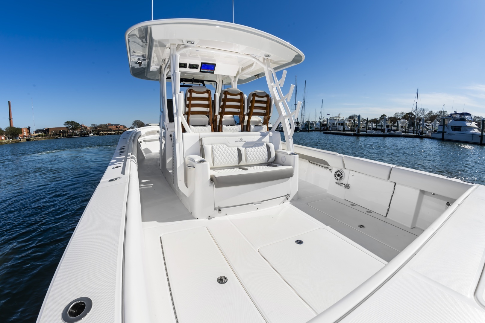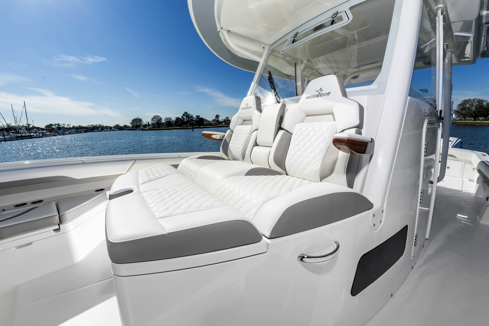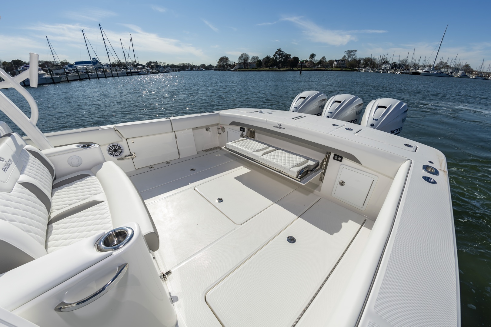 Experience offshore luxury and performance with this in‑stock 2026 Regulator 37, available now through Bluewater Yacht Sales. Powered by triple Yamaha 450s, this 37 delivers exhilarating power, premium handling, and exceptional fishability. The sleek White hull, matching White bracket with synthetic teak marine decking, and Black/Black/Black boot stripe give the boat a clean, commanding presence. Outfitted with Gemlux Bluewater outrigger bases paired with Lee's 22' carbon fiber poles, a contrasting T‑Top underside, and beautifully appointed Dove Gray diamond‑quilted upholstery, this build elevates both style and comfort. The helm is enhanced with teak ladder‑back chairs, upgraded armrests, an Edson Elite carbon wheel, and an advanced Garmin 37 Premium electronics suite, including open‑array radar, a second GPS display, dual VHF radios, inductive chargers, and a Sionyx Nightwave night‑vision camera. Entertainment is best‑in‑class with upgraded Fusion systems in both the cockpit and cabin, plus a Smart TV. Serious anglers will appreciate 10 forward gunwale rod holders, under‑gunwale storage, dual electric‑reel hookups, and a quick‑release gaff holder, while comfort features include Phender Pro cleats, bucket storage, and multi‑colored underwater LEDs. Complete with a forward sun shade, all‑weather enclosure, and matching canvas covers in Deep Gray, this Regulator 37 is turn‑key, stunningly equipped, and ready for open‑water adventure.