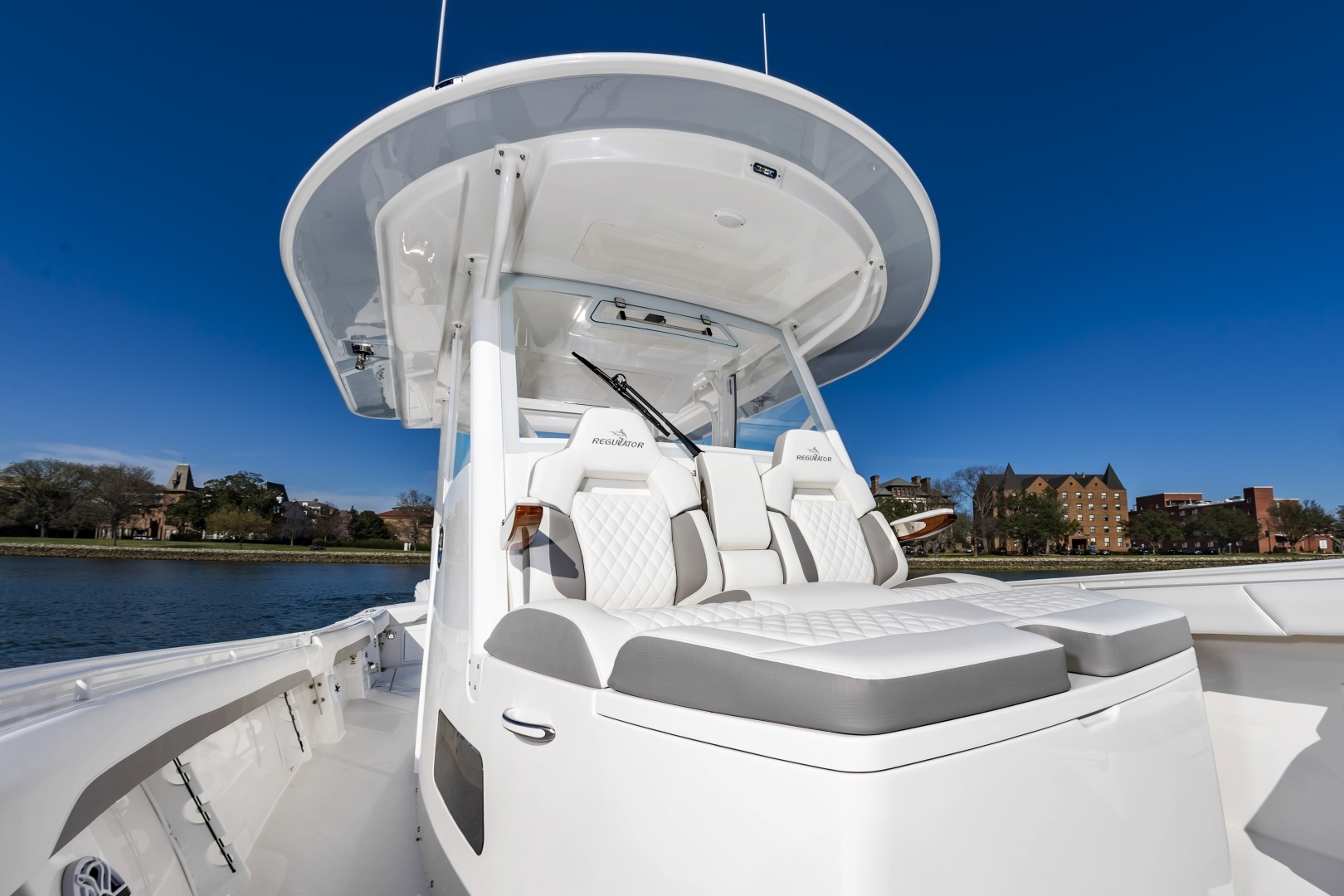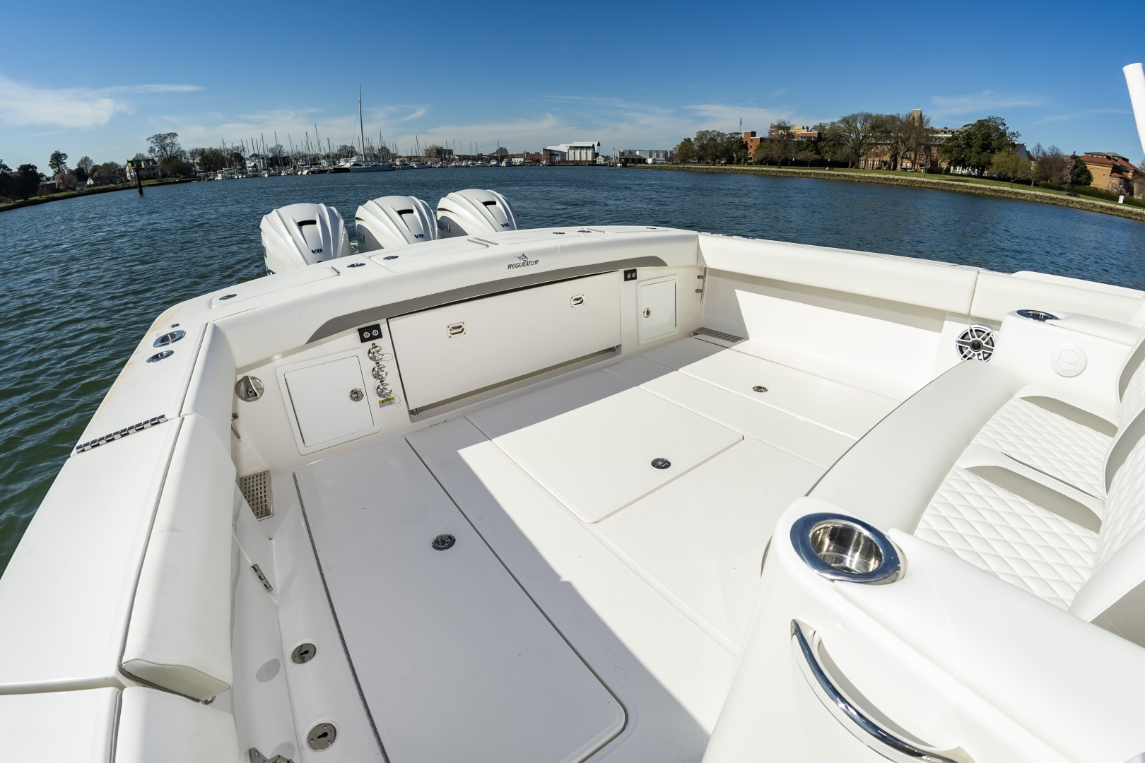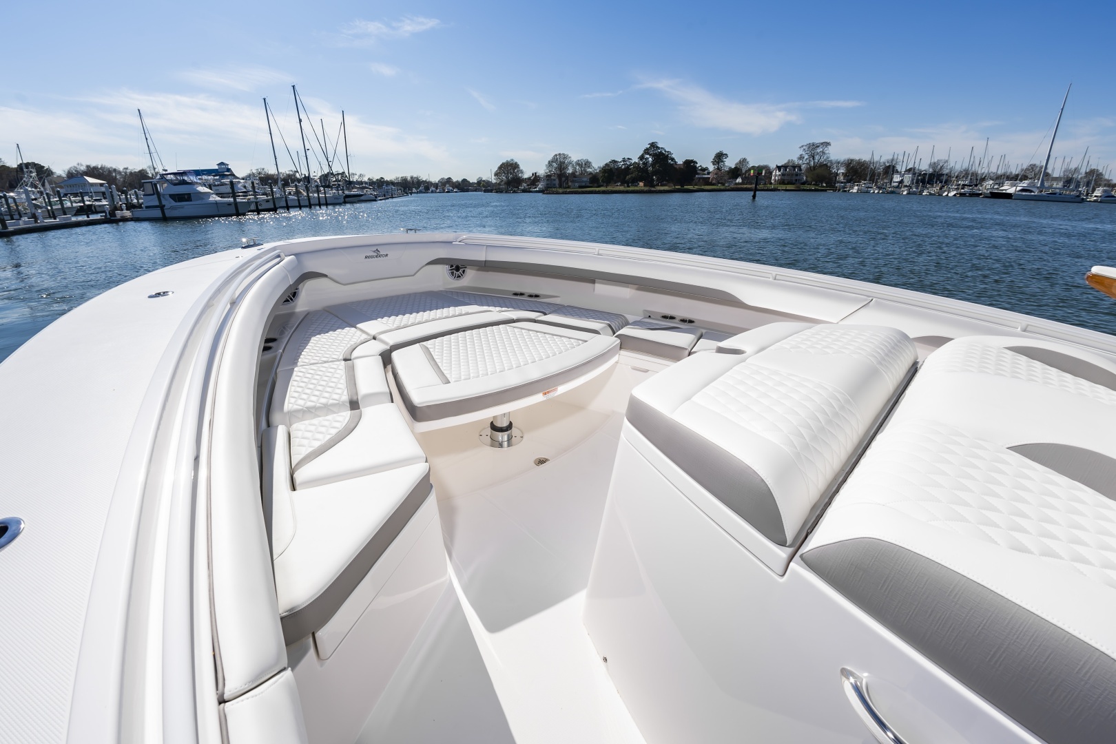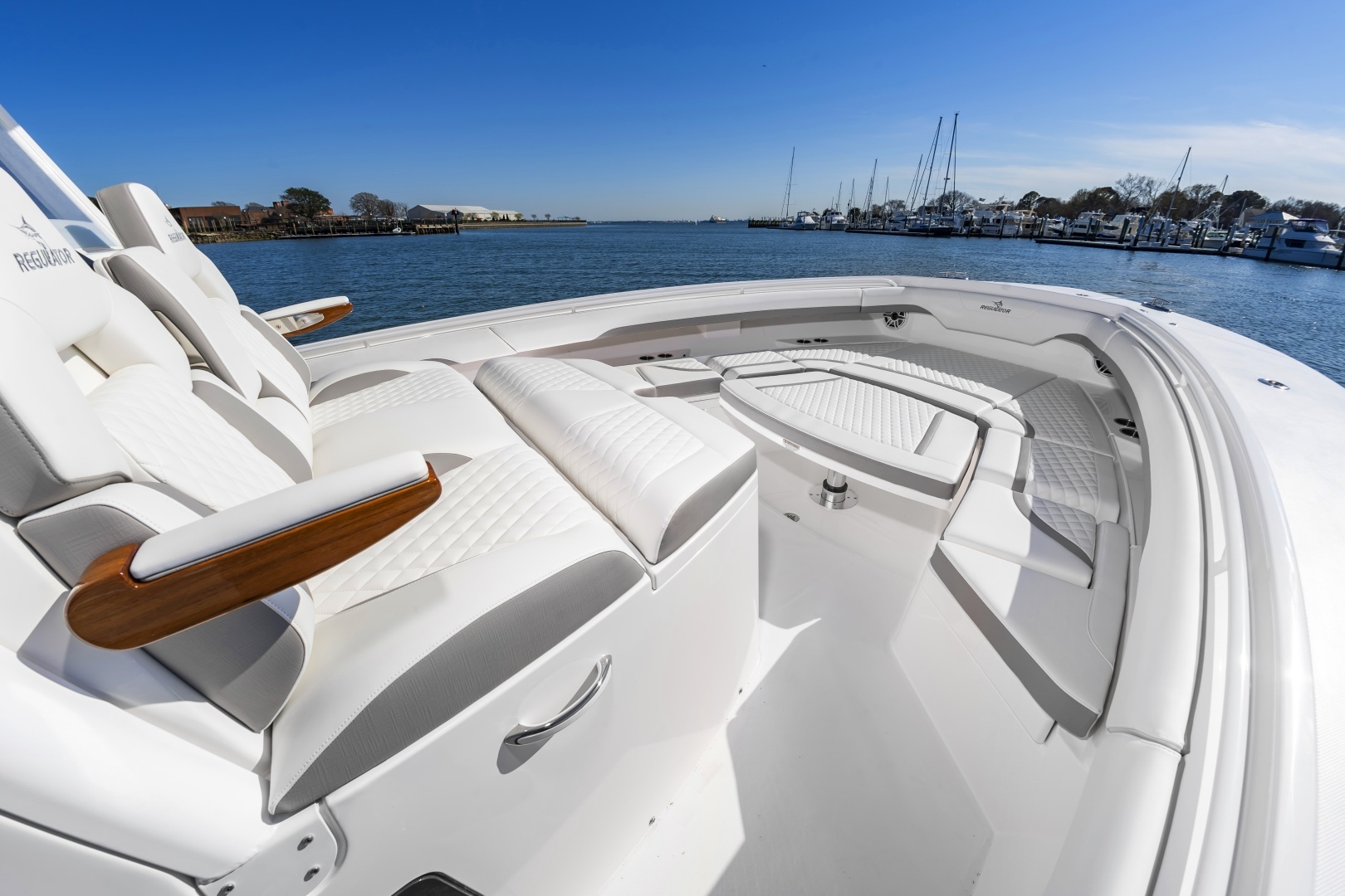 Experience offshore luxury and performance with this in‑stock 2026 Regulator 37, available now through Bluewater Yacht Sales. Powered by triple Yamaha 450s, this 37 delivers exhilarating power, premium handling, and exceptional fishability. The sleek White hull, matching White bracket with synthetic teak marine decking, and Black/Black/Black boot stripe give the boat a clean, commanding presence. Outfitted with Gemlux Bluewater outrigger bases paired with Lee's 22' carbon fiber poles, a contrasting T‑Top underside, and beautifully appointed Dove Gray diamond‑quilted upholstery, this build elevates both style and comfort. The helm is enhanced with teak ladder‑back chairs, upgraded armrests, an Edson Elite carbon wheel, and an advanced Garmin 37 Premium electronics suite, including open‑array radar, a second GPS display, dual VHF radios, inductive chargers, and a Sionyx Nightwave night‑vision camera. Entertainment is best‑in‑class with upgraded Fusion systems in both the cockpit and cabin, plus a Smart TV. Serious anglers will appreciate 10 forward gunwale rod holders, under‑gunwale storage, dual electric‑reel hookups, and a quick‑release gaff holder, while comfort features include Phender Pro cleats, bucket storage, and multi‑colored underwater LEDs. Complete with a forward sun shade, all‑weather enclosure, and matching canvas covers in Deep Gray, this Regulator 37 is turn‑key, stunningly equipped, and ready for open‑water adventure.