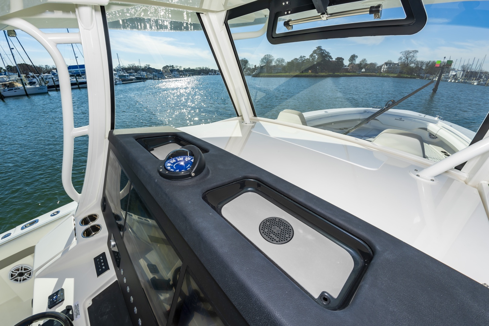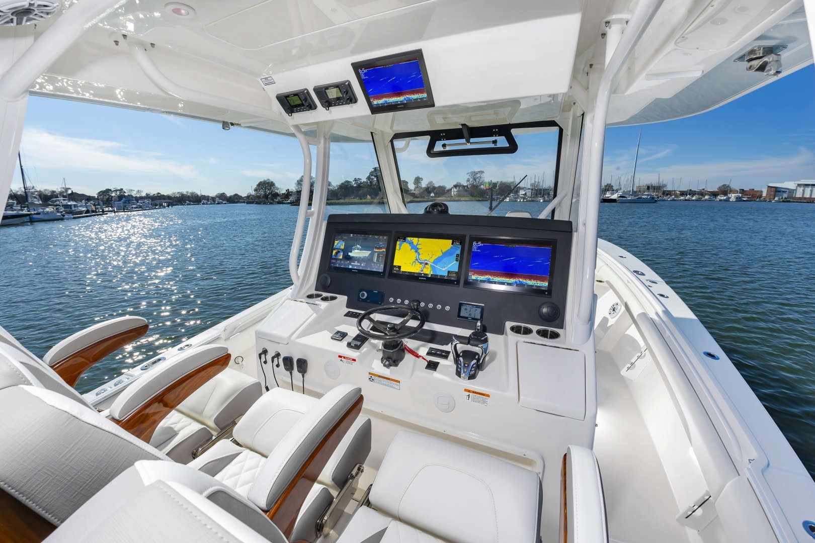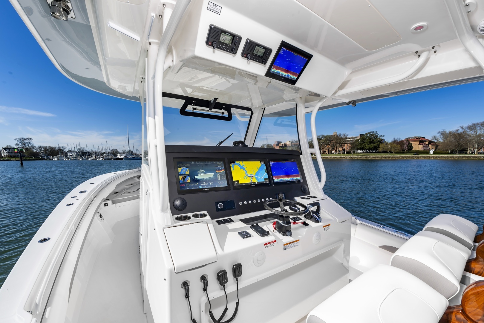 - Factory-Installed Garmin® Offshore 37 Package: Dual 22’’ GPSMAP® 9022 Multi-Touch Widescreen Chartplotter/Sonar Displays, VHF 215 AIS Radio with Dual 8’ Antennas, GMR™ 424 xHD 4kW Open-Array Radar, Airmar® B275LHW with Wide Beam 1kW CHIRP Transducer, and Yamaha EX Autopilot, Plus Black Flushmount Electronics Face and Remote Mic