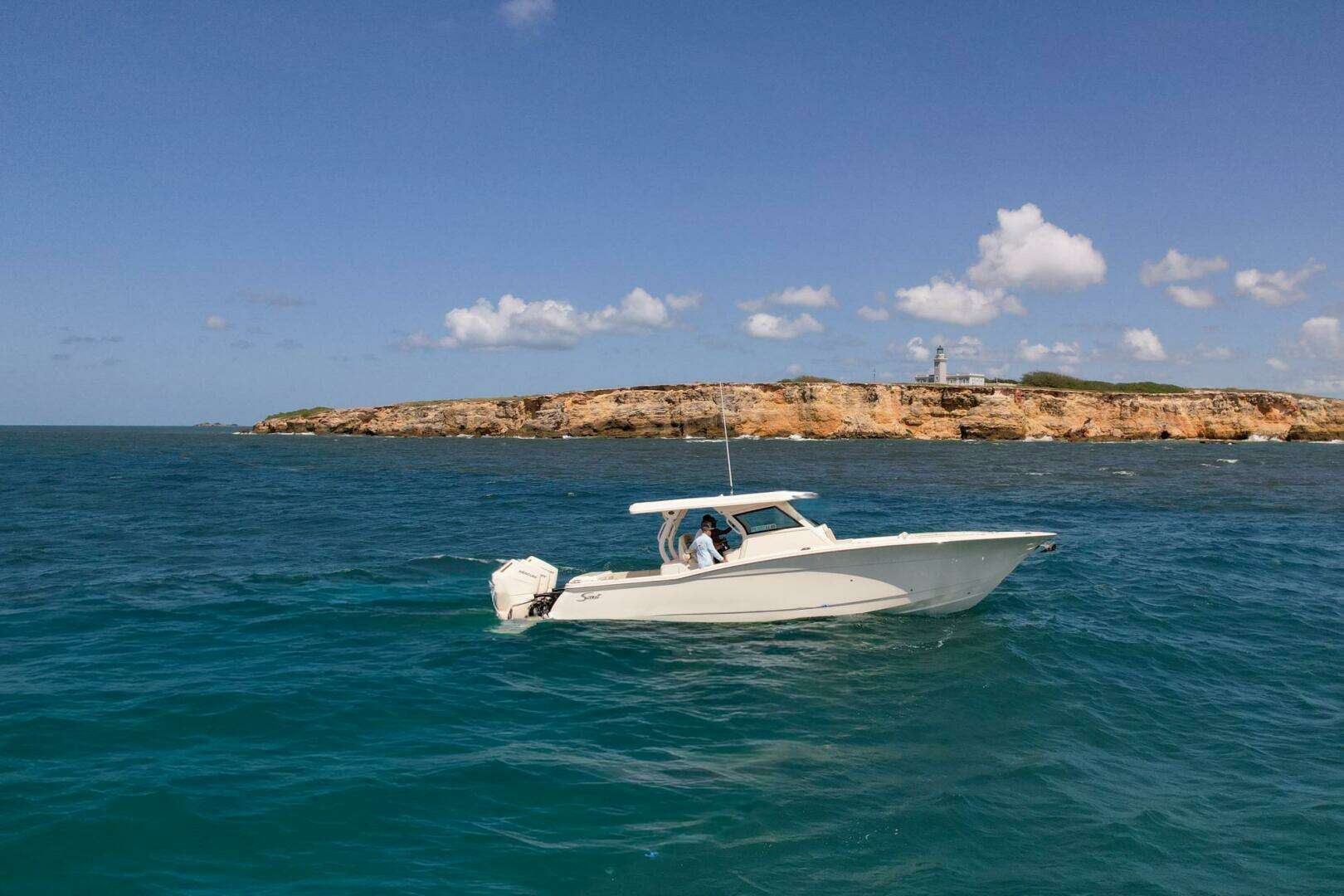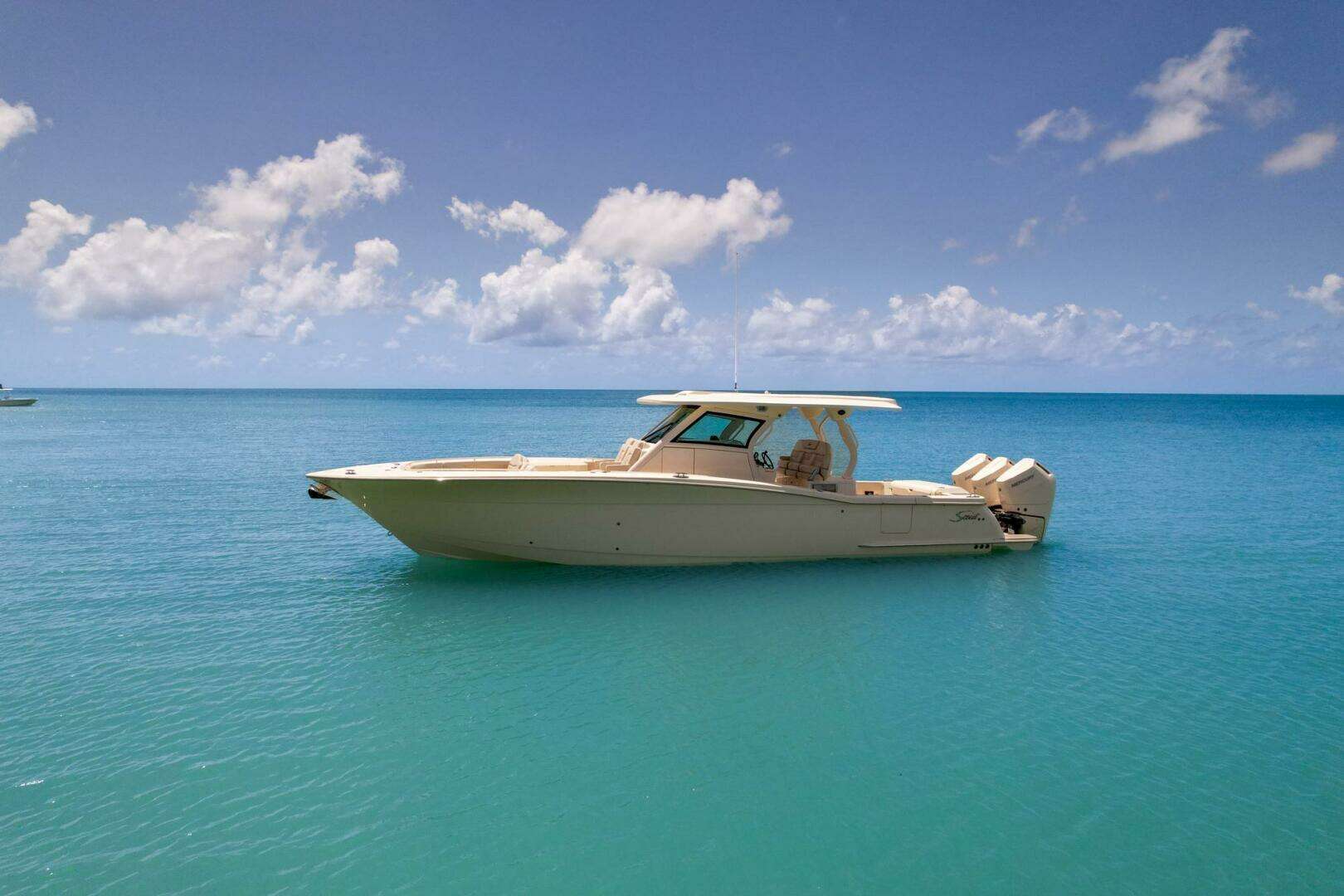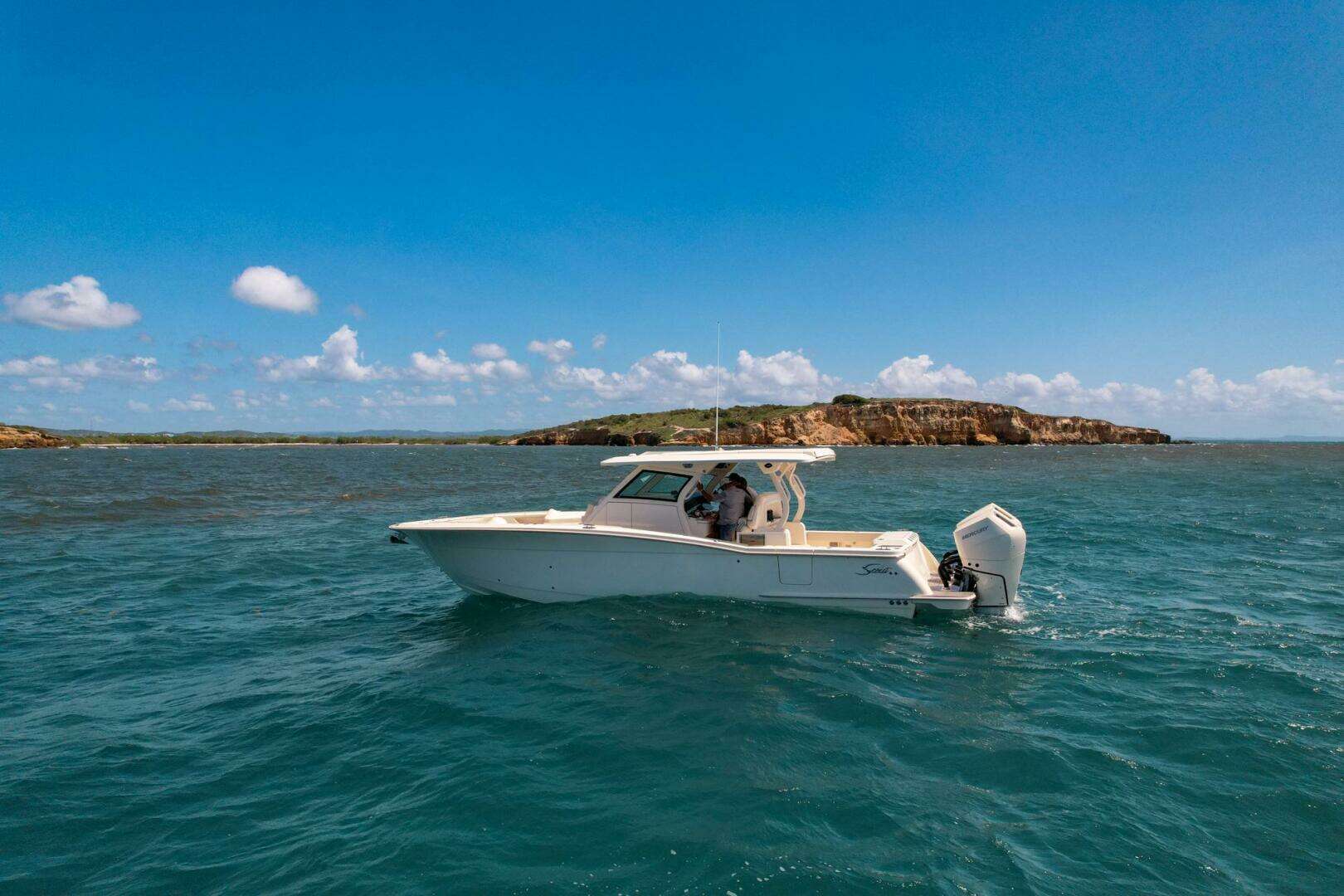 Loaded with Scout innovation, this model has a lithium ion battery with battery management system (no generator necessary); port-side swing-in boarding door with ladder; double sun deck lounge with cushions, armrests and underside storage forward of the console; key fob remote controlled lights; spacious cabin down below and an enclosed head with a porcelain vessel sink with Corian vanity and mirror; marine head with electric overboard discharge with an 11 gallon holding tank; 120V air conditioning & heat in the cabin and at the helm; and so much more. Upgrade your experience out on the water with an optional summer kitchen complete with grill, sink, cutting board, manual slide-out cooler, seat cushion and bolster; and your choice of upholstery color package.