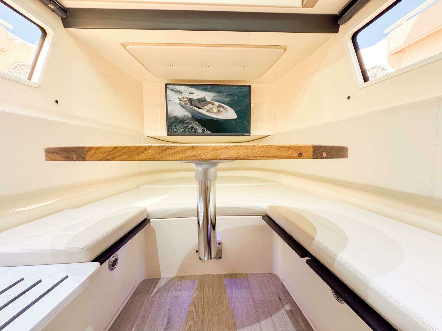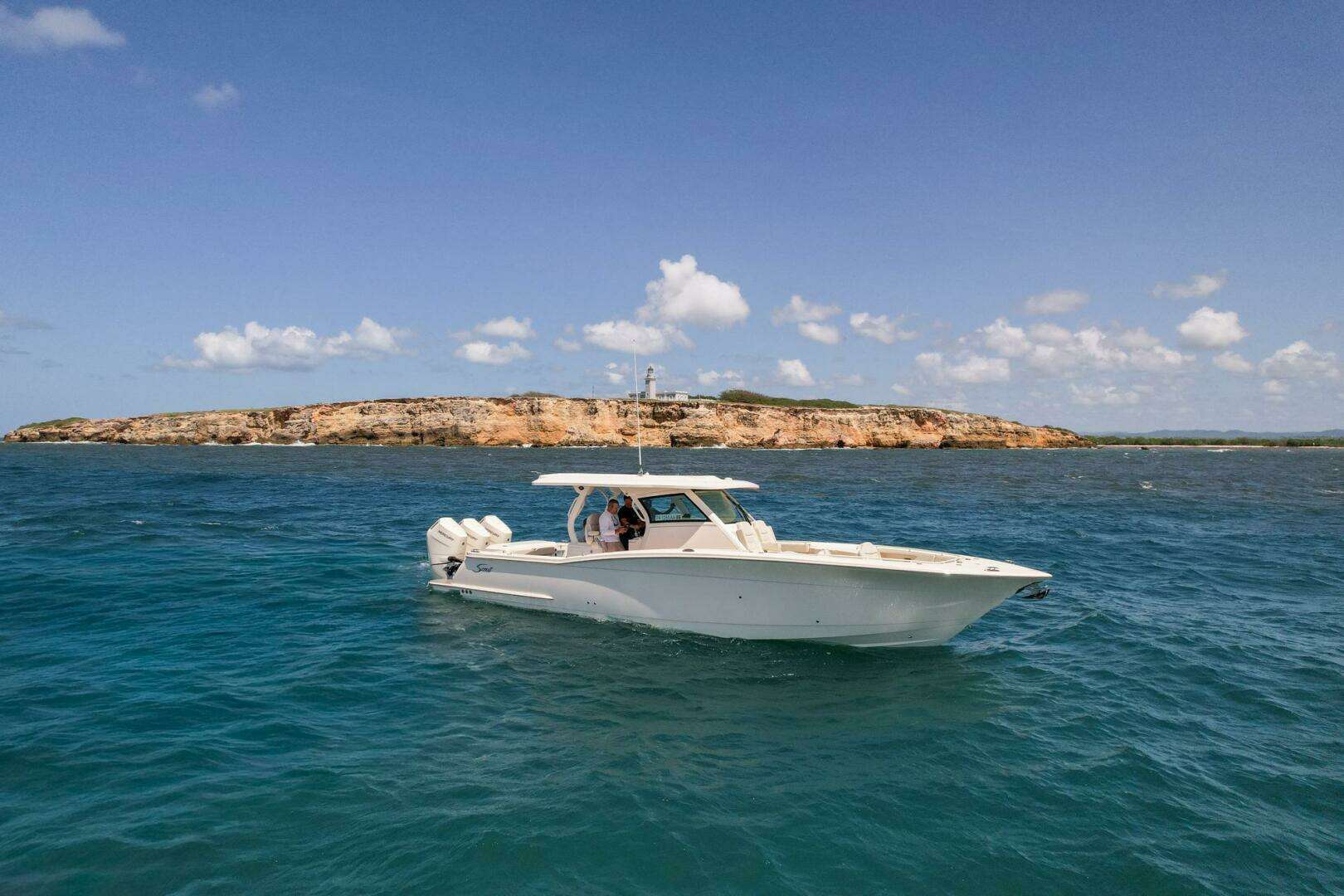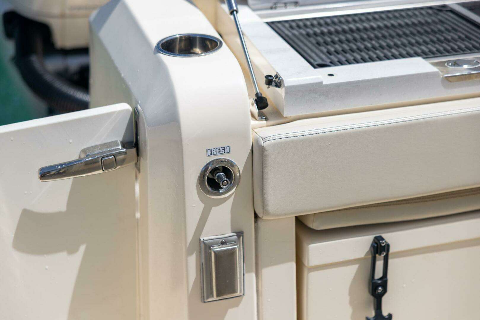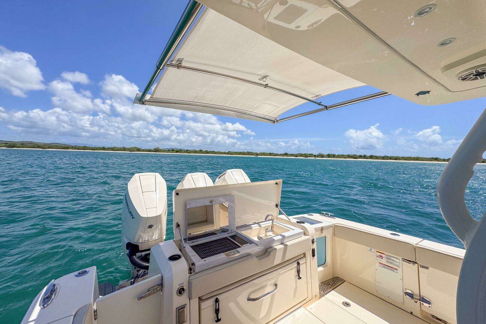 Loaded with Scout innovation, this model has a lithium ion battery with battery management system (no generator necessary); port-side swing-in boarding door with ladder; double sun deck lounge with cushions, armrests and underside storage forward of the console; key fob remote controlled lights; spacious cabin down below and an enclosed head with a porcelain vessel sink with Corian vanity and mirror; marine head with electric overboard discharge with an 11 gallon holding tank; 120V air conditioning & heat in the cabin and at the helm; and so much more. Upgrade your experience out on the water with an optional summer kitchen complete with grill, sink, cutting board, manual slide-out cooler, seat cushion and bolster; and your choice of upholstery color package.