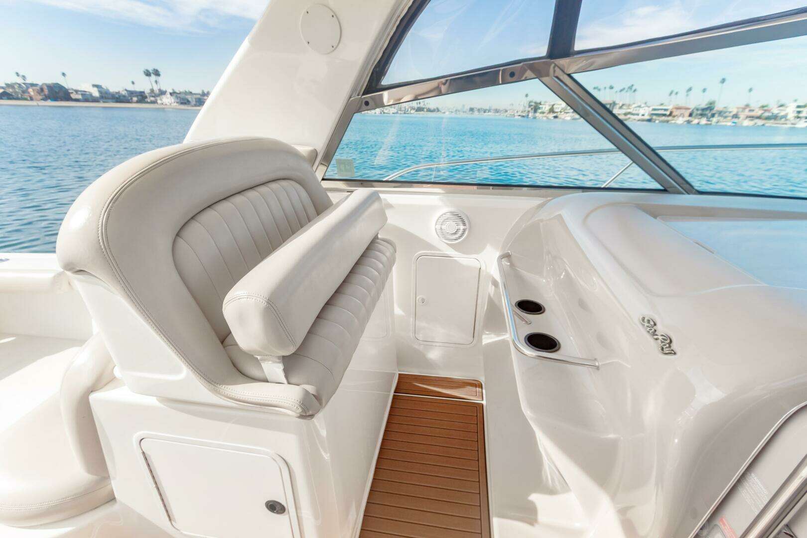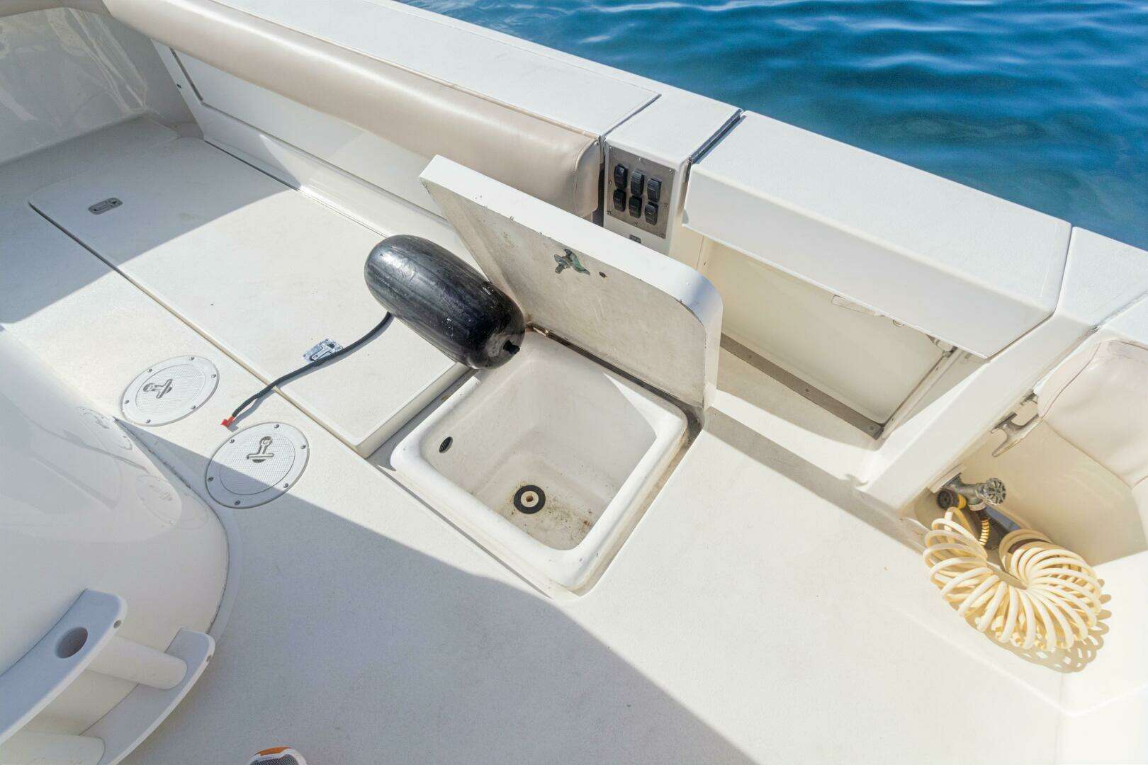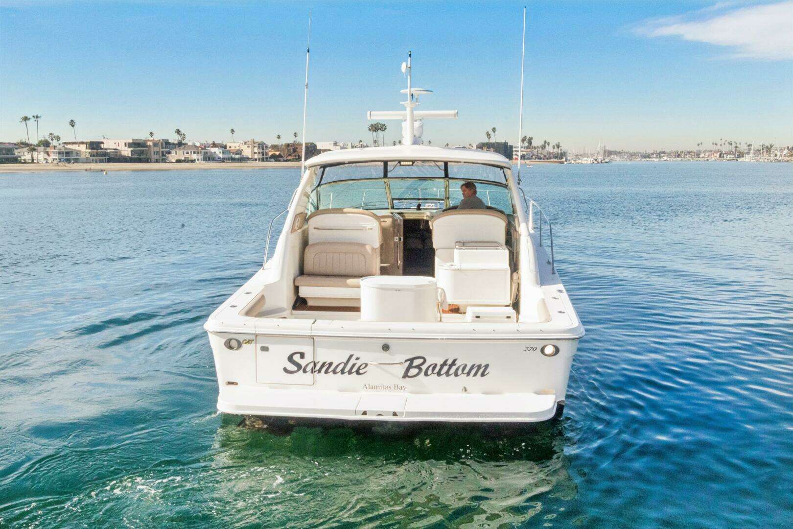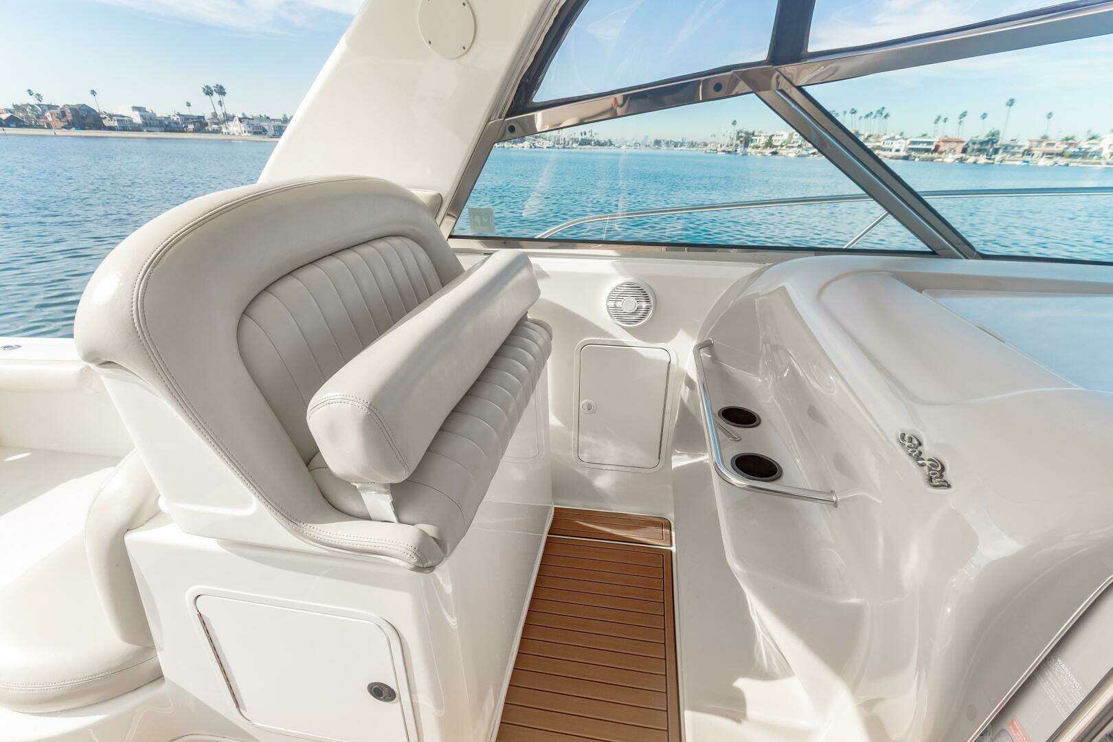 The 370 Express Cruiser was an effort by Sea Ray to develop a serious, tournament-level fishing boat. She is a top-quality express with a big, well-designed cockpit and a lavish, family-friendly interior. Not inexpensive, the Sea Ray 370 is a big boat thanks to her wide 14-foot, 2-inch beam. The cockpit offers lots of space for fishing, and there’s plenty of room for a fighting chair or for storing loose gear such as coolers. A bait prep center with sink is positioned for easy access, and a pair of lift-out fish boxes were standard. The 370’s machinery space is reached via a centerline hatch, and for complete access the bridge sole can be raised at the push of a button. Below, the plush interior will sleep four with a double berth in the private bow stateroom, and a lounge to starboard that pulls out into a double berth. Additional features include rod storage beneath the cabin sole, a fold-up transom seat, prop pockets, and a fully cored hull.