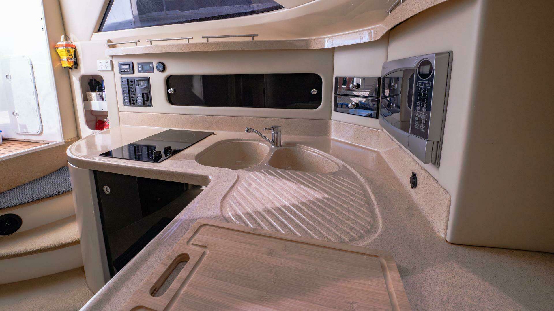 The interior is light and welcoming, featuring two double berths and a single, along with a fully equipped saloon galley including fridge/freezer, ceramic sink, 2-burner cooktop and microwave. Additional refrigeration is located on the sports bridge. Two showers, a new electric head, ducted air conditioning and heating (powered by a Fischer Panda 4000i generator with only 50 hours) provide onboard comfort. Four new 200Ah house batteries (2024) support extended cruising.