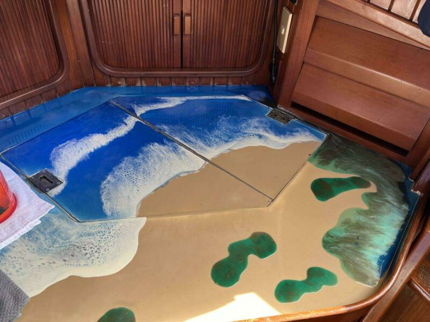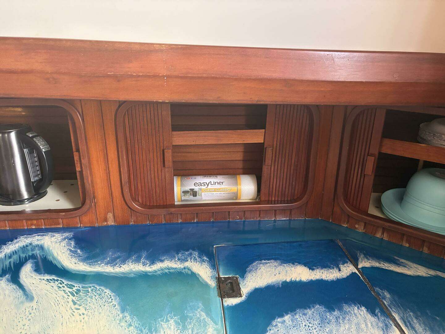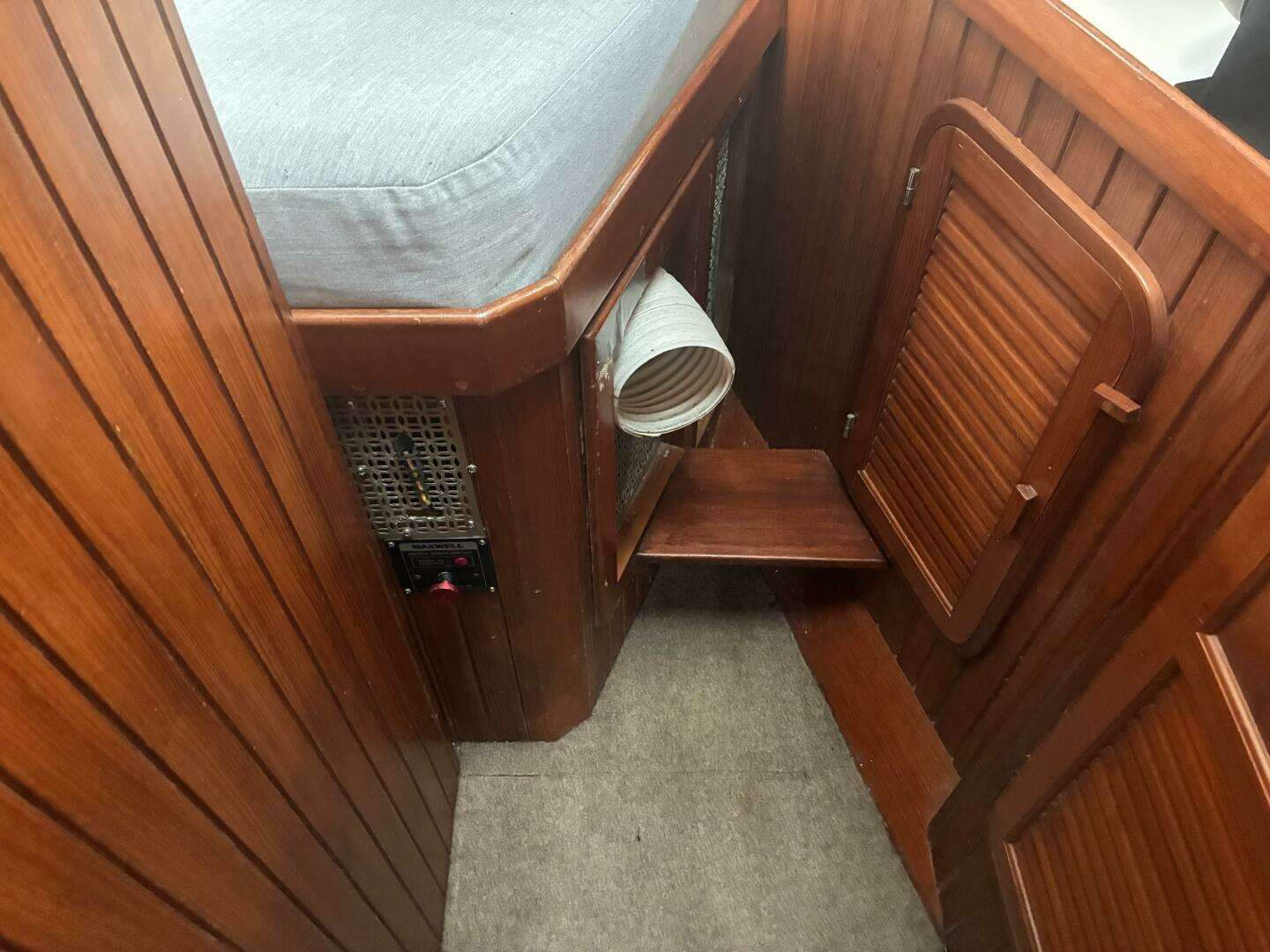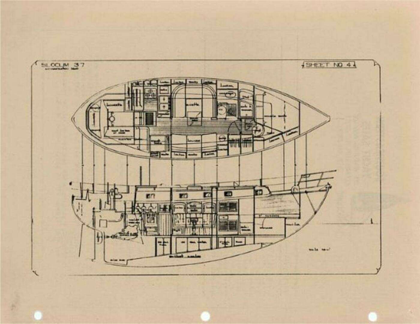 Designed with both strength and practicality in mind, the Slocum 37 measures 37 feet overall with a generous 11’8” beam and a 6-foot draft. The hull features heavy displacement and a refined “S”-shaped section, providing a comfortable motion at sea and excellent directional stability. The hull form incorporates an easy turn of the bilge and relatively full garboards, allowing for substantial fuel and water tankage beneath the cabin sole while also accommodating a properly aligned engine installation. The result is a vessel well suited for extended cruising with the storage capacity and structural integrity demanded by offshore sailors.