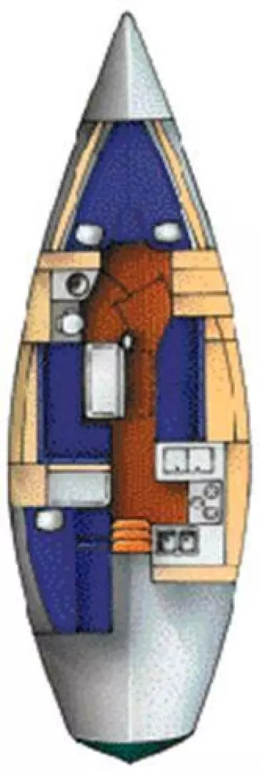 In the forepeak, the two single berths can be converted into a double with an insert. Moving further back the head is to port and has a integral shower, the arrangement is tight but functional. In the salon the settees are offset, the starboard one serves well as a sea-going berth and the port settee can be converted into a double. Further aft on port is the nav-station next to the companionway and a double quarter-berth, something of a luxury in a boat this size. Opposite is a functional U-shaped galley.